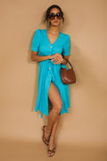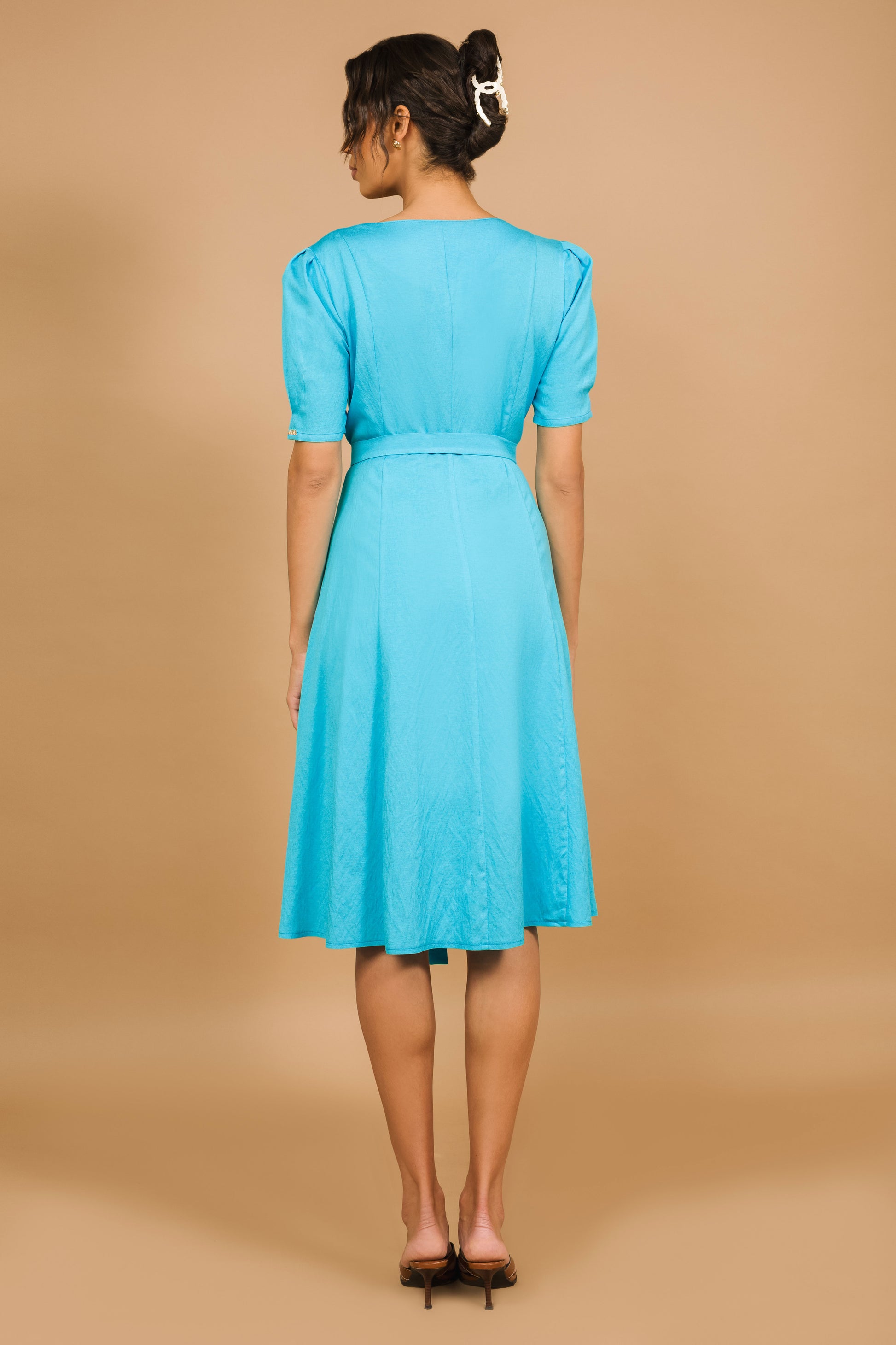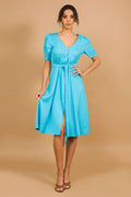A karcsúsított szabás, a dekoratív gombok és a megkötős derékrész teszi az AMNESIA Lupita ruhát nőies és sokoldalú darabbá. Len anyagból készült, pöttyös mintával és egyszínű türkiz változatban is elérhető – viseld szandállal a hétköznapokra vagy egy blézerrel a hűvösebb napokon. Szerezd be az amnesia.hu webshopon, amíg kapható!