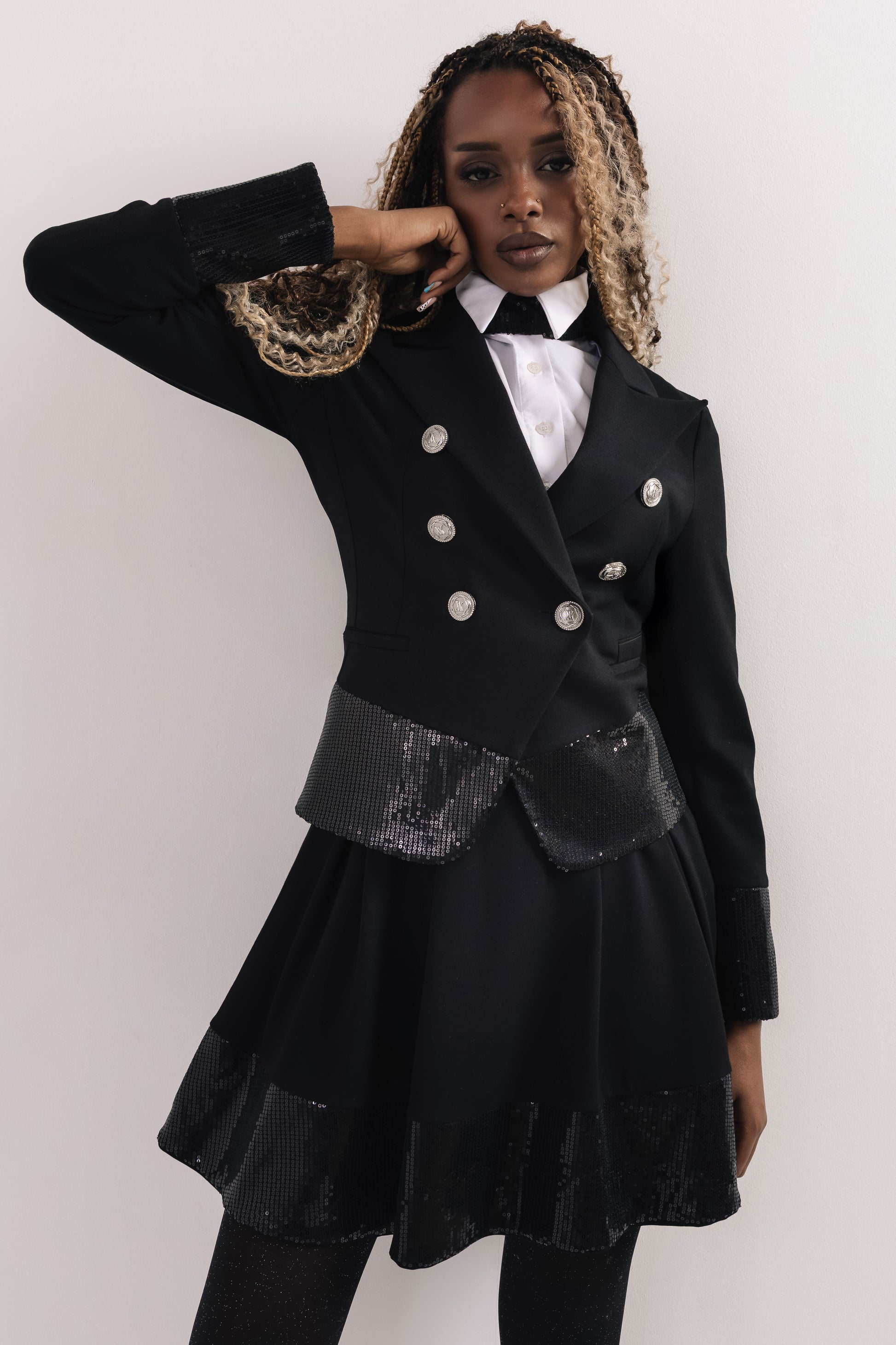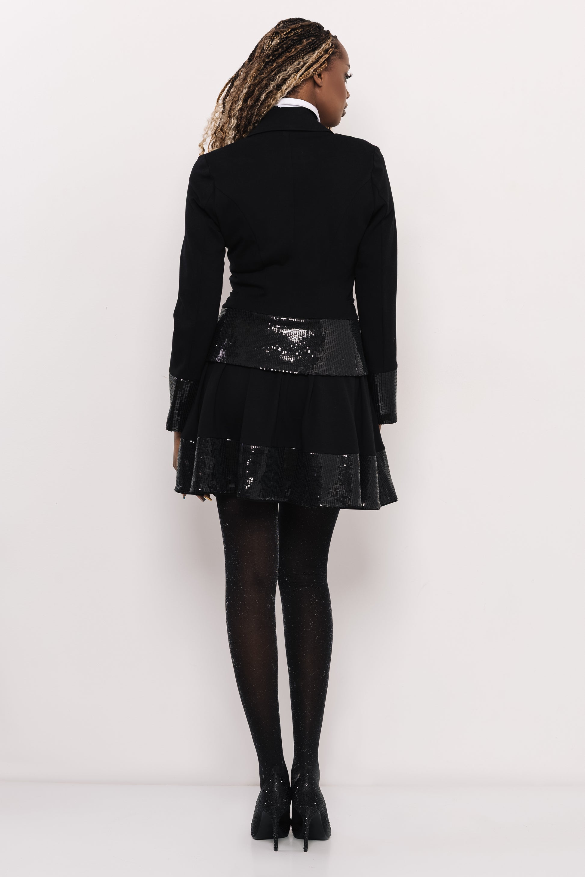 Az AMNESIA Flitter zakó igazán különleges darab: elegáns, nőies, pont olyan, amit szívesen veszel fel, ha egy kicsit jobban szeretnéd odatenni magad. A fekete alapot a csillogó flitterek és a jellegzetes gombsor teszi izgalmassá, miközben a fazon nőies és letisztult marad. Punto anyagból készül, így kényelmes viselet, a karcsúsított szabás szép alakot rajzol, az alsó részen lévő flitterpanel pedig finoman követi a mozgást. Nem túl merev, de tartja a formáját, ezért napközben és esti programokon is jól érzed magad benne. Fekete színben érkezik, így sokféle szettel kombinálható. Viseld egyszerű toppal és nadrággal az irodába, vagy vedd fel az AMNESIA Daro szoknyával és magas sarkúval egy esti programra. Ha egy olyan zakót keresel, amit mindig örömmel viselsz, válaszd a Flitter zakót az amnesia.hu webshopon.
