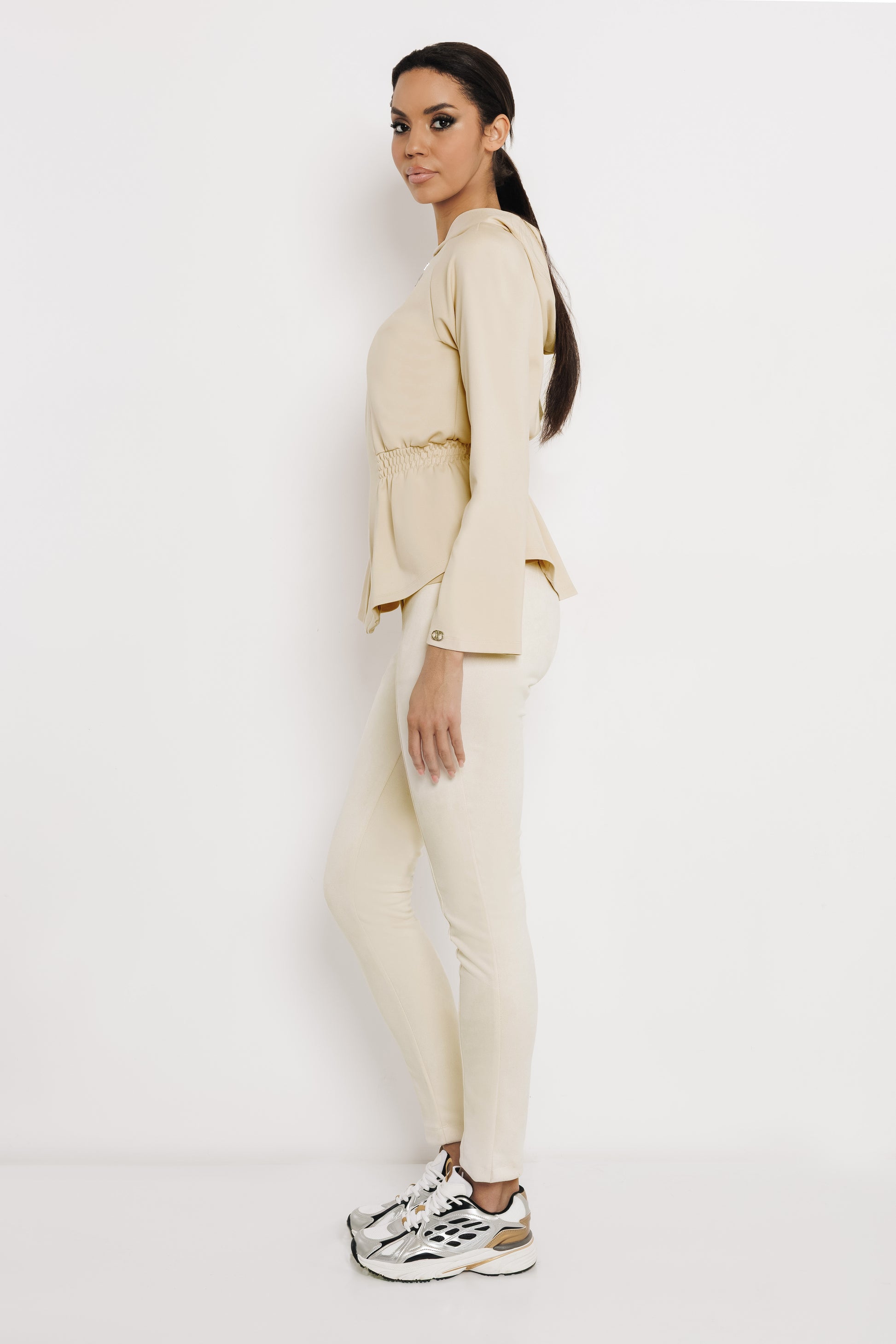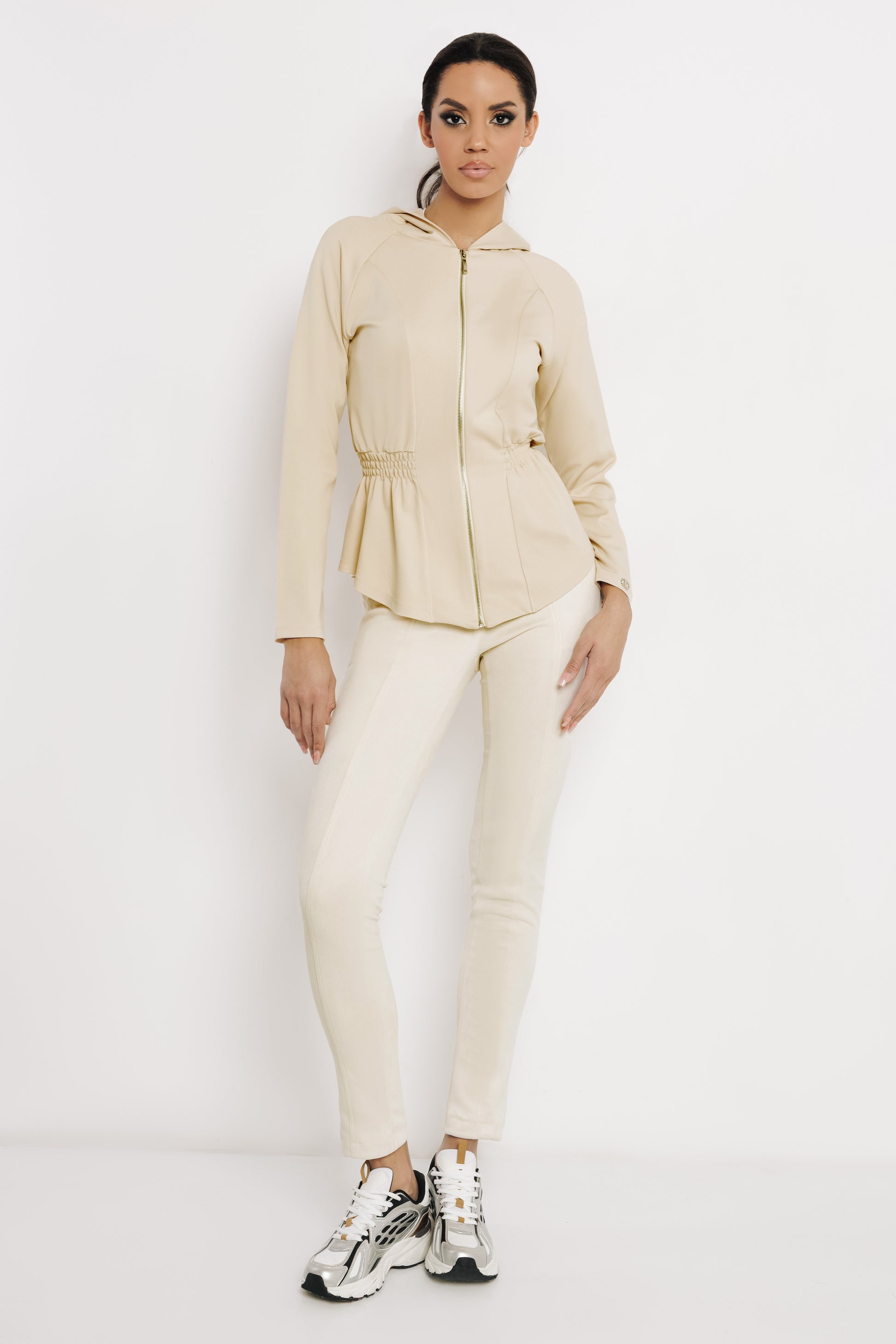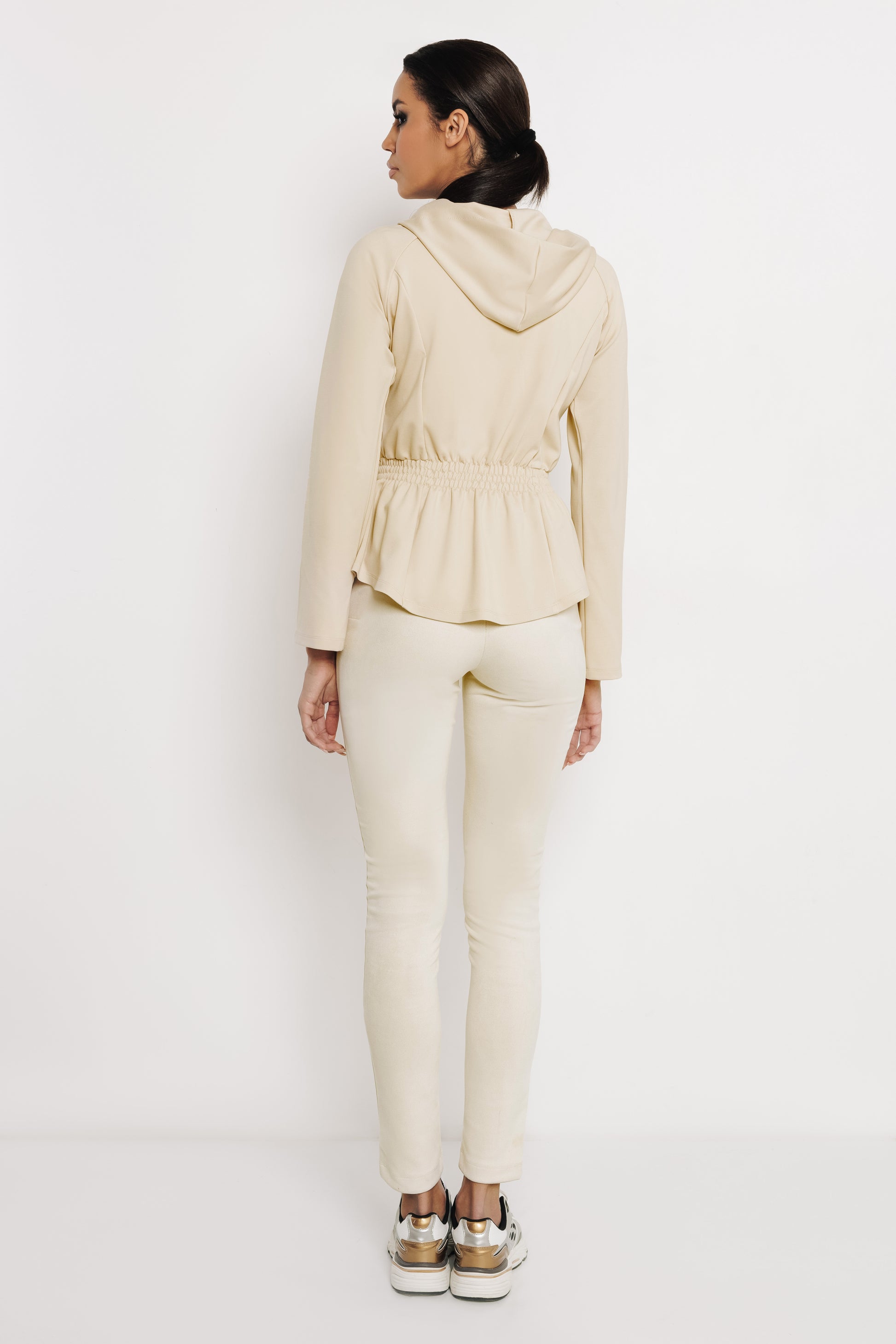 Az AMNESIA Jella kardigán sportos, mégis nőies darab, amely jól beilleszthető a ruhatárba. A cipzár és a kapucni sportos hangulatot ad, miközben a deréknál enyhén szűkített szabás szépen követi az alakot. Olyan felső, amely önállóan is megállja a helyét. A tartuffino anyag rugalmas, kellemes tapintású és jól tartja a formáját. A derékrészen kialakított húzott rész finoman kiemeli a vonalakat, a fém cipzár visszafogott részletet ad. Egyméretben készül, fekete és bézs színben. Viselheted hozzá illő nadrággal egységes szettként, de farmerrel vagy szűkített nadrággal is jól működik. Sportcipővel hétköznapi viselet, magassarkúval letisztultabb irányba vihető, így munkába és városi programokra is megfelelő.