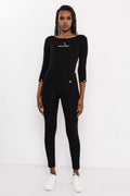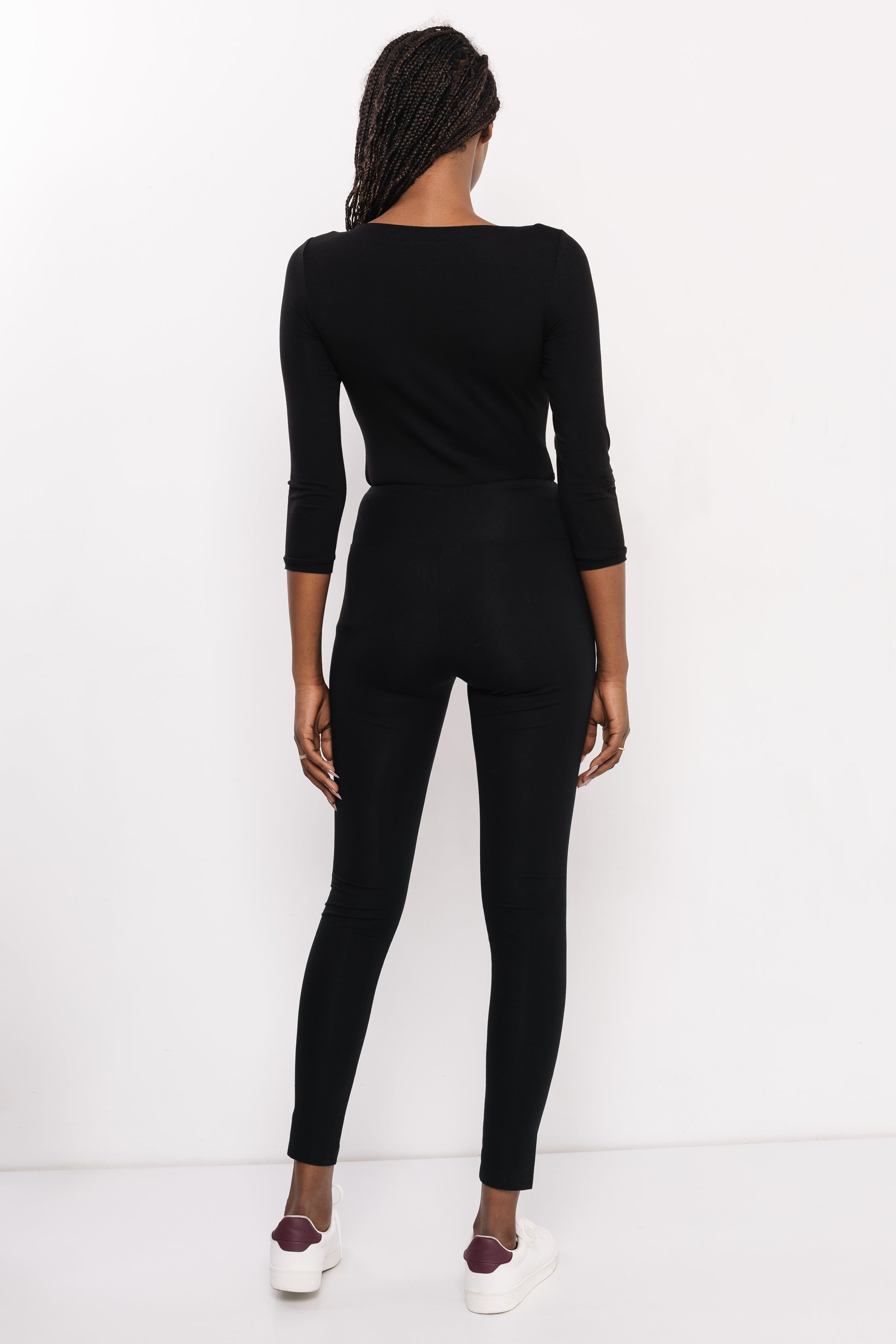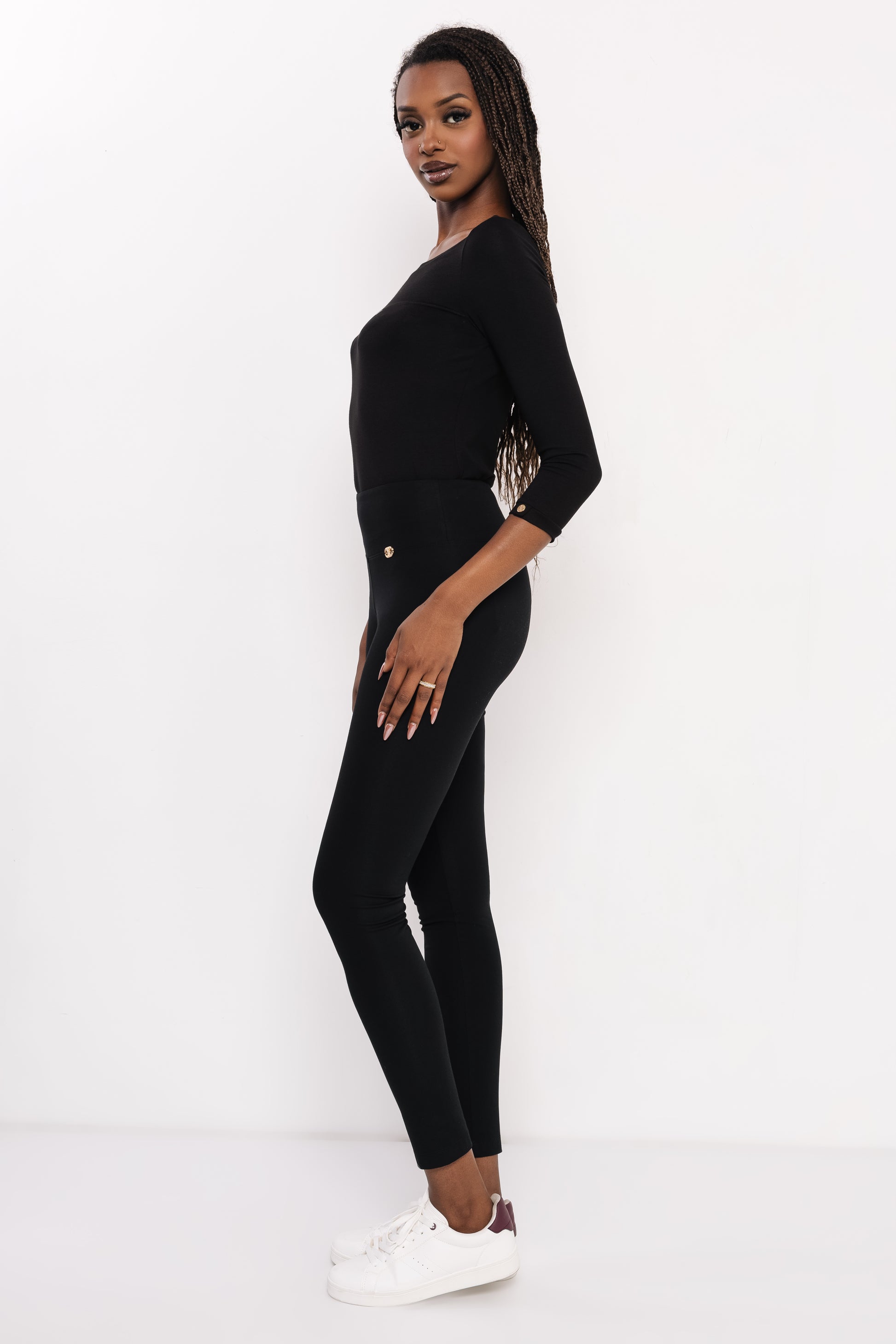 Az AMNESIA Vica nadrág az a darab, amely tökéletesen ötvözi a sportos vonalvezetést a nőies eleganciával. A fekete punto anyag rugalmasan követi a test vonalát, miközben biztos tartást és kényelmet nyújt a mindennapokban. A magas derekú, letisztult fazon és a szűkített szár optikailag nyújtja az alakot, míg az apró, arany részlet finom luxusérzetet kölcsönöz neki.