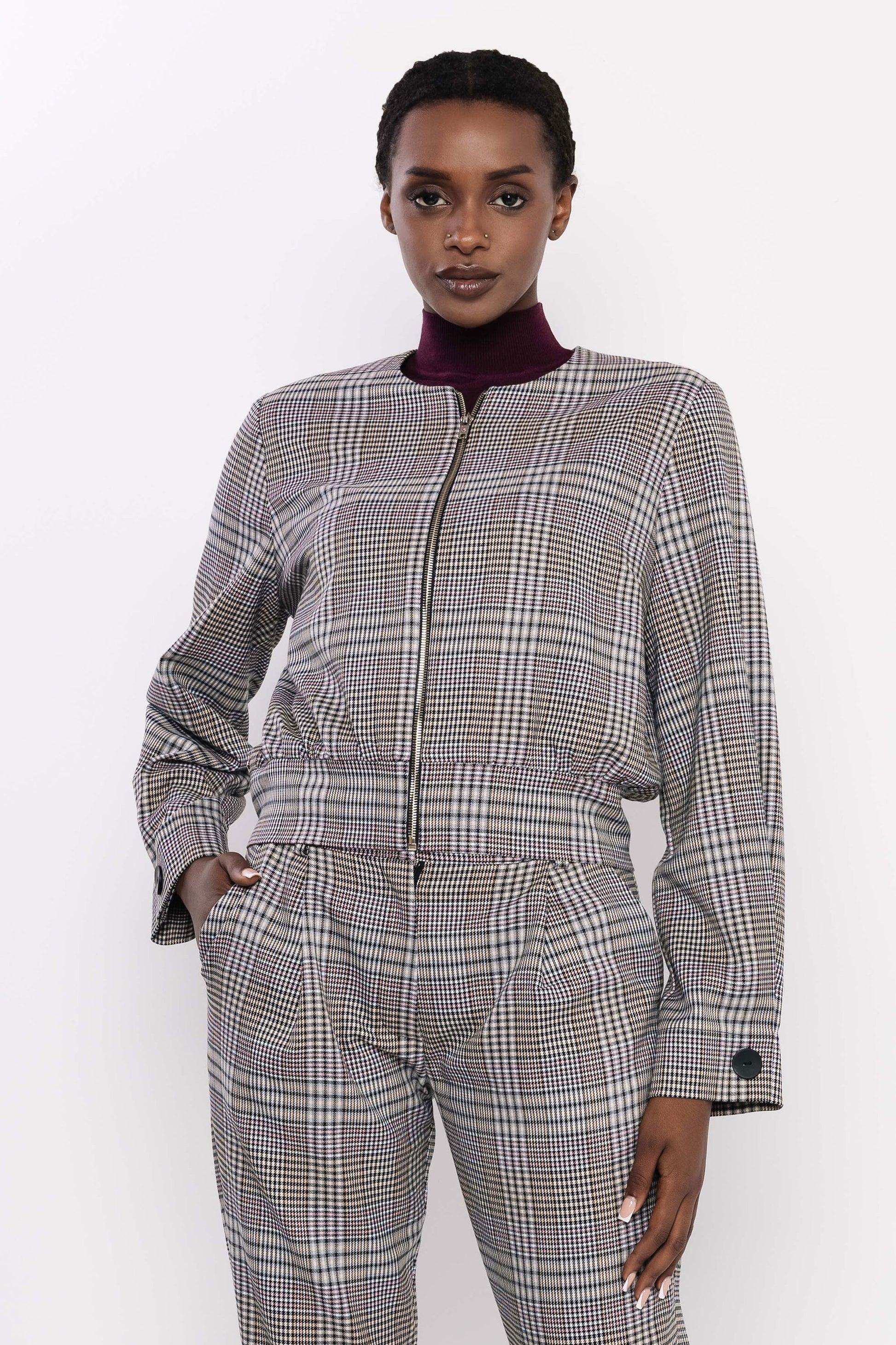 Az AMNESIA Lekon dzseki a klasszikus kockás mintát modern, letisztult szabásvonallal ötvözi. Rövid, derékban gumírozott fazonja szépen formálja az alakot, miközben a strukturált vállrész és a mandzsettás ujjak eleganciát adnak neki. A kerek nyakkivágás és a gallér nélküli kialakítás trendi megjelenést kölcsönöz. Puha, minőségi szövetből készült, amely tartást ad, de kellemes viselet marad egész napra. A cipzáras záródás és a letisztult részletek visszafogott, de karakteres hatást keltenek — ez a dzseki igazi alapdarab, amely sosem megy ki a divatból. Viseld az AMNESIA Jozefa nadrággal teljes szettként az elegáns, összehangolt megjelenésért, vagy kombináld farmerrel és magas sarkúval egy lezserebb, mégis nőies outfithez. Tedd kosárba az amnesia.hu webshopon, és frissítsd vele az őszi stílusod egy pillanat alatt!