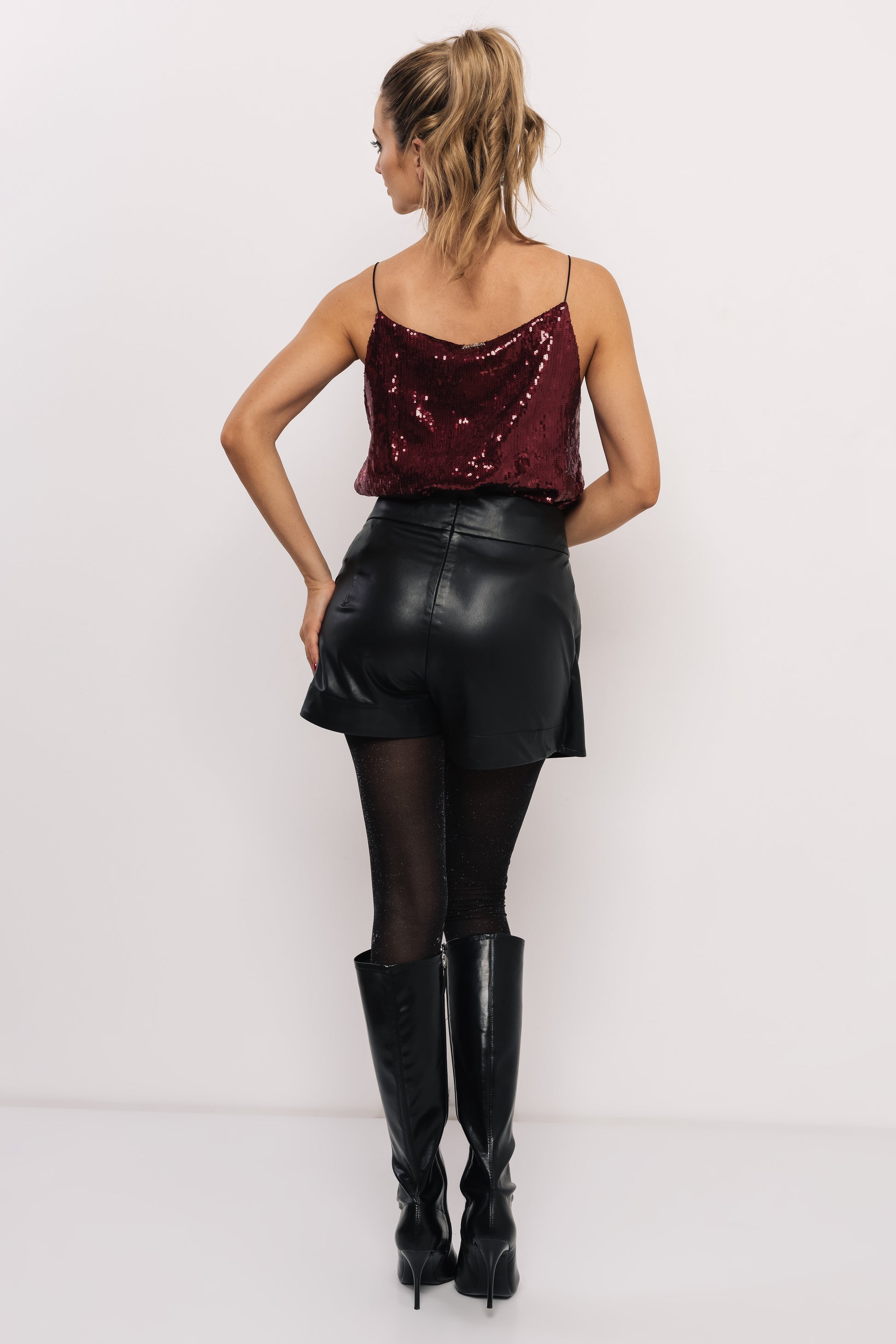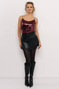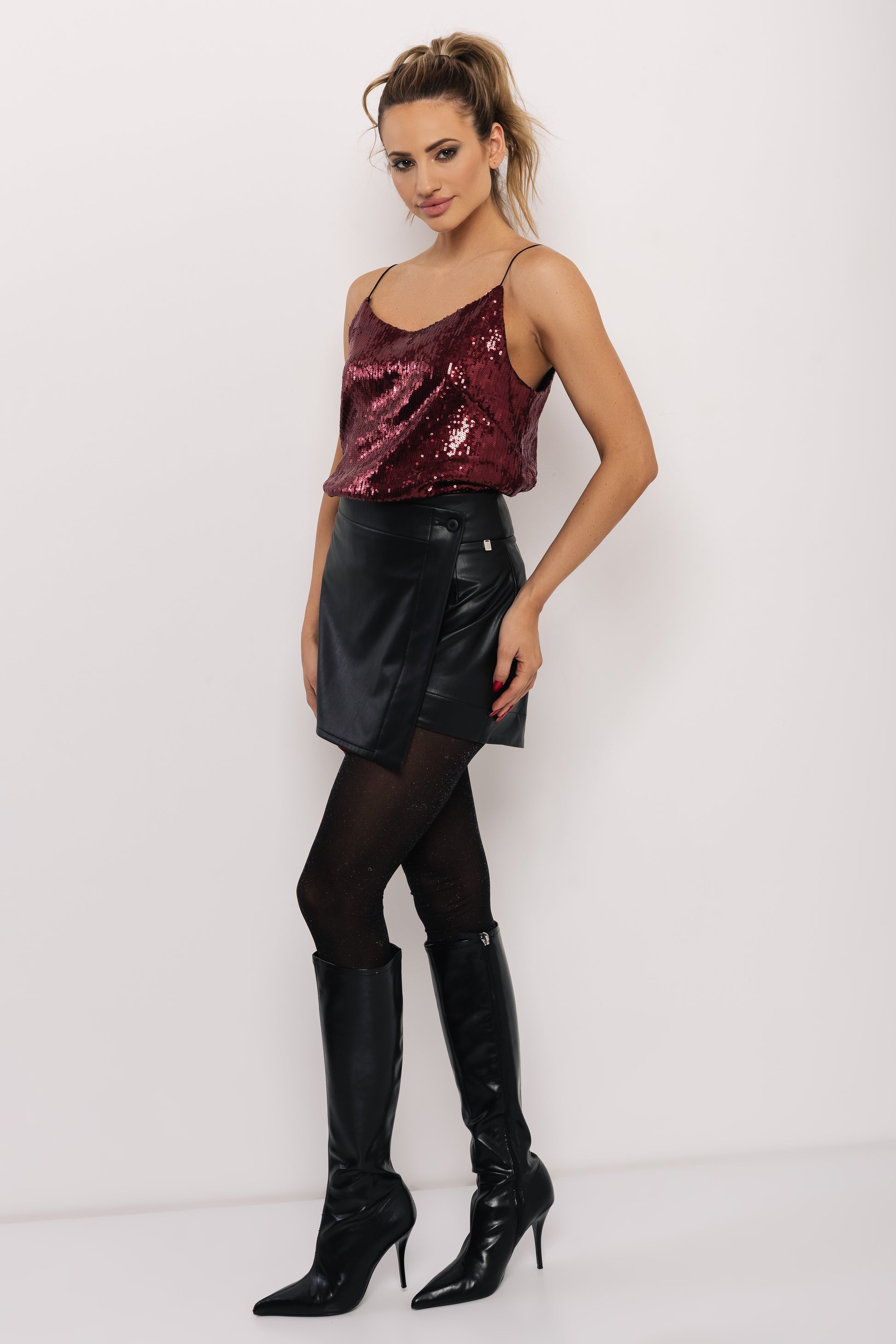 Tedd különlegessé a megjelenésed az AMNESIA Renti toppal! Flitteres necc anyaga és nőies fazonja szépen kiemeli a tested, míg a spagetti pántok elegáns és légies megjelenést kölcsönöznek. Bordó, fekete és krém színekben elérhető, így könnyedén megtalálhatod a hozzád illő darabot. Kombináld a hozzáillő AMNESIA Tomos szoknyával, hogy egy igazán lenyűgöző szettet alkoss különleges alkalmakra!