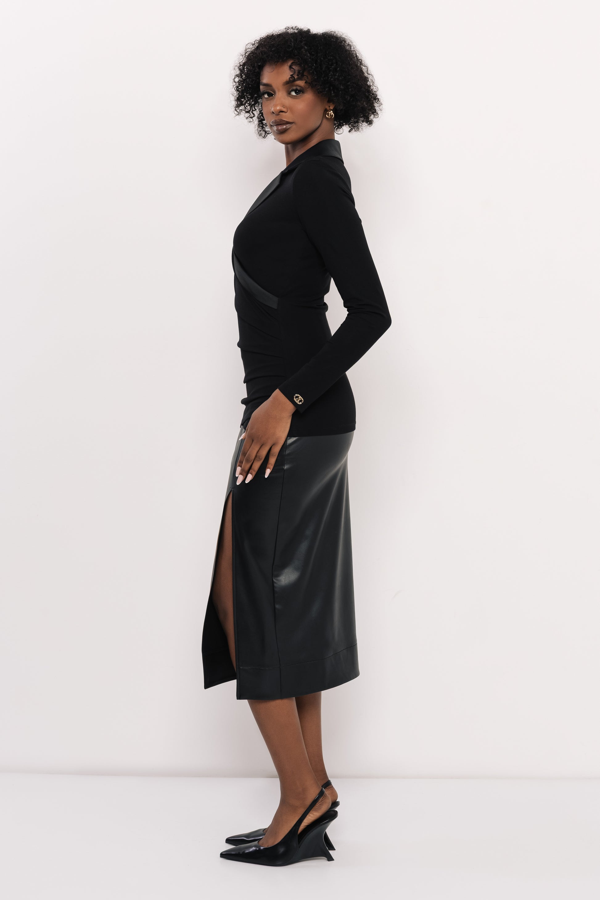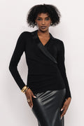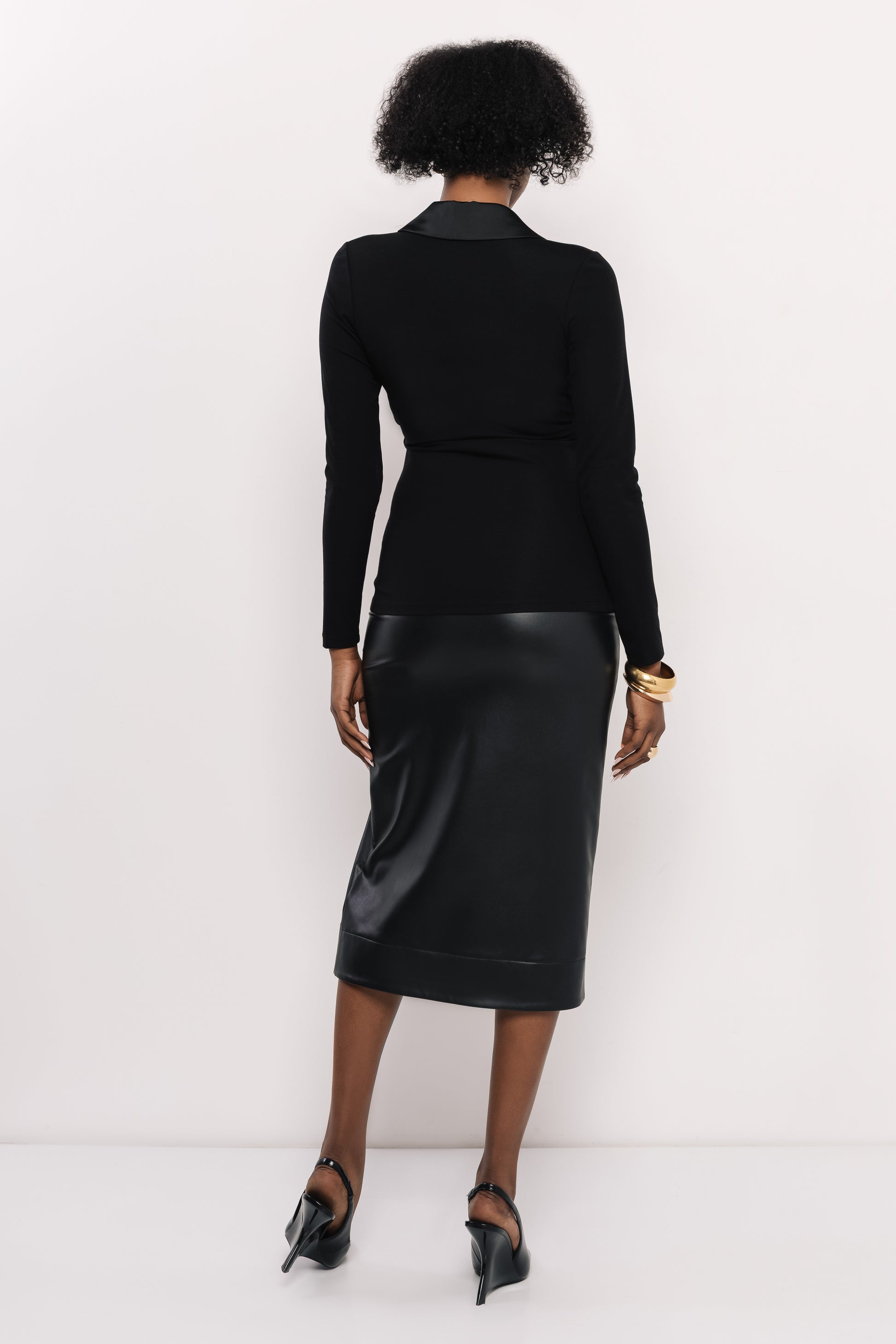 Az AMNESIA Zsofi felső nőies, mégis modern darab, amely minden alkalommal eleganciát sugároz. A vékony punto és szatén kombinációja kifinomult hatást kelt, a kihajtott, hosszított gallér pedig modern, trendi megjelenést ad. A fazon karcsúsított, így gyönyörűen követi az alakot, miközben a szatén gallér lágy fényt visz az összhatásba. Elérhető fekete és ekrü színben – az ekrü elegáns és friss, a fekete örök klasszikus. Kombináld bőrhatású nadrággal vagy az AMNESIA Zuky nadrággal, és egészítsd ki arany kiegészítőkkel az igazán nőies hatásért. Egy elegáns felső, ami tökéletes irodába, vacsorához vagy akár ünnepi alkalmakra – találd meg a saját színed az amnesia.hu webshopon!
