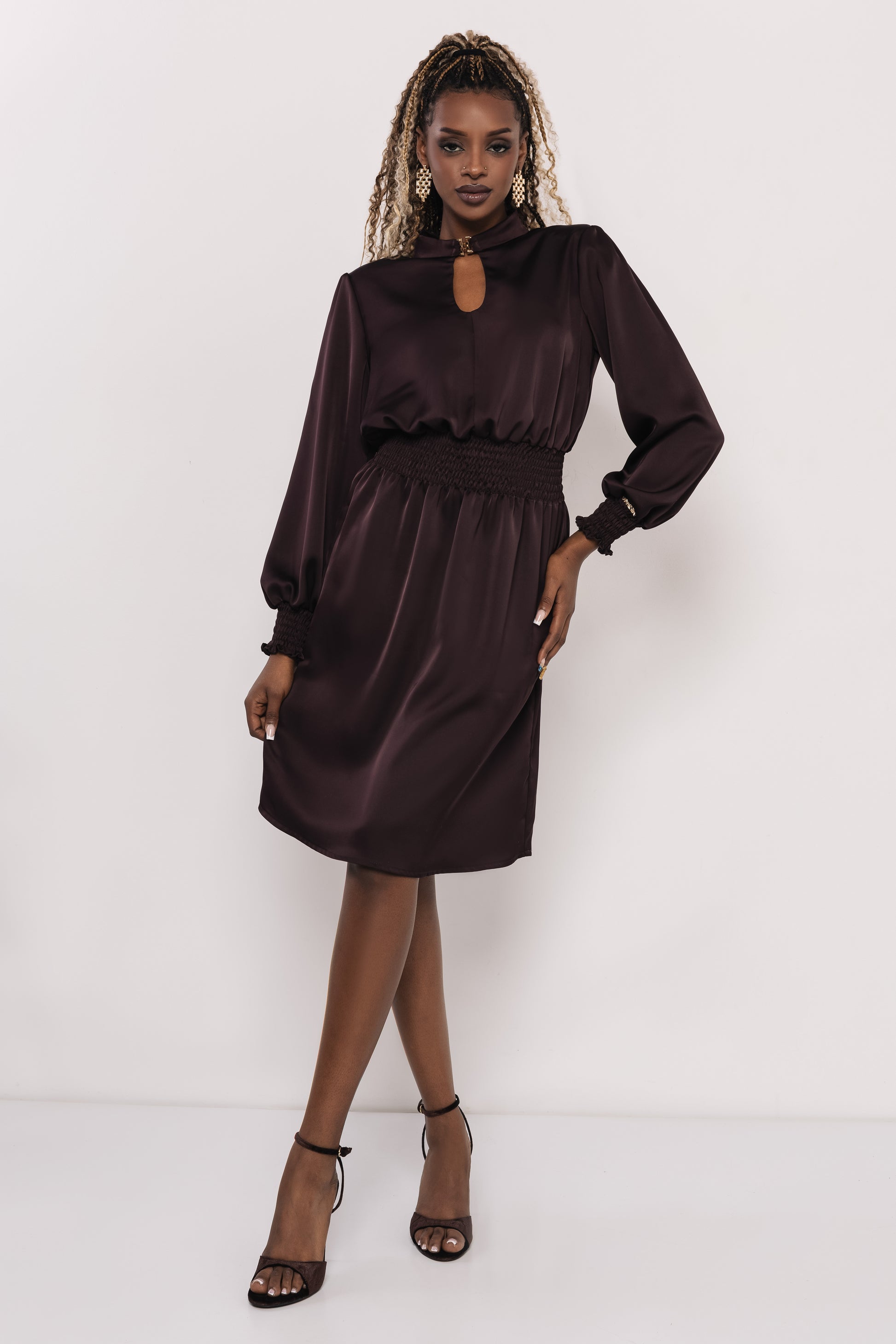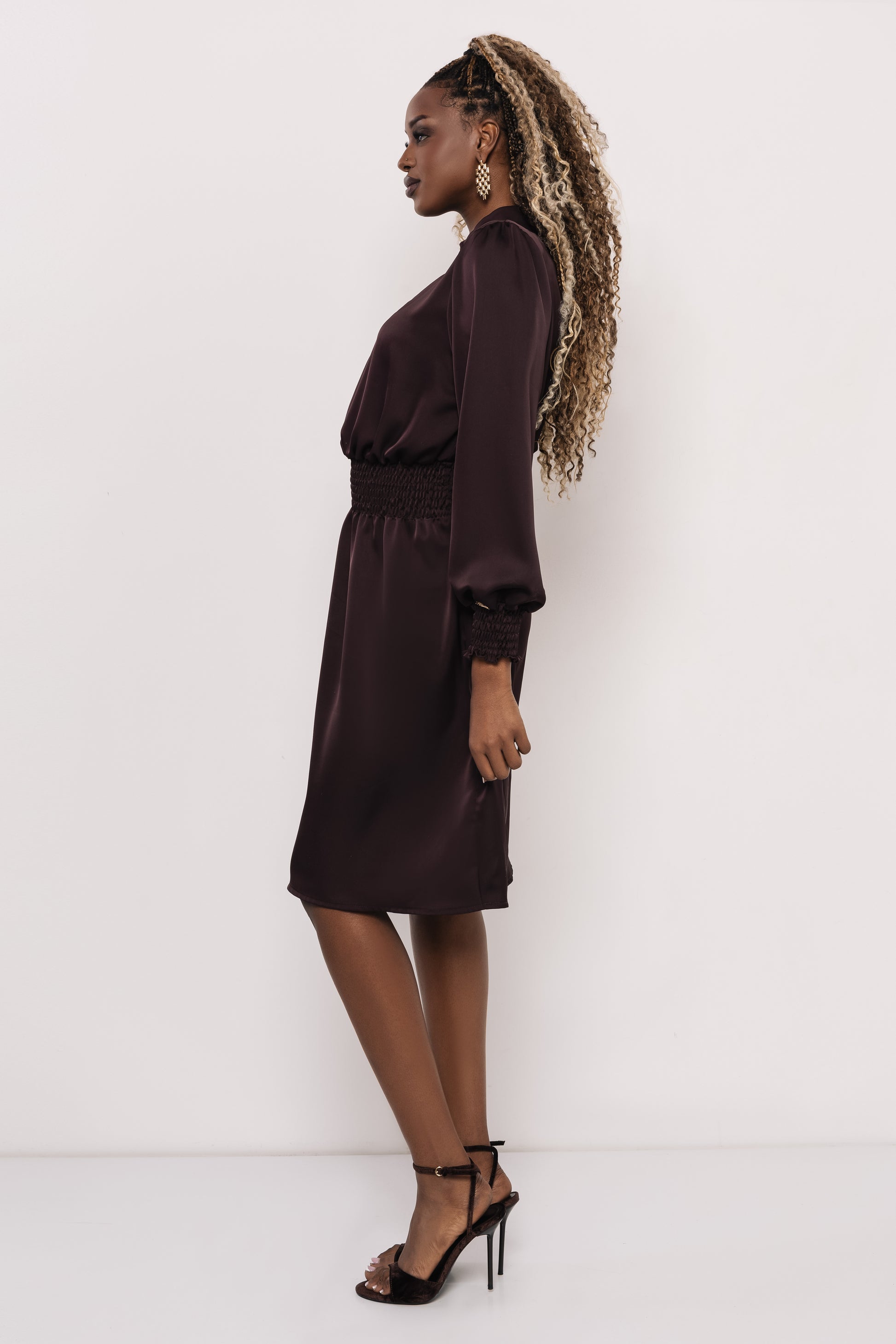 Az AMNESIA Inara ruha elegáns hatású, lágy esésű szaténból készül, amely minden mozdulatnál finoman követi a test vonalát. A mély csoki árnyalat különösen exkluzívvá teszi. A fazon nőies extra készül: mellén csepp alakú kivágással, hosszú puffos ujjakkal és rugalmas derékrésszel, amely szépen hangsúlyozza a sziluettet. S és M méretben érhető el. Stílusban jól működik körömcipővel és elegáns bokacsizmával is. Ha egy igazán nőies, könnyed alkalmi darabot keresel, az AMNESIA Inara ruha most vár az amnesia.hu webshopon.