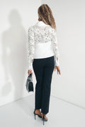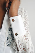 A csipke és puplin kombinációja teszi igazán különlegessé: a felső rész finoman áttetsző csipkéből készül, a testet követő alsó rész pedig puplinból, amely biztosítja a blúz tartását. A gombos mandzsetta, a klasszikus gallér és a varrások nőies, elegáns karaktert adnak neki. Fekete, bordó és ekrü színekben érhető el, hogy minden alkalomra megtaláld a stílusodhoz illőt.