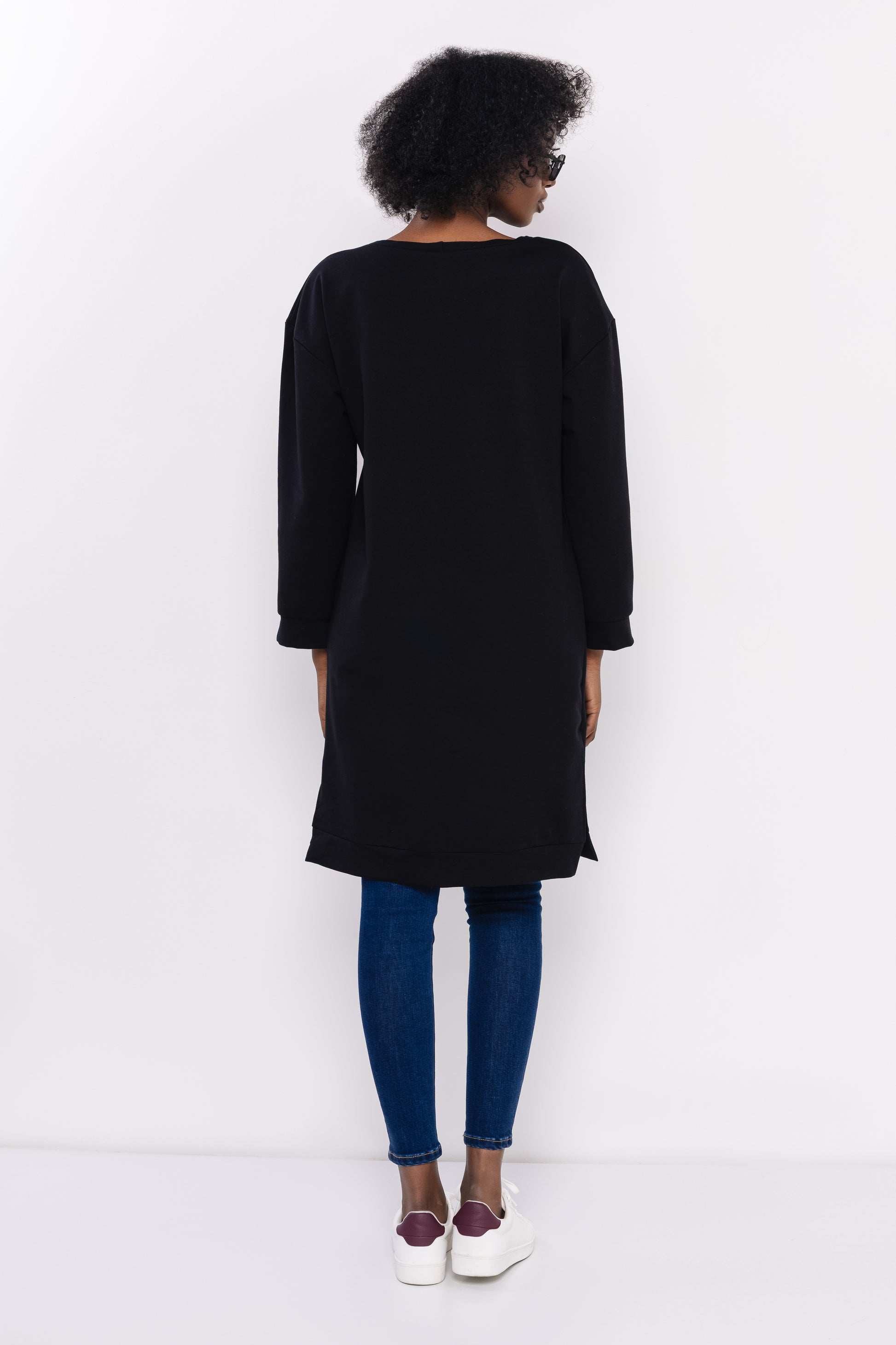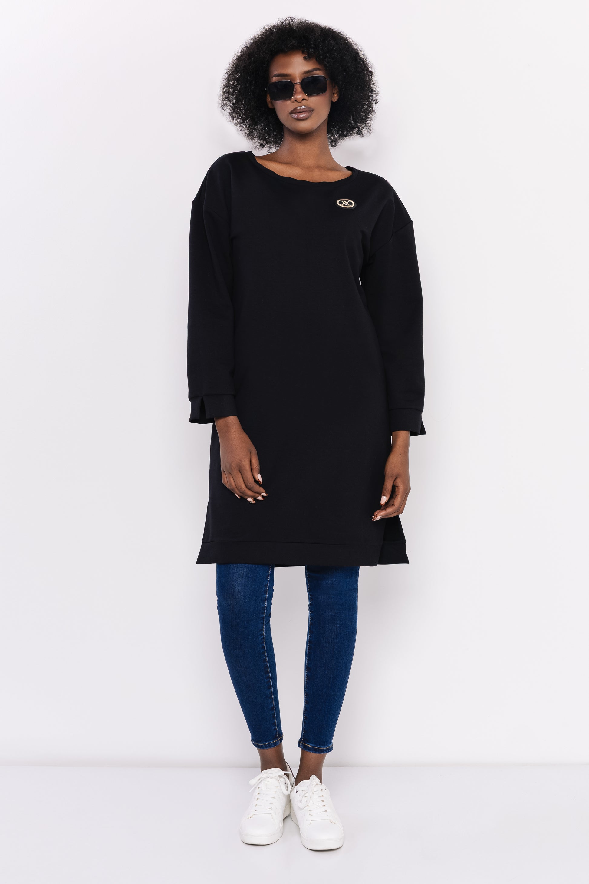 Az AMNESIA Godo tunika a letisztult stílus rajongók kedvence lesz. Egyenes, lezser szabású fazonja és enyhén ejtett válla elegáns vonalvezetést ad, míg az oldalhasítékok könnyedséget kölcsönöznek a darabnak. A mellrész díszítése finom, logós részlet, amely visszafogottan emeli ki a tunika modern karakterét. A futter anyag puha, meleg és rugalmas, így a Godo tunika ideális választás őszi-téli napokra. Elérhető fekete és csoki árnyalatban – mindkettő sokoldalúan kombinálható a gardrób alapdarabjaival. Viseld sportcipővel egy laza hétvégi lookhoz, vagy övvel és csizmával, ha nőiesebb szettet szeretnél. Fedezd fel a kedvenc színedben, és tedd kosárba az amnesia.hu webshopon, amíg elérhető!