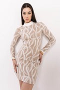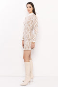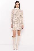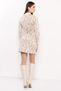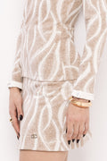 Az AMNESIA Kirken felső letisztult, mégis különleges darab, amelyet a bézs–ecrü jacquard mintázat tesz egyedivé. A klasszikus, alacsonyan álló nyakrész és az egyenes vonalvezetés eleganciát sugall, miközben a puha, minőségi anyag kényelmes viseletet biztosít. Strukturált, mégis nőies fazonja miatt tökéletes választás a hűvösebb napokra. Viseld az azonos mintájú AMNESIA Tambi szoknyával szettben egy harmonikus, elegáns összeállításhoz, vagy kombináld egyszerű nadrággal és csizmával a hétköznapokra. A jacquard anyag prémium hatású, így bármilyen kiegészítővel stílusosan mutat. Ez a felső igazi gardrób-kincs – fedezd fel az amnesia.hu webshopon, és alakíts ki vele végtelenül nőies őszi outfiteket!
