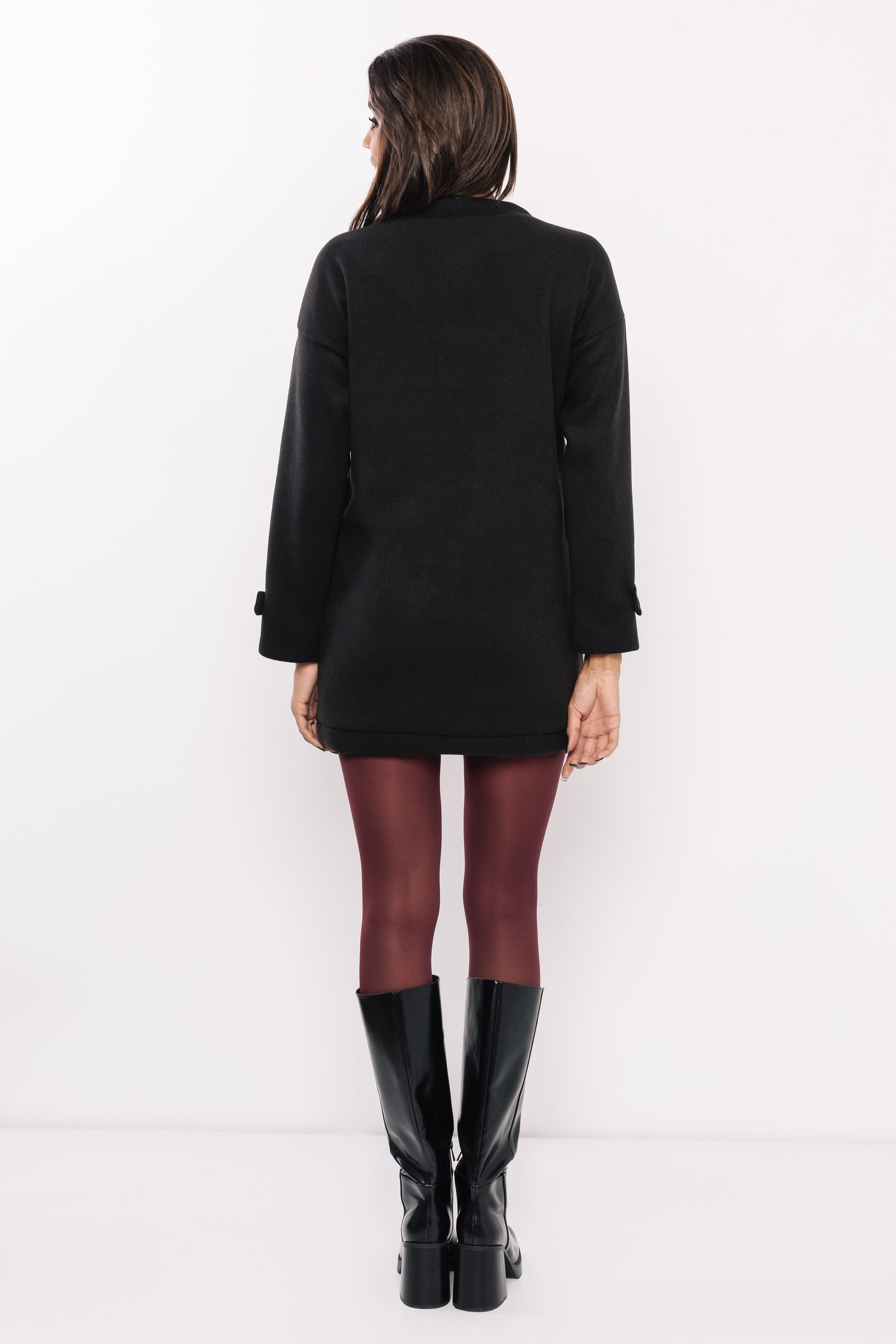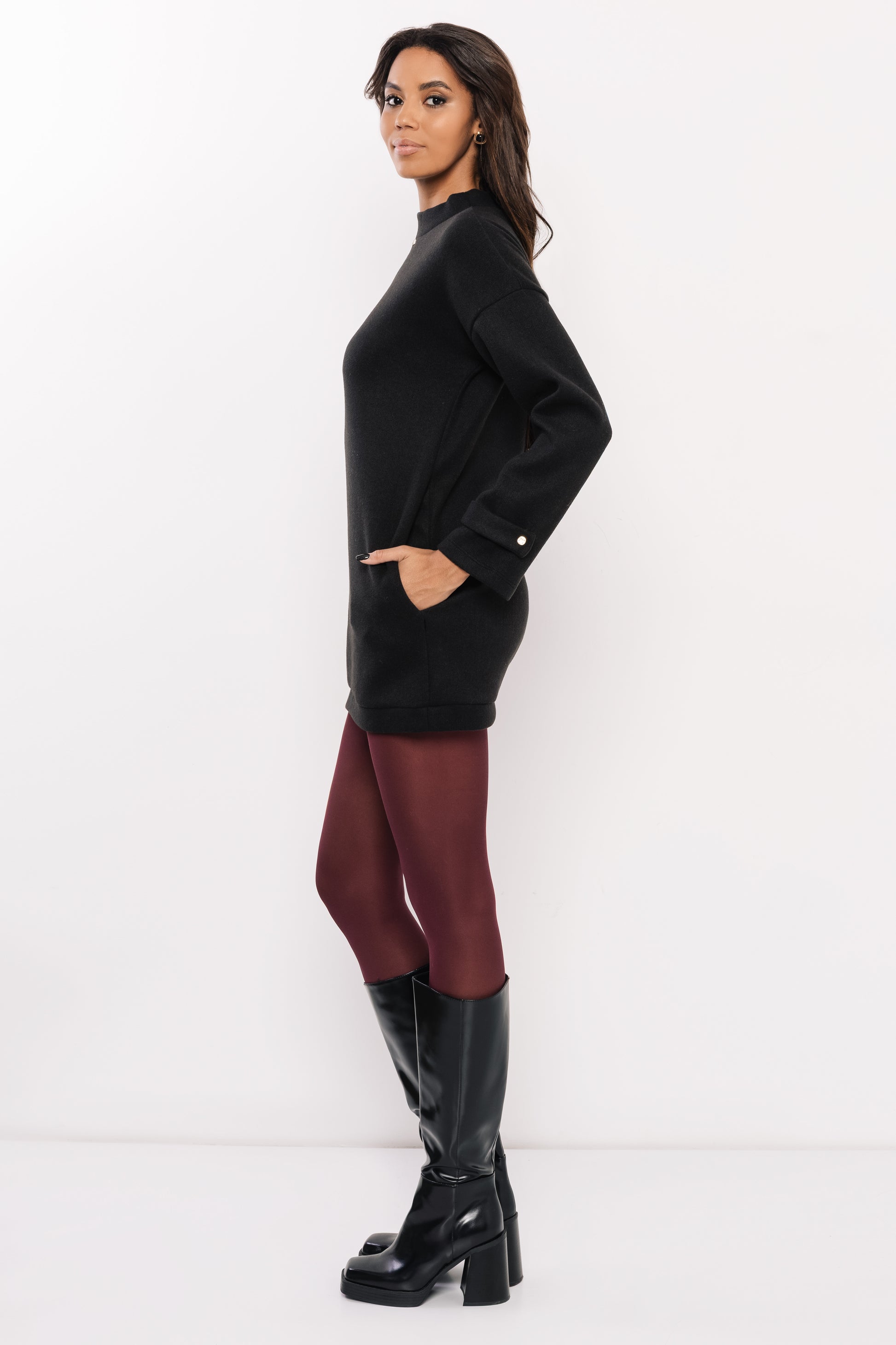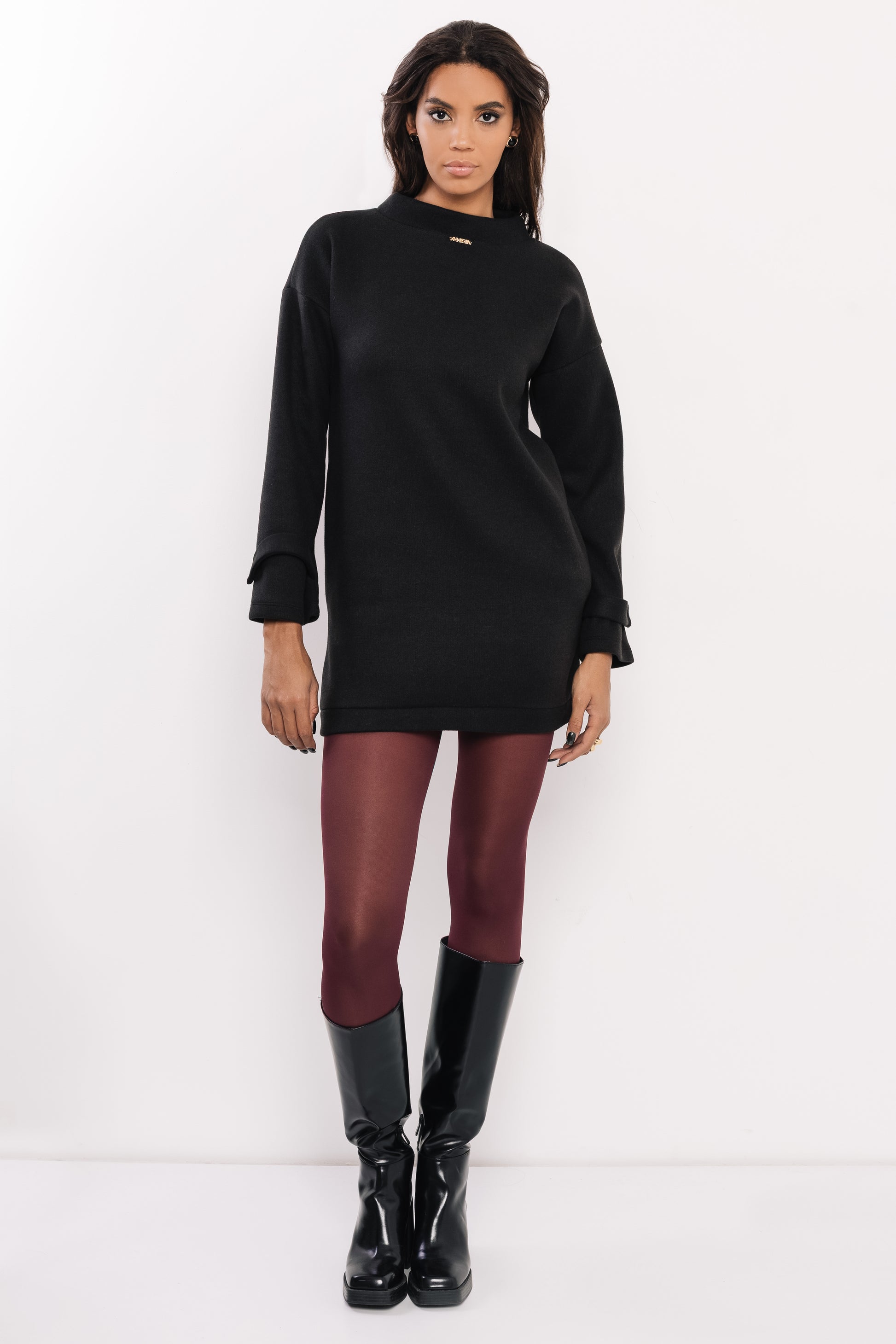 Az AMNESIA Vixi tunika a sportos stílus és a kényelmes öltözék tökéletes ötvözete. A vastag kötött anyag kellemes meleget biztosít, az enyhén álló nyakkivágás és az ejtett vállvonal pedig lezser eleganciát kölcsönöz. A mandzsettás ujjakon található díszgomb részlet finoman emeli ki a darab igényes kidolgozását. Tökéletes választás leggingsszel vagy bőrhatású nadrággal, de akár egy övvel derekat hangsúlyozva is viselhető. A fangó, ekrü és fekete színek közül bármelyik stílusosan beilleszthető az őszi-téli gardróbba. Ha szereted az időtlen, de modern kötött darabokat, a Vixi tunika a kedvenceddé válik – rendeld meg az amnesia.hu webshopon, és emeld vele a mindennapi megjelenésed!