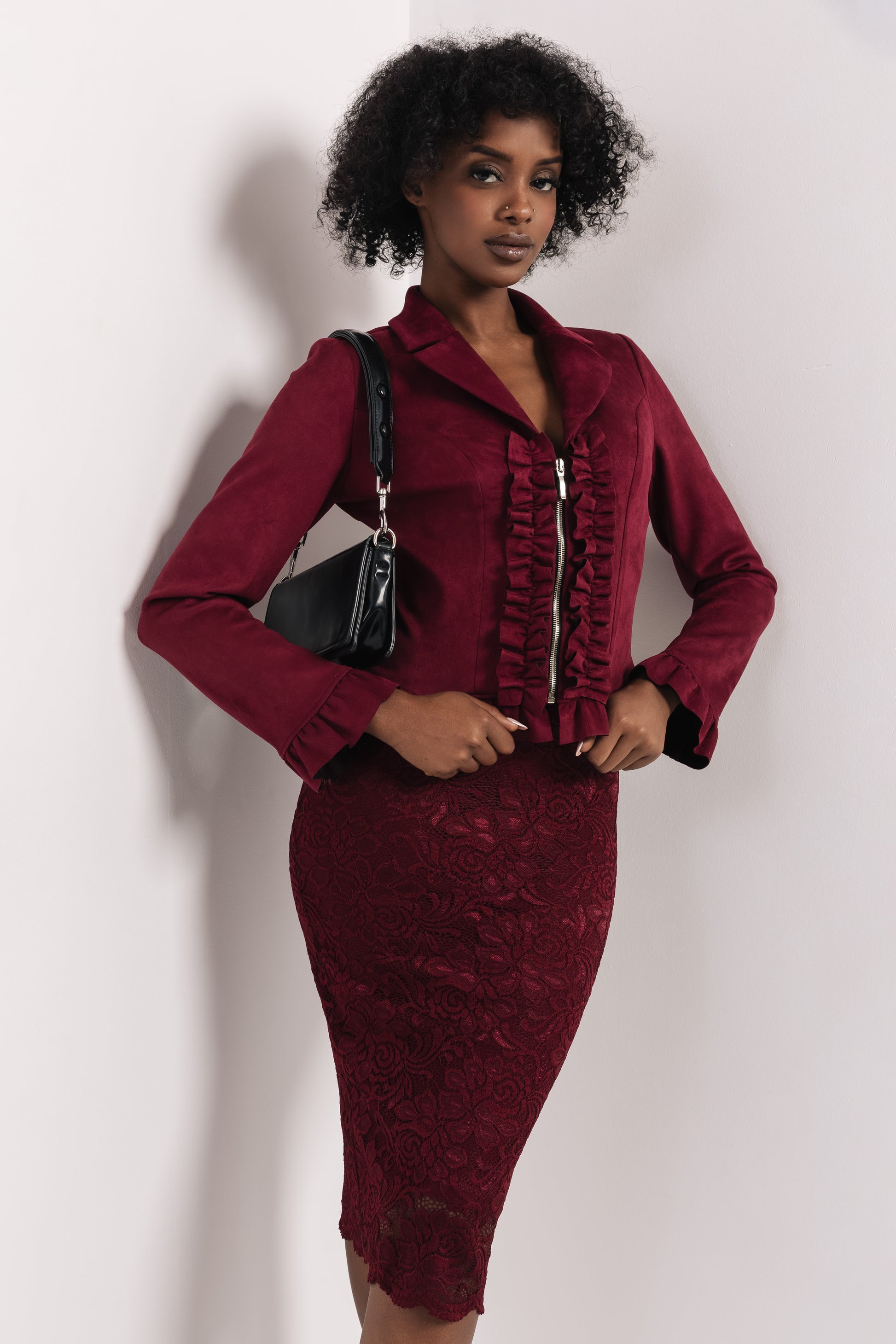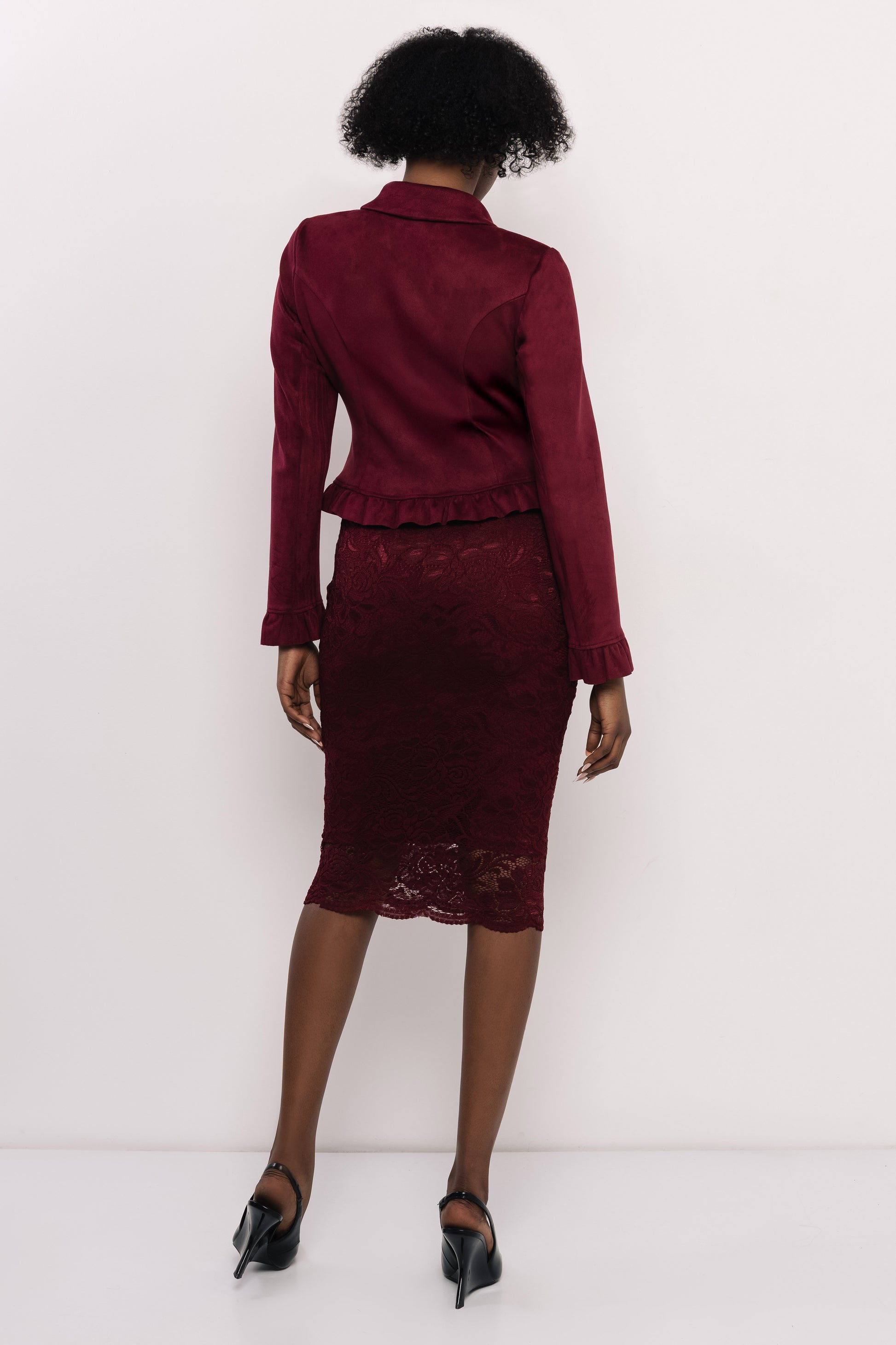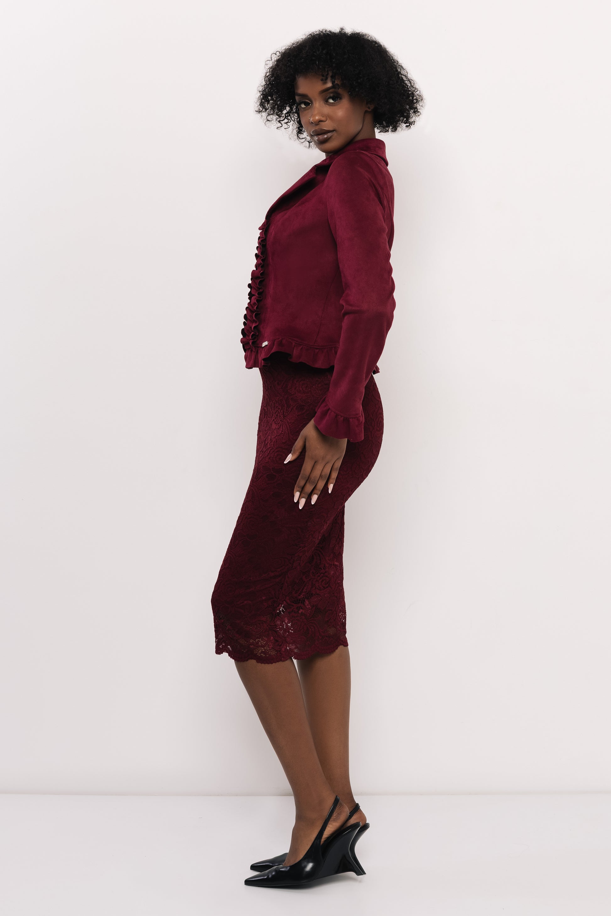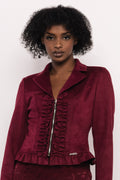Az AMNESIA Jasira zakó a nőies elegancia modern megfogalmazása: letisztult, mégis látványos darab, amely a velúr puhaságával és a finom részletekkel az alkalmi szettek egyik új kedvence lehet. Könnyed, különleges és igazán magabiztos összhatást ad. A fazon karcsúsított, klasszikus gallérral és különleges fodros díszítéssel készül. Az ujjak végén apró fodor lágyítja a sziluettet, a derékvonalnál pedig finoman bővülő peplum hatás teszi igazán nőiessé. A puha velúranyag kellemes tapintású, jól tartja a formát és szépen simul a testre. Styling tipp: tökéletesen mutat az AMNESIA Nira csipkeszoknyával — így komplett, elegáns szettben viselheted ünnepi alkalmakon vagy esti eseményeken. Magassarkúval és apró ékszerekkel még kifinomultabb az összhatás. Válaszd ezt a zakót, ha elegáns, karakteres darabra vágysz — fedezd fel az amnesia.hu webshopon!