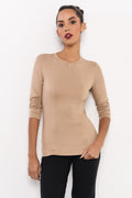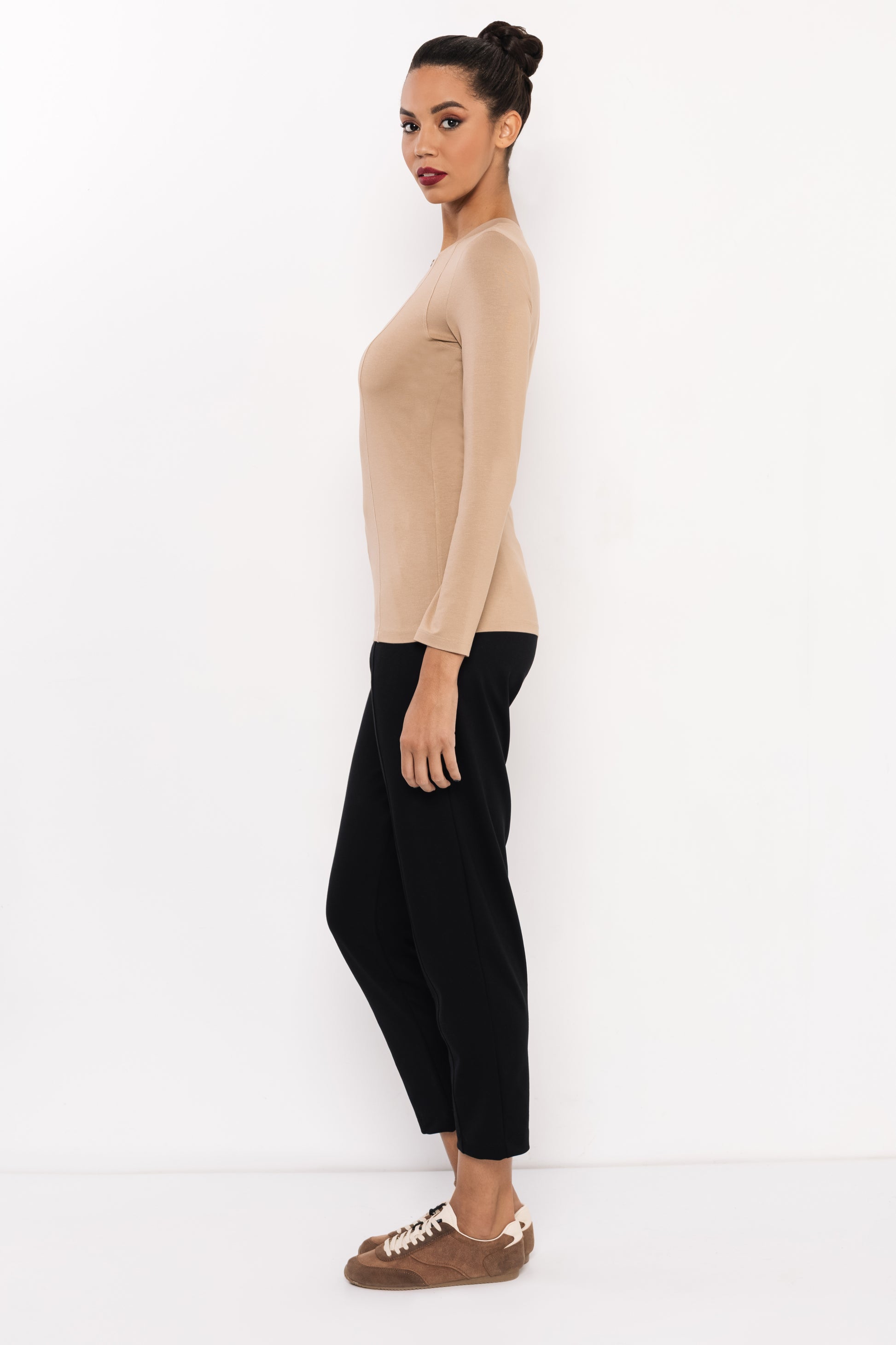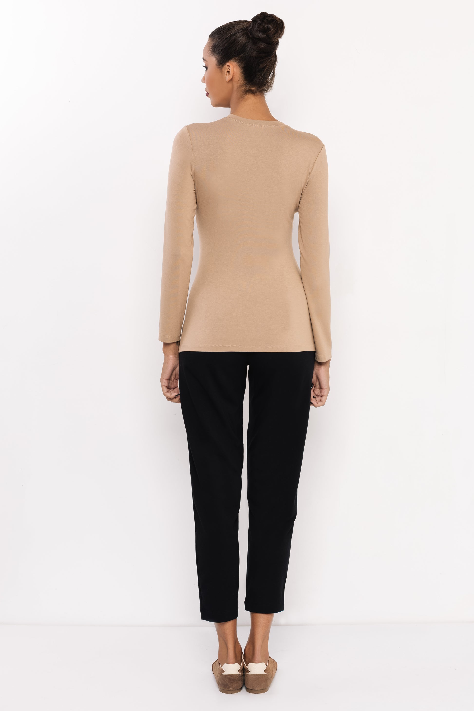 Az AMNESIA Mala felső a letisztult elegancia és a könnyed viselet tökéletes kombinációja. A puha viszkóz anyag finoman simul a testhez, miközben légiesen könnyű érzetet ad. Klasszikus, hosszú ujjú fazonja és apró fém logó díszítése letisztult, mégis nőies megjelenést kölcsönöz, amely bármely szett alapdarabja lehet. A fekete, bézs és mogyoró színben elérhető Mala felső igazi jolly joker a gardróbban: a natúr árnyalatok harmonikusan illeszkednek bármely szezon színvilágába, így biztosan megtalálja helyét mind a hétköznapi, mind az alkalmi összeállításokban. Kombináld AMNESIA nadrágokkal vagy szoknyákkal, és alakíts ki stílusos, mégis komfortos szetteket, amelyekkel könnyedén kifejezheted egyéniséged. Szerezd be az amnesia.hu webshopon, amíg elérhető!
