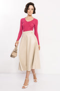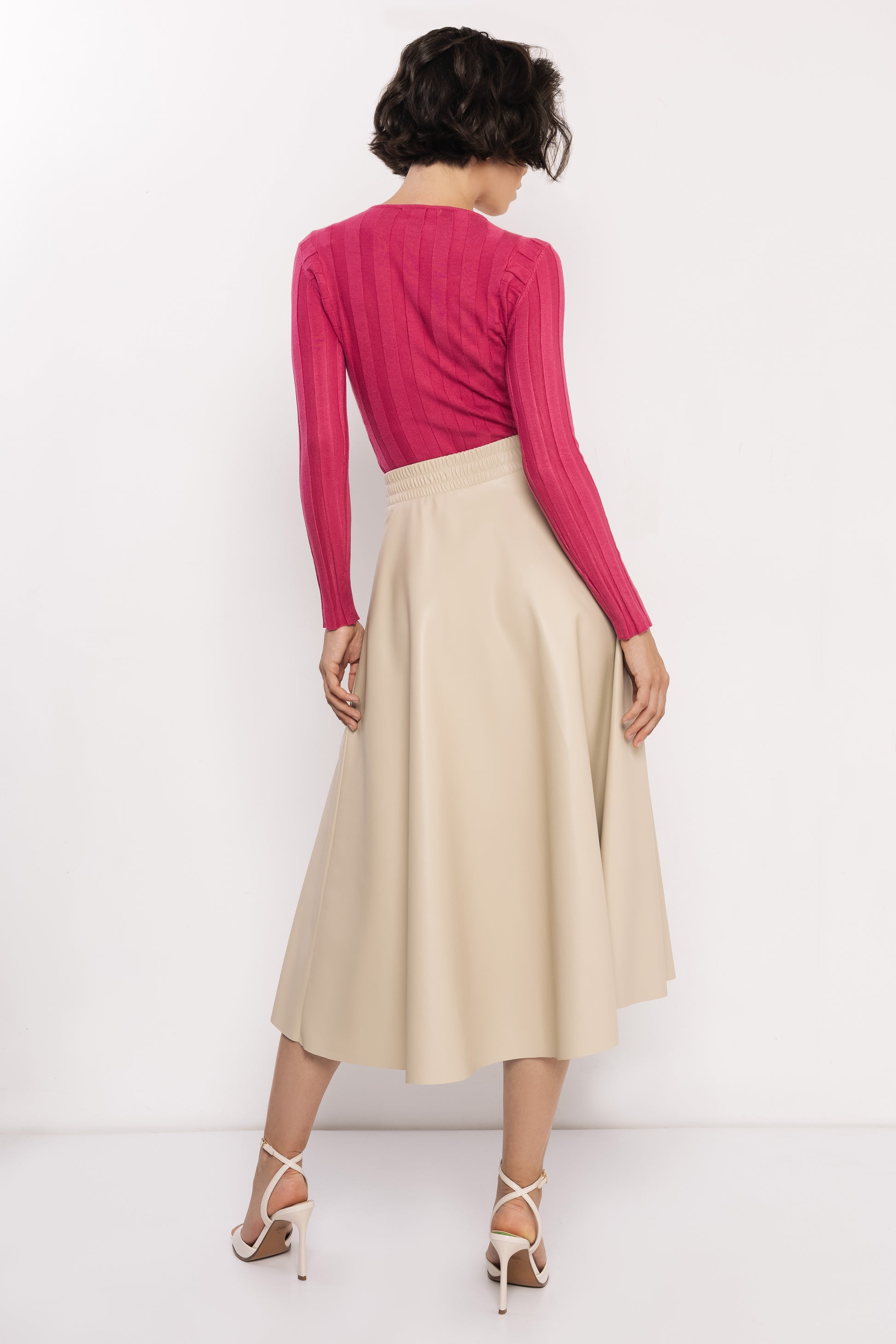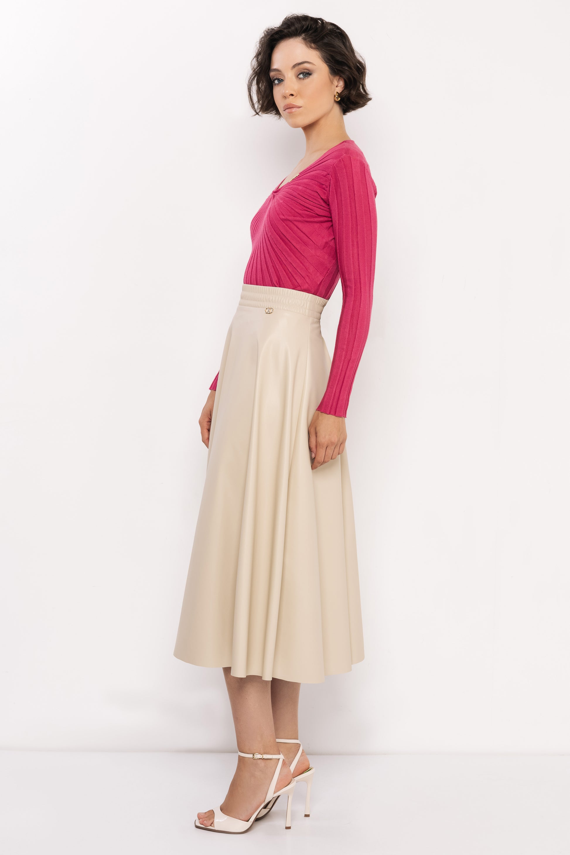 Az AMNESIA Nezom szoknya a nőies elegancia és a modern letisztultság találkozása. A műbőrből készült darab fényes felületével és tökéletes tartásával azonnal magára vonja a figyelmet. A középmagas derékrész és a bővülő A-vonalú fazon optikailag nyújtja az alakot, miközben kifinomult, mégis trendi megjelenést biztosít. Homok és fekete színben is elérhető, így minden stílushoz könnyen illeszthető: a világos árnyalat légies, friss hatást kelt, míg a fekete klasszikus, örök darabként emeli a gardrób értékét. A finoman redőzött szabás és a könnyed esés nőies dinamizmust kölcsönöz a szoknyának, amely bármilyen alkalomra ideális választás. Tökéletes párost alkot az AMNESIA felsőkkel, amelyekkel elegáns vagy lezser szettként is viselheted. Ha egy igazán sokoldalú darabot keresel, amely minden megjelenésedet stílusossá teszi, ne hagyd ki az AMNESIA Nezom szoknyát az amnesia.hu webshop kínálatából!