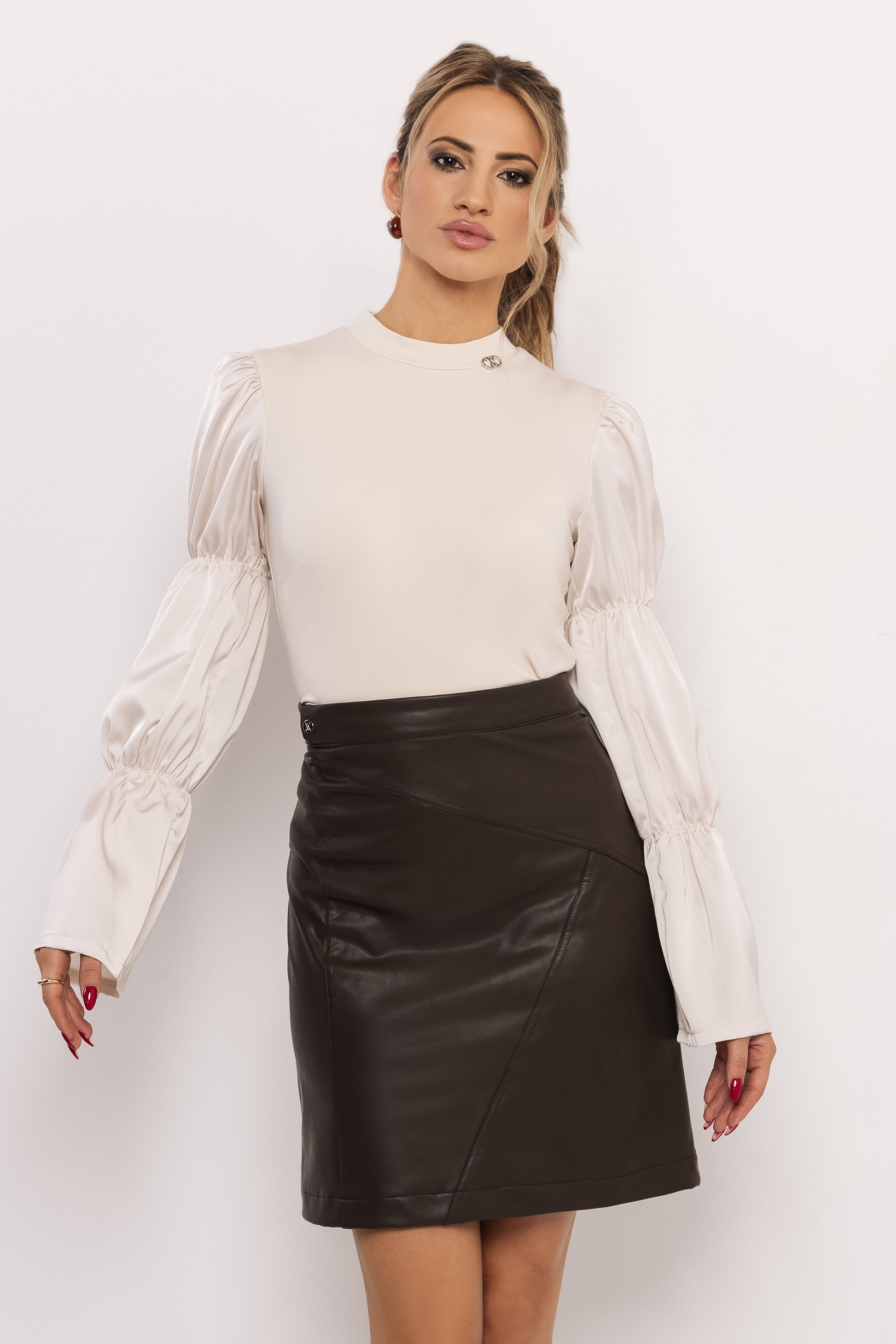 Az AMNESIA Peglon felső igazi statement darab: a látványos, szaténból készült puffos ujjak különleges karaktert adnak minden looknak. A testet követő, vékony punto anyag szépen formál, míg a hosszú, szaténujjak nőies hangsúlyt adnak a darabnak. Viselheted szűk műbőr szoknyával – például az AMNESIA Hunt szoknyával – ha elegáns, mégis modern szettet szeretnél, vagy kombinálhatod egyszerű, egyenes szárú nadrággal egy letisztult hétköznapi összeállításhoz. Magassarkúval alkalmi, loaferral pedig könnyedebb irányba viheted a megjelenést. Ha keresel egy különleges felsőt, amely bármilyen szettet kiemel, a Peglon felső tökéletes választás – fedezd fel az amnesia.hu webshopon, mielőtt lemaradsz róla!