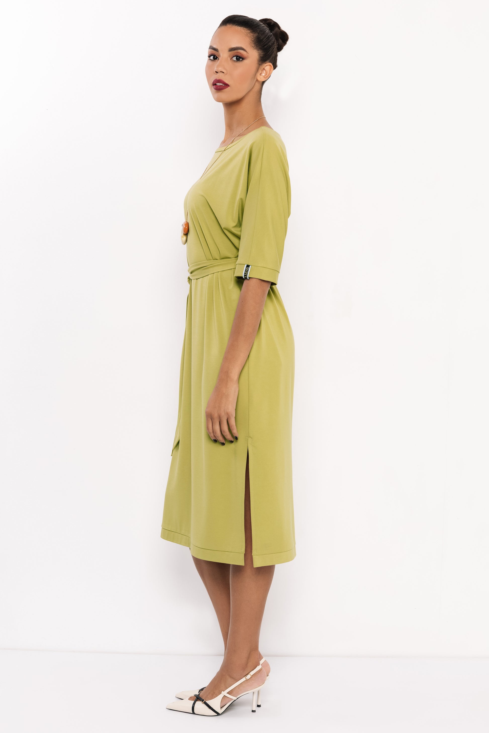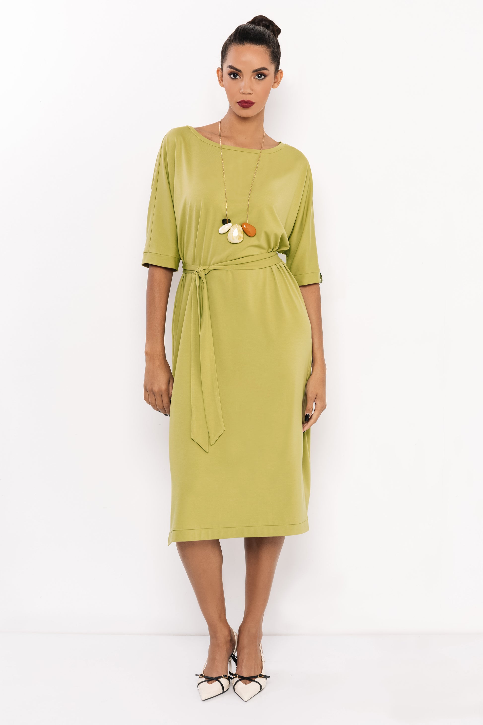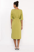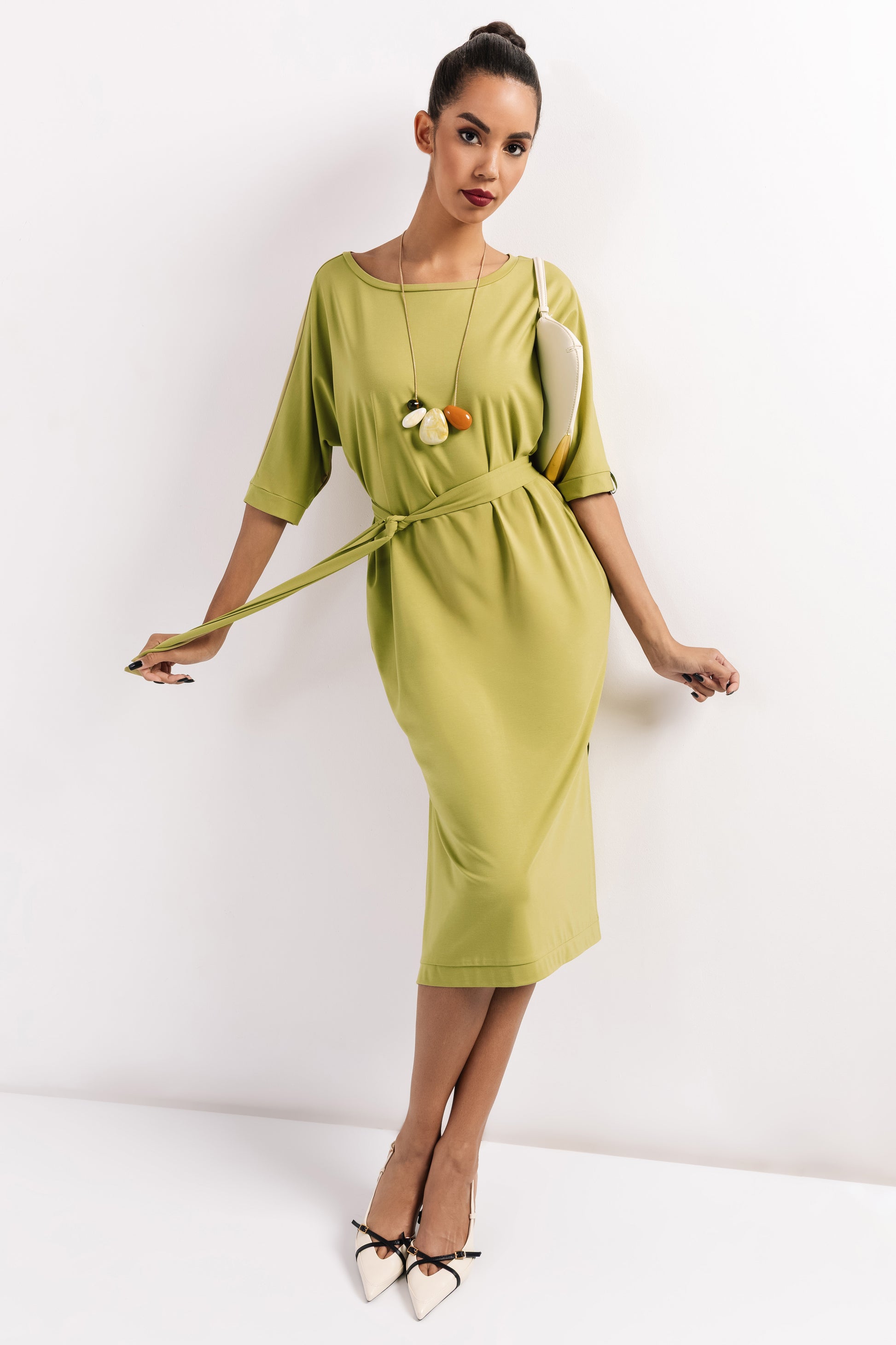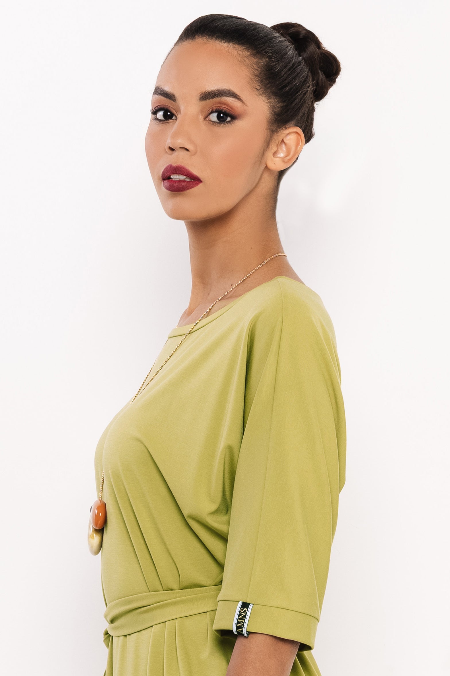 Az AMNESIA Valga ruha a laza elegancia megtestesítője. Vékony punto anyaga könnyed és rugalmas, amely szépen követi a mozdulatokat, miközben kényelmes viselet egész nap. Az egyméretes kialakítás univerzálisan illeszkedik, a derékban megkötős fazon pedig kiemeli a nőies vonalakat és variálhatóvá teszi a megjelenést. Az oliva zöld és fekete árnyalatban elérhető darab egyszerre modern és időtlen, amely tökéletes választás hétköznapokra, irodába vagy akár esti programhoz is. Midi szabása letisztult, mégis különleges, a háromnegyedes ujj pedig kényelmes és praktikus részlet.