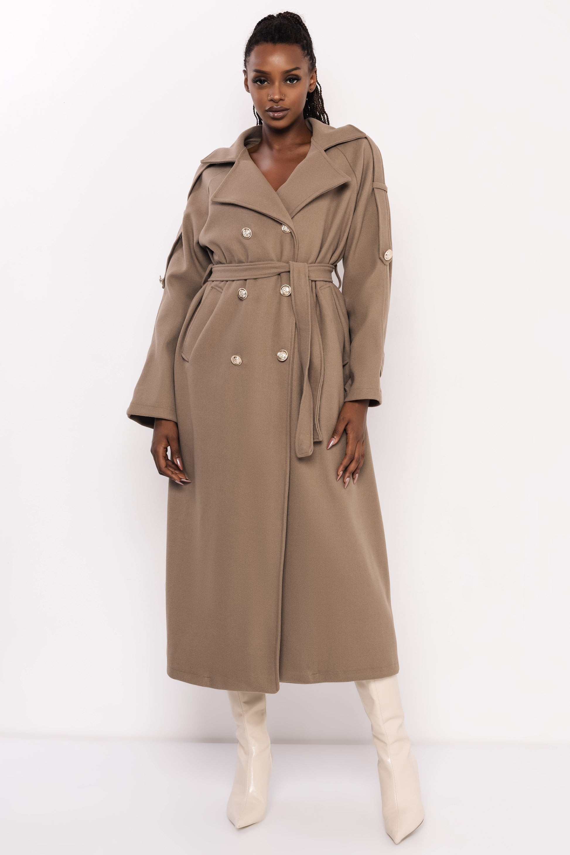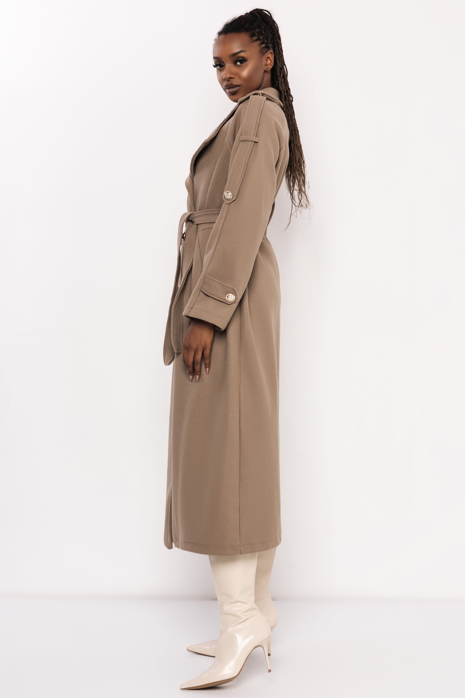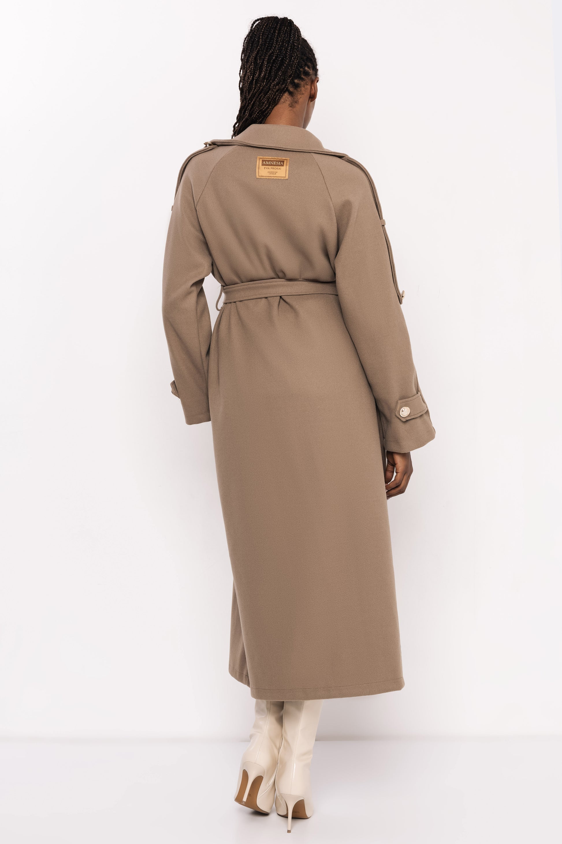 Az AMNESIA Admira aranygombos kabát elegáns és karakteres darab, amely az őszi-téli szezon egyik legkülönlegesebb stílusát képviseli. A klasszikus, kétsoros gombolás és a vállpántok határozott, mégis nőies megjelenést kölcsönöznek, a derékban megkötős fazon pedig gyönyörűen formálja az alakot. A finom esésű anyag és a markáns gombdíszítés tökéletesen ötvözi a modern eleganciát és a letisztult stílust.