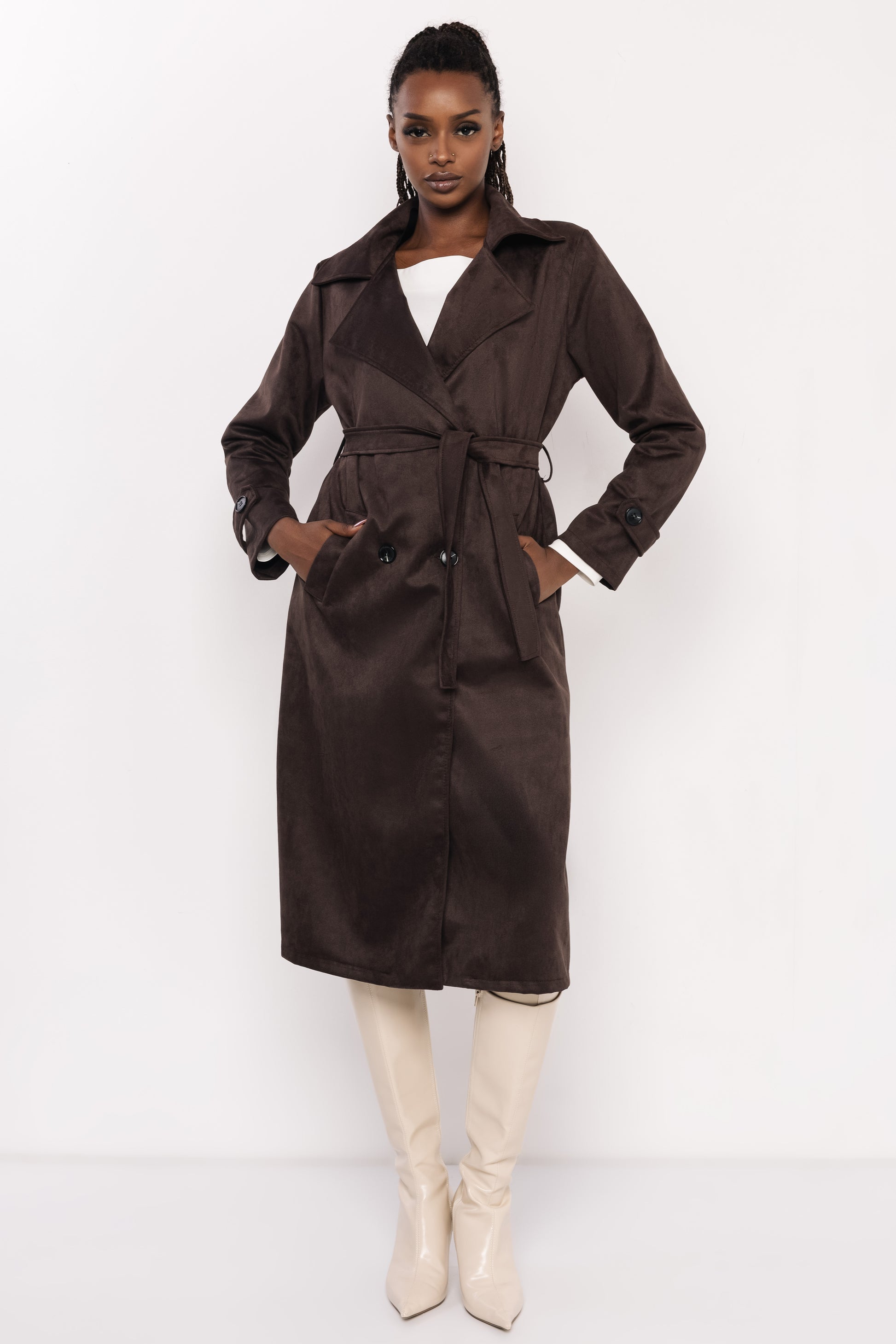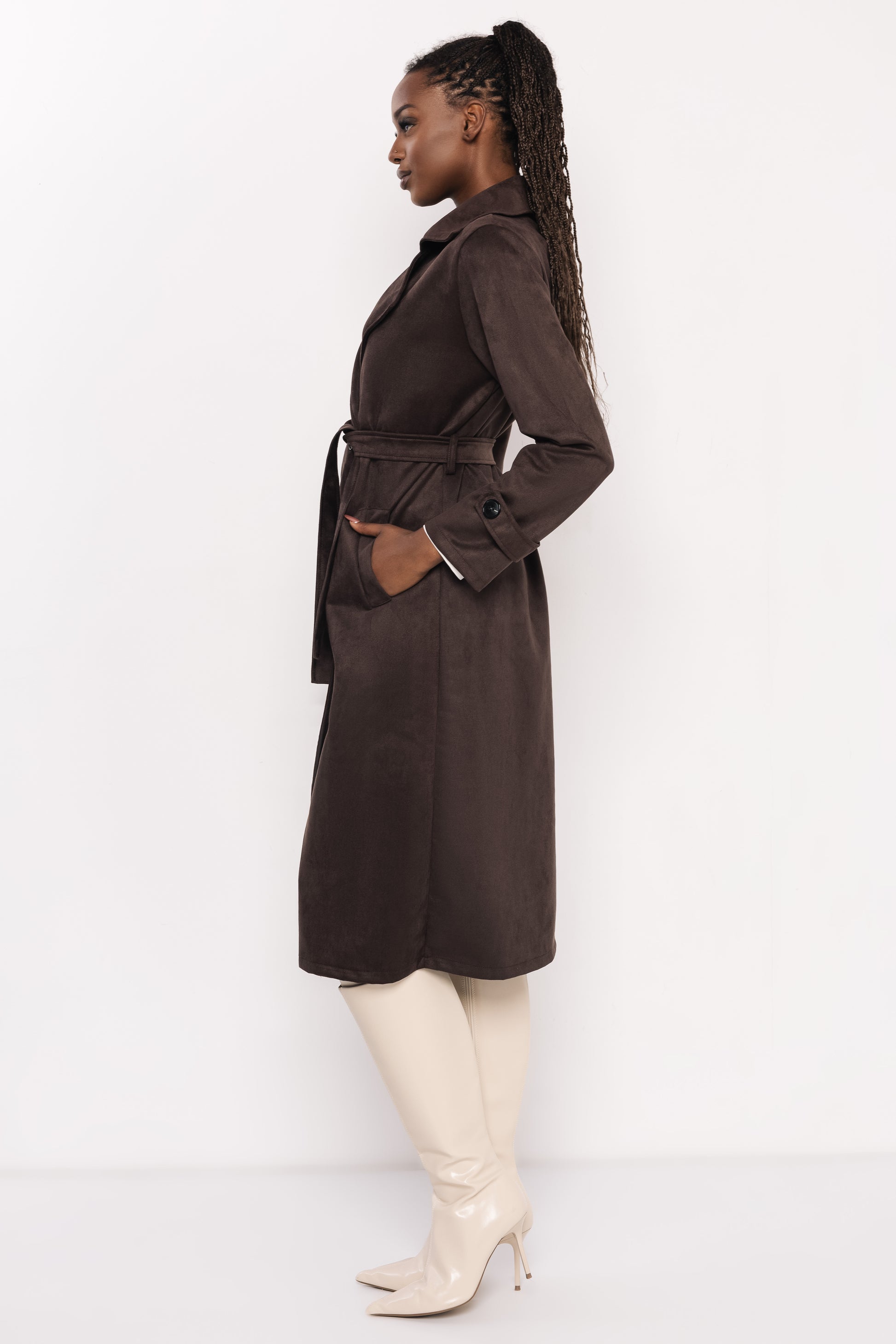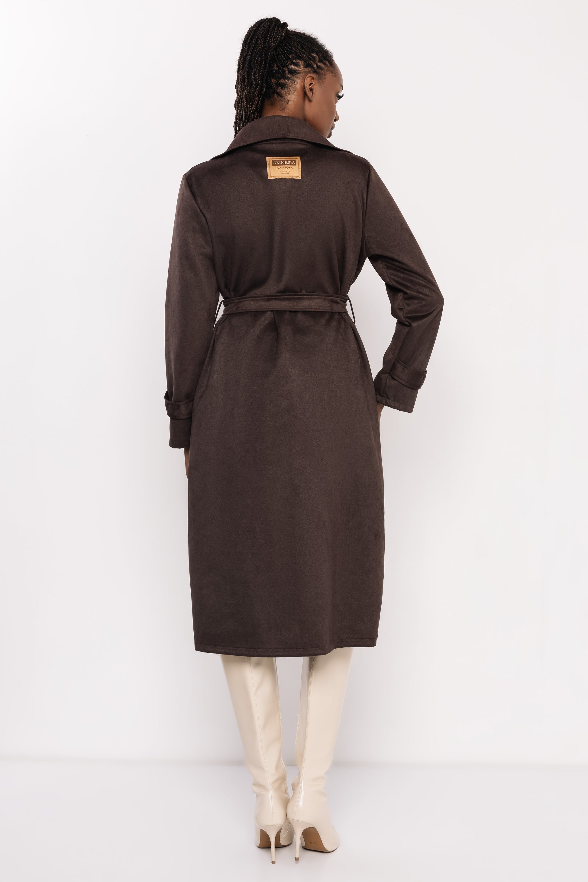 Az AMNESIA Drina művelúr kabát klasszikus ballonkabát fazonját idézi meg, széles hajtókával, dupla gombsorral és övvel a derékrészen, amely kiemeli a nőies sziluettet. A puha művelúr anyag elegáns megjelenést és kényelmes viseletet biztosít, miközben a színek széles palettája – a feketétől és khakitól a camel, sötétbarna, burgundi és vaj árnyalatig – lehetővé teszi, hogy mindenki megtalálja a stílusához leginkább illőt.
