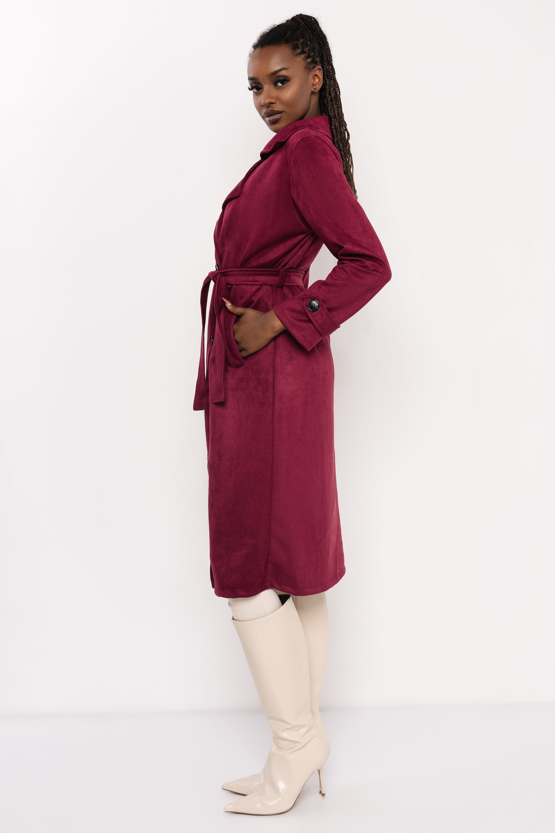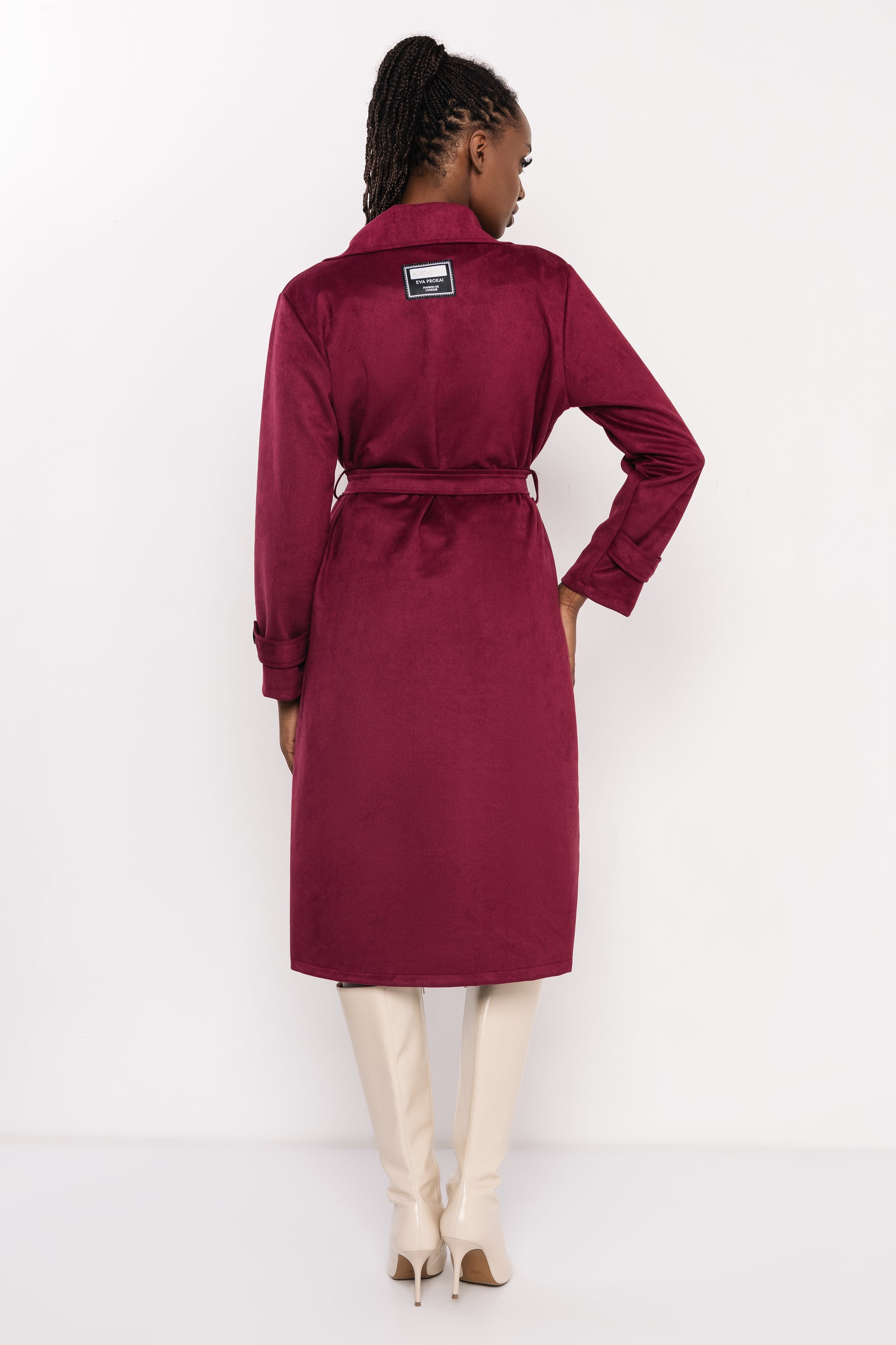 Az AMNESIA Drina művelúr kabát klasszikus ballonkabát fazonját idézi meg, széles hajtókával, dupla gombsorral és övvel a derékrészen, amely kiemeli a nőies sziluettet. A puha művelúr anyag elegáns megjelenést és kényelmes viseletet biztosít, miközben a színek széles palettája – a feketétől és khakitól a camel, sötétbarna, burgundi és vaj árnyalatig – lehetővé teszi, hogy mindenki megtalálja a stílusához leginkább illőt.