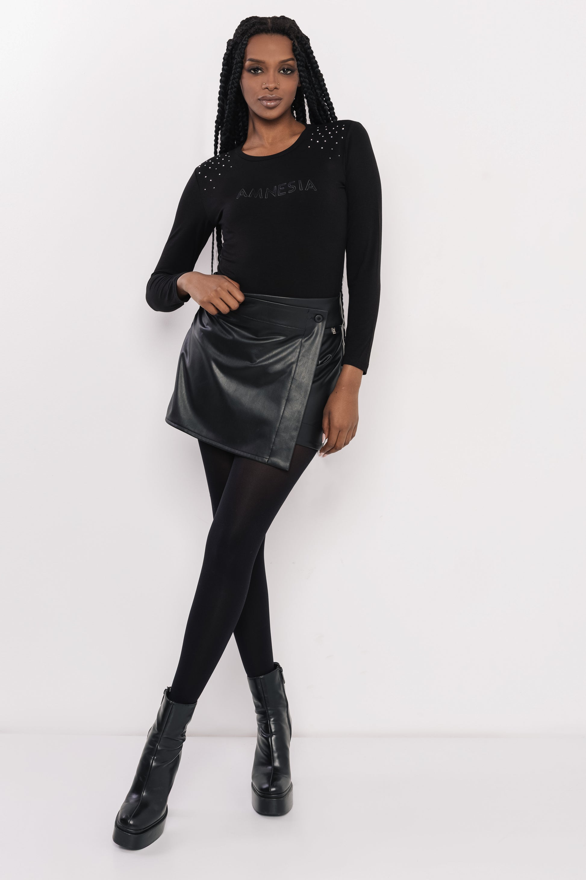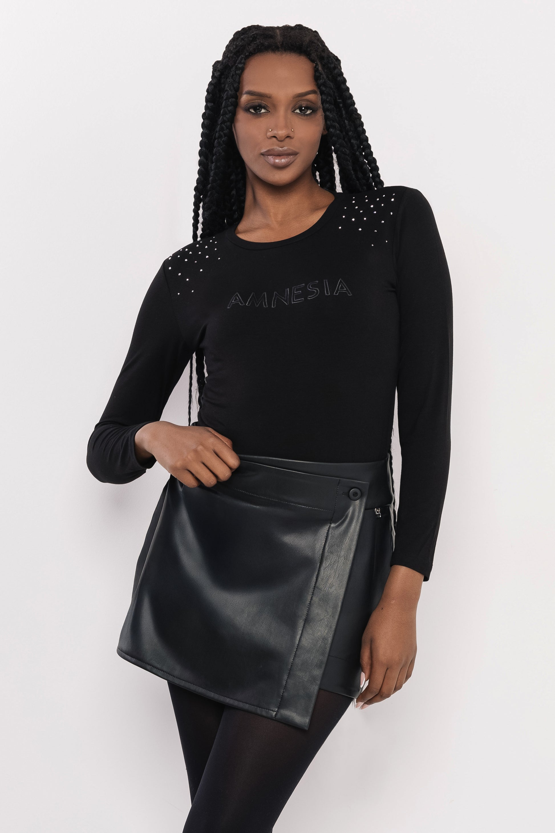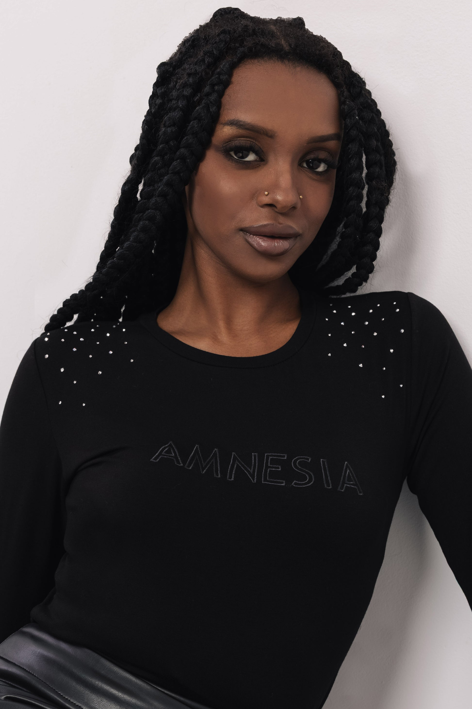 Az AMNESIA Héra szórt köves felső puha, viszkóz anyaga gyönyörűen simul a testre, a vállrész apró strassz díszítése pedig finom, ünnepibb hangulatot kölcsönöz neki. Az arany hímzett AMNESIA logó elegáns részlet, ami kiemeli a darab exkluzív megjelenését.