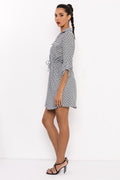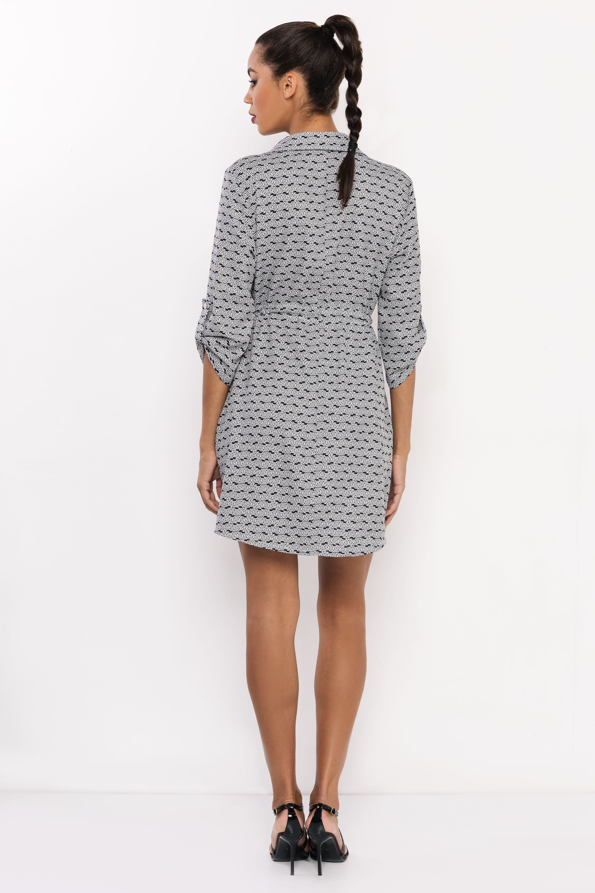A galléros nyakmegoldás klasszikus vonalat képvisel, míg a derékrészen húzott megkötő kiemeli az alakot és könnyen állítható a megfelelő komfort érdekében. Háromnegyedes ujjaival és rövidebb fazonjával tökéletes átmeneti darab, amely önmagában is teljes szettet alkot.