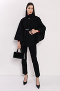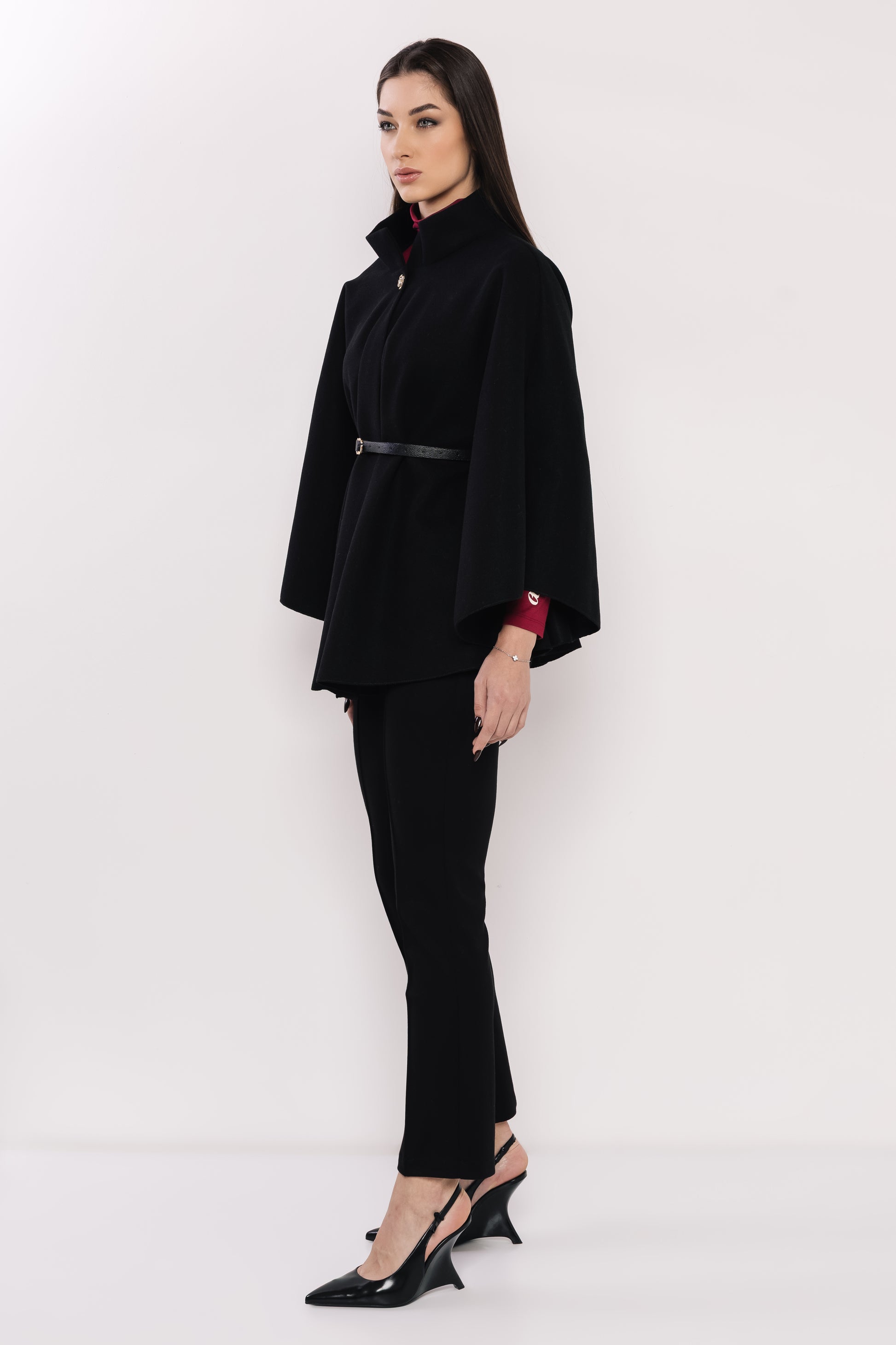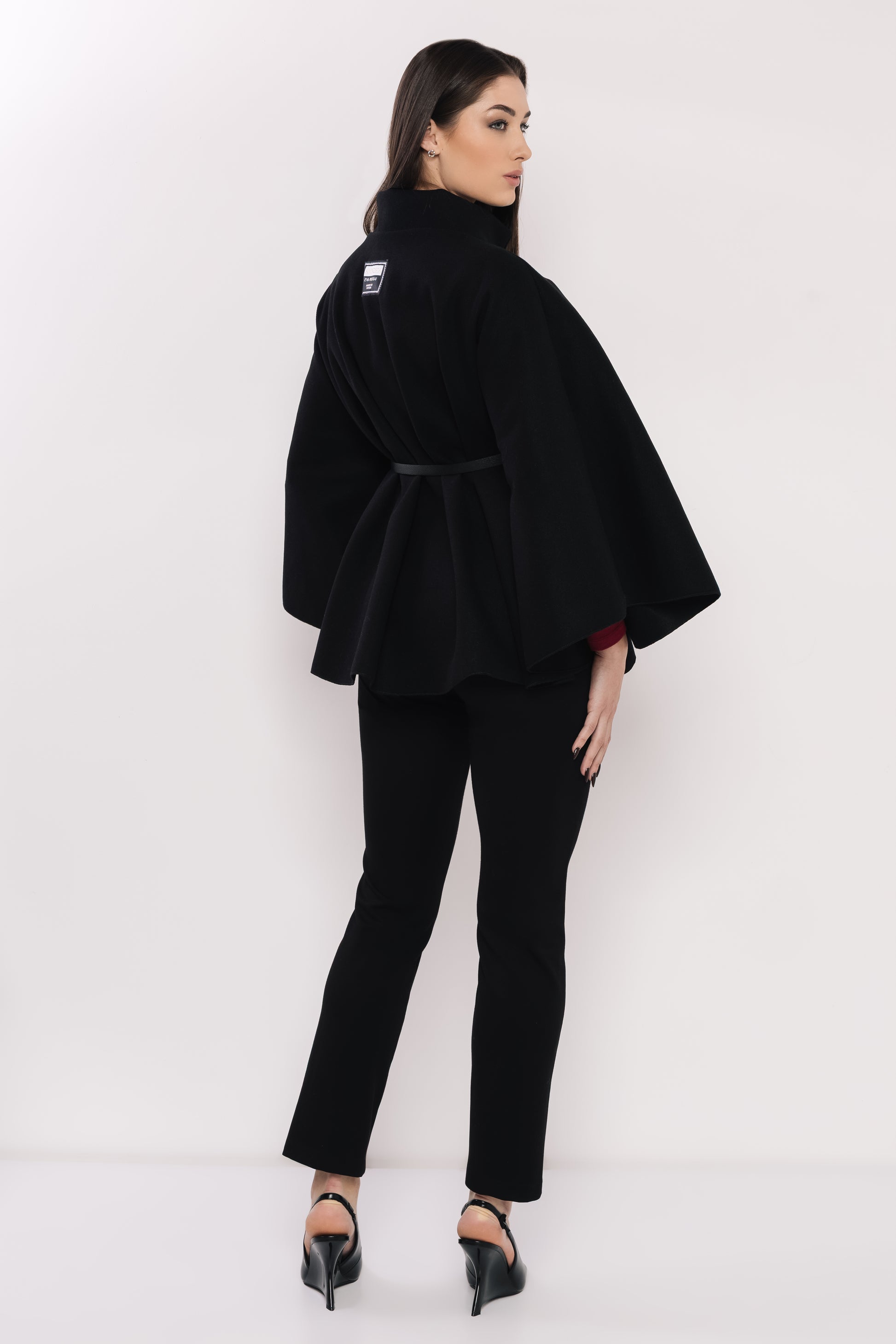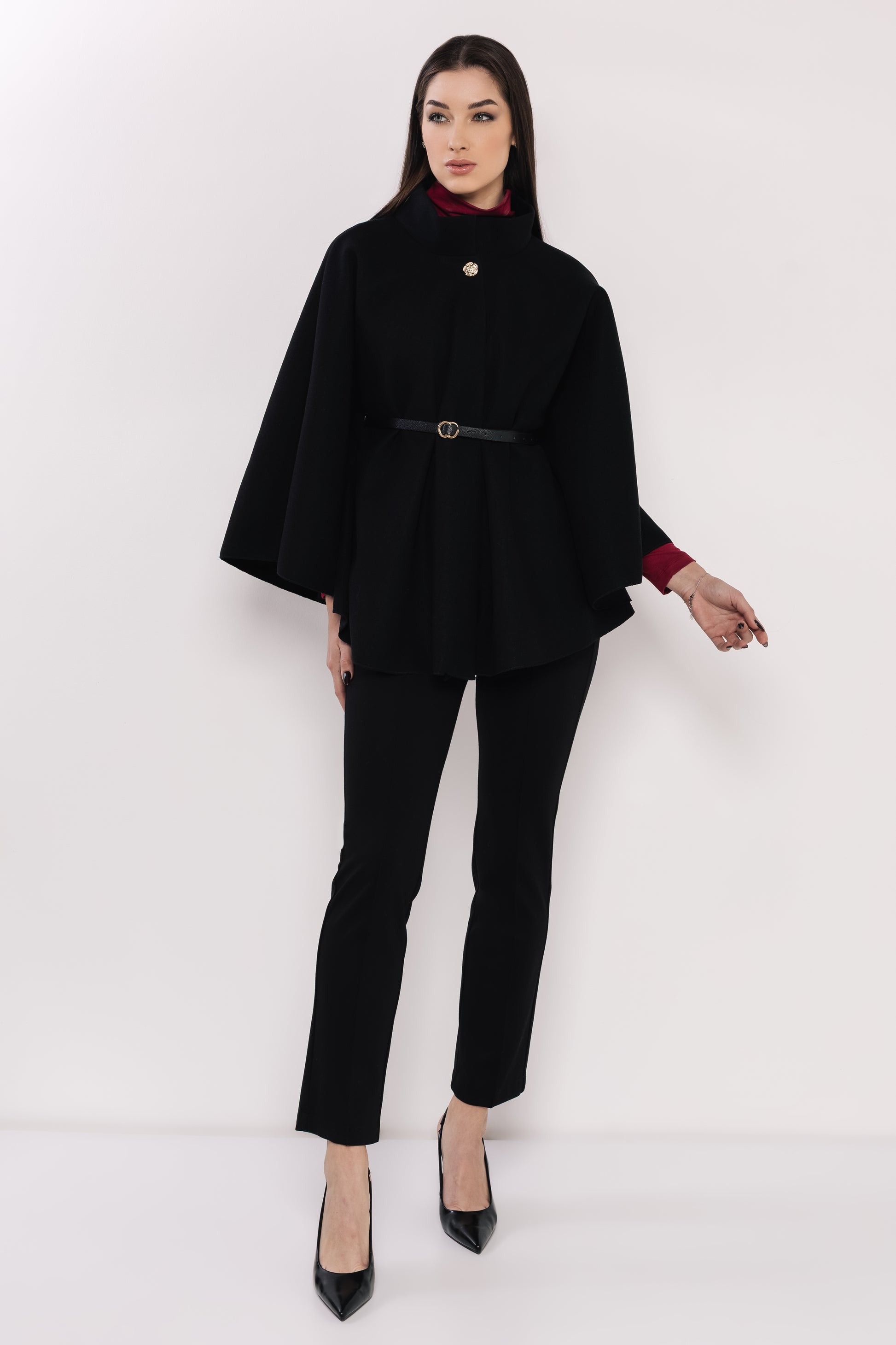 Az AMNESIA Riana öves pelerin egy igazi statement darab a hűvösebb napokra. Szövet anyaga lágyan omlik, a magas állógallér eleganciát sugall, míg a deréknál rögzített öv karcsúsított sziluettet biztosít a bő szabásnak.