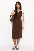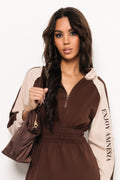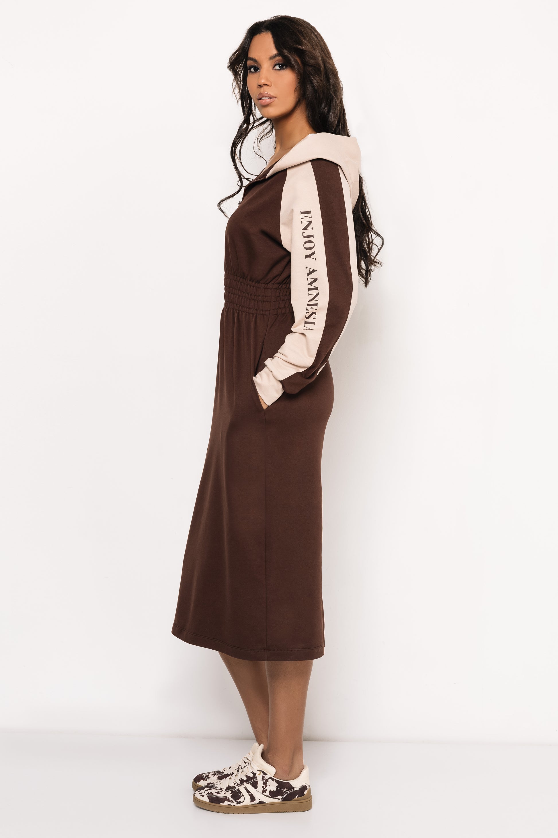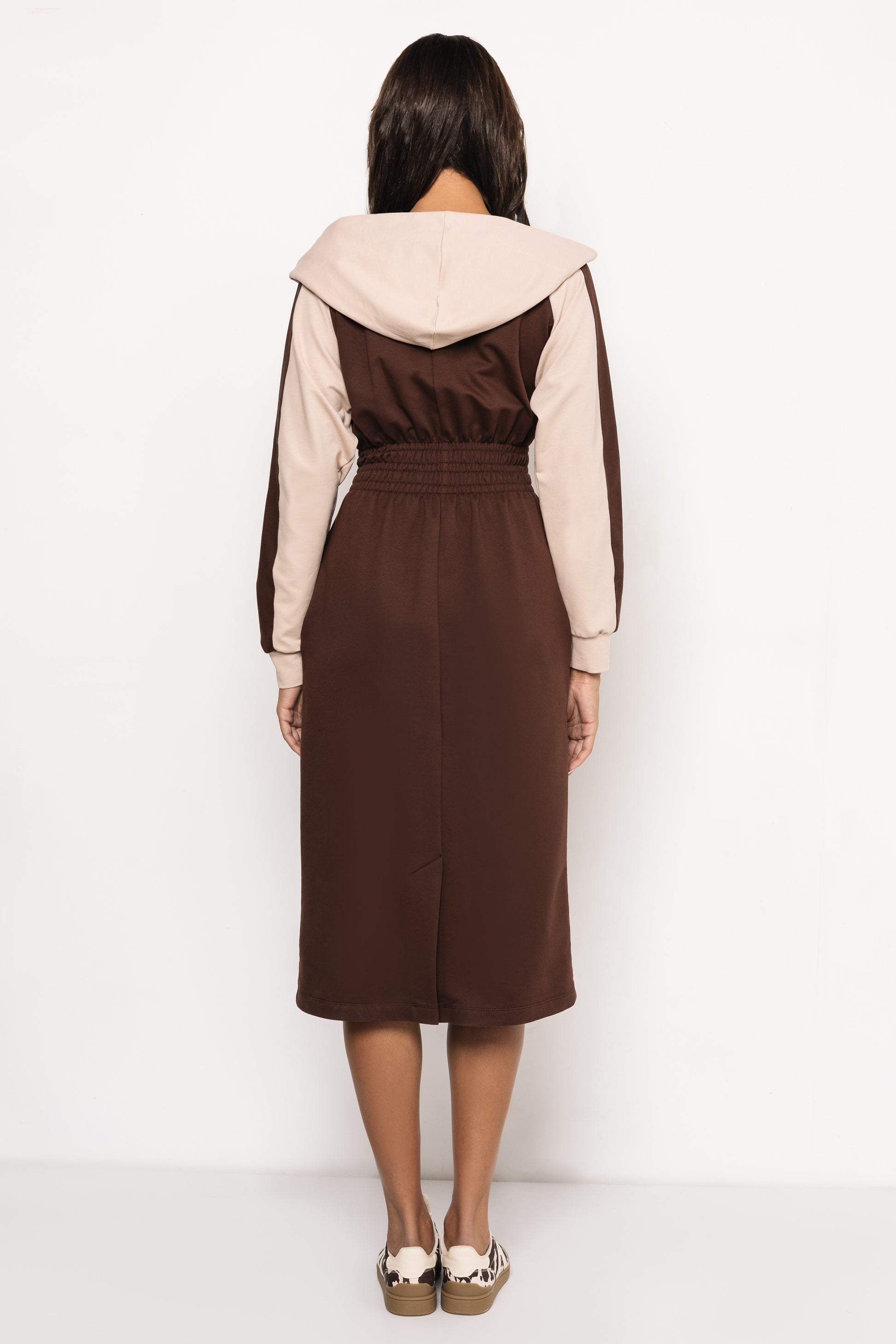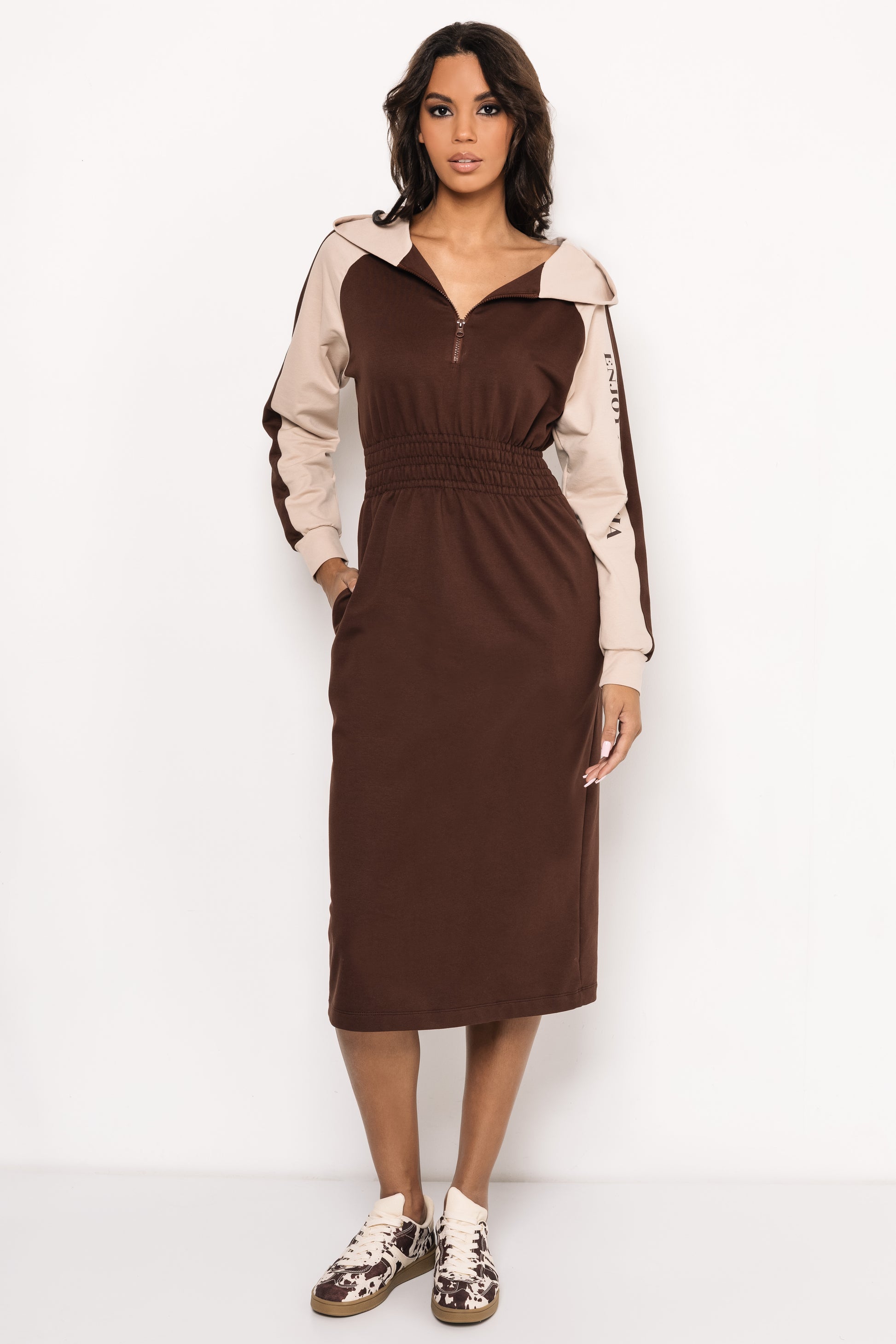 Az AMNESIA Zelia ruha sportos és nőies stílus tökéletes ötvözete. Könnyed futter anyagból készült, amely biztosítja a kényelmes viseletet a mindennapokban, ugyanakkor tartást ad a fazonnak. A barna-bézs színkombináció modern és letisztult, a vállrészről induló kontrasztos betétek és a kapucni sportos karaktert kölcsönöznek. Az elején található rövid cipzár praktikus és stílusos részlet, amely kiemeli a nyakrész kialakítását.