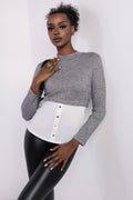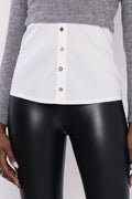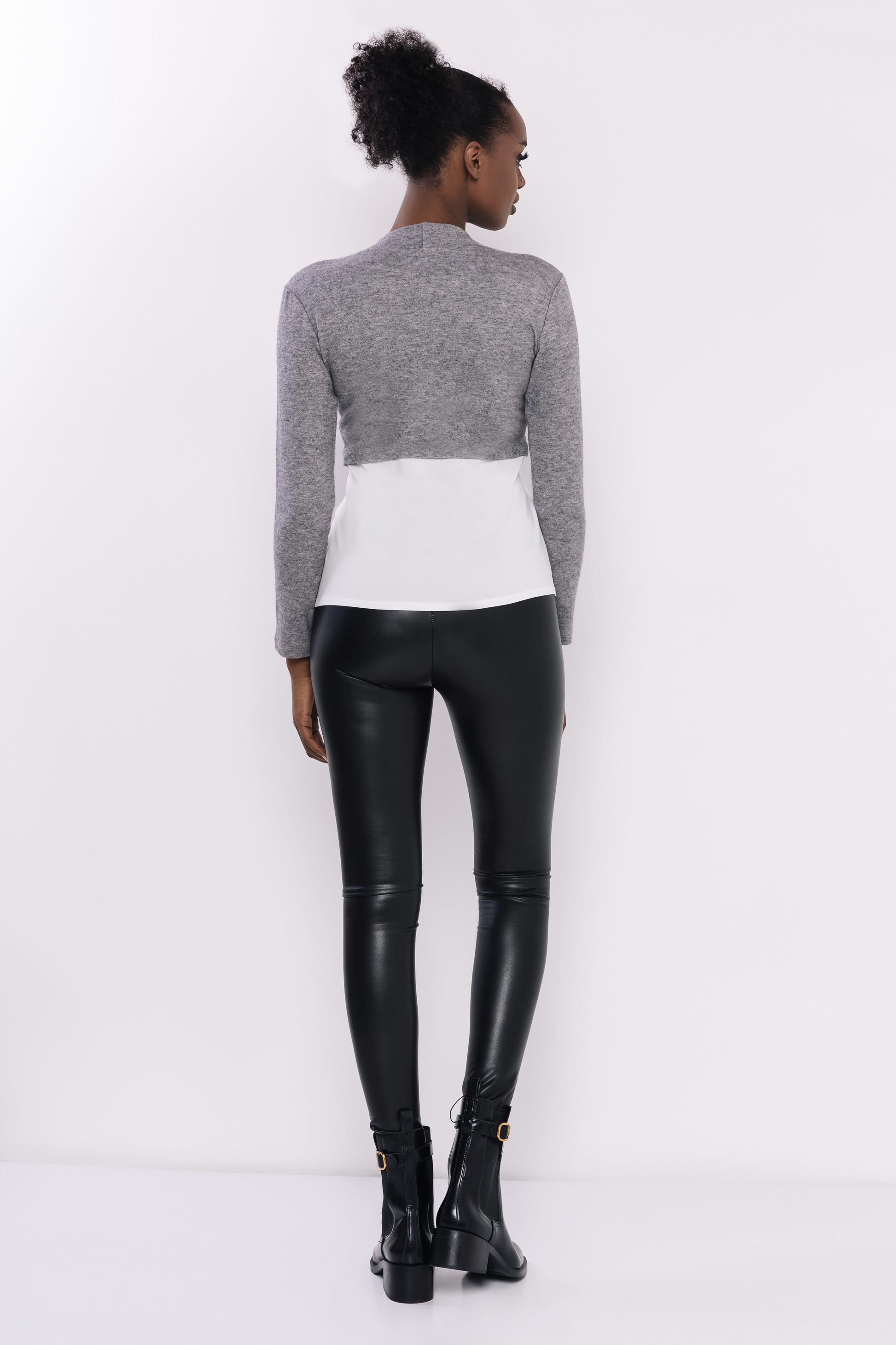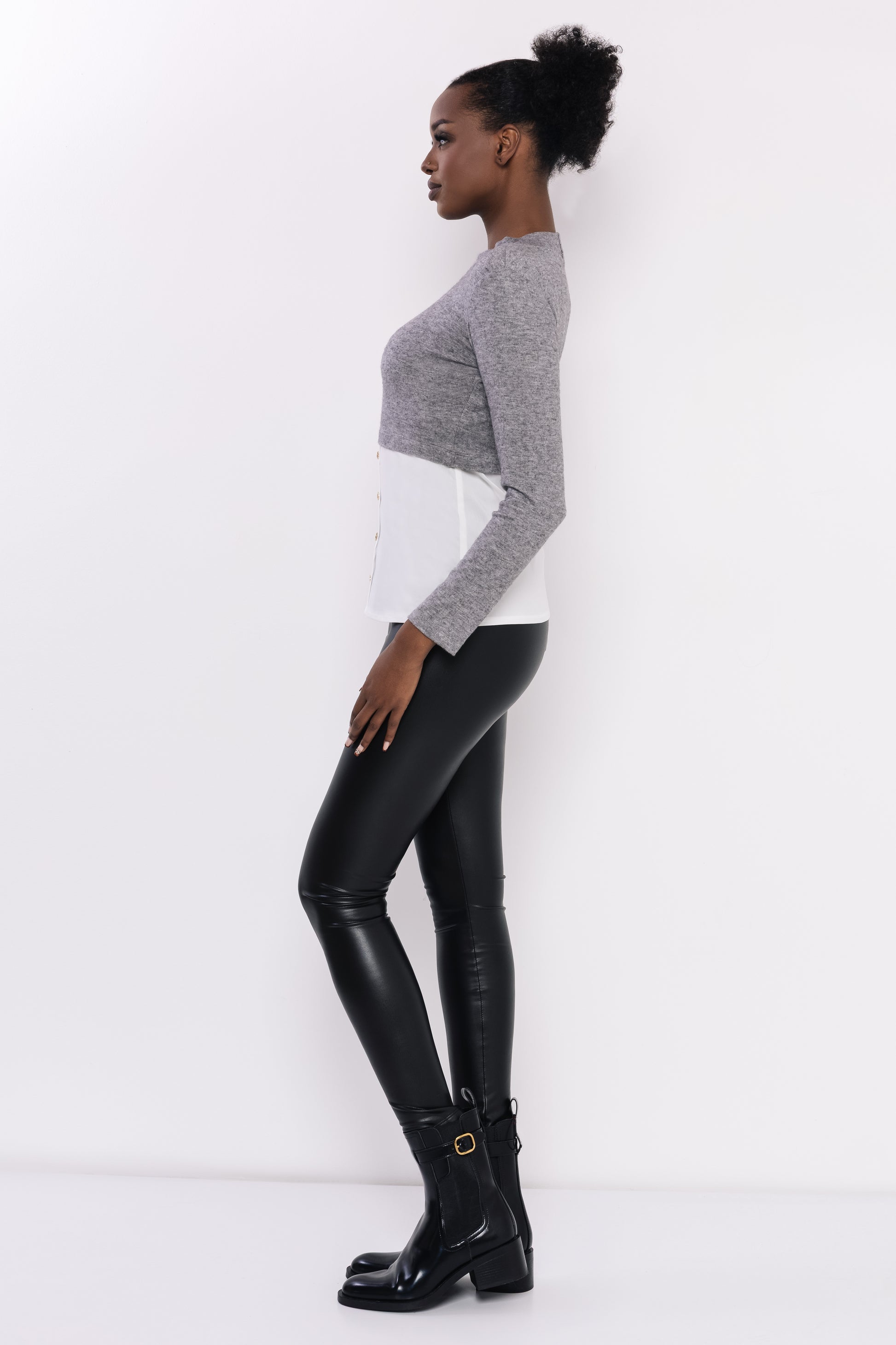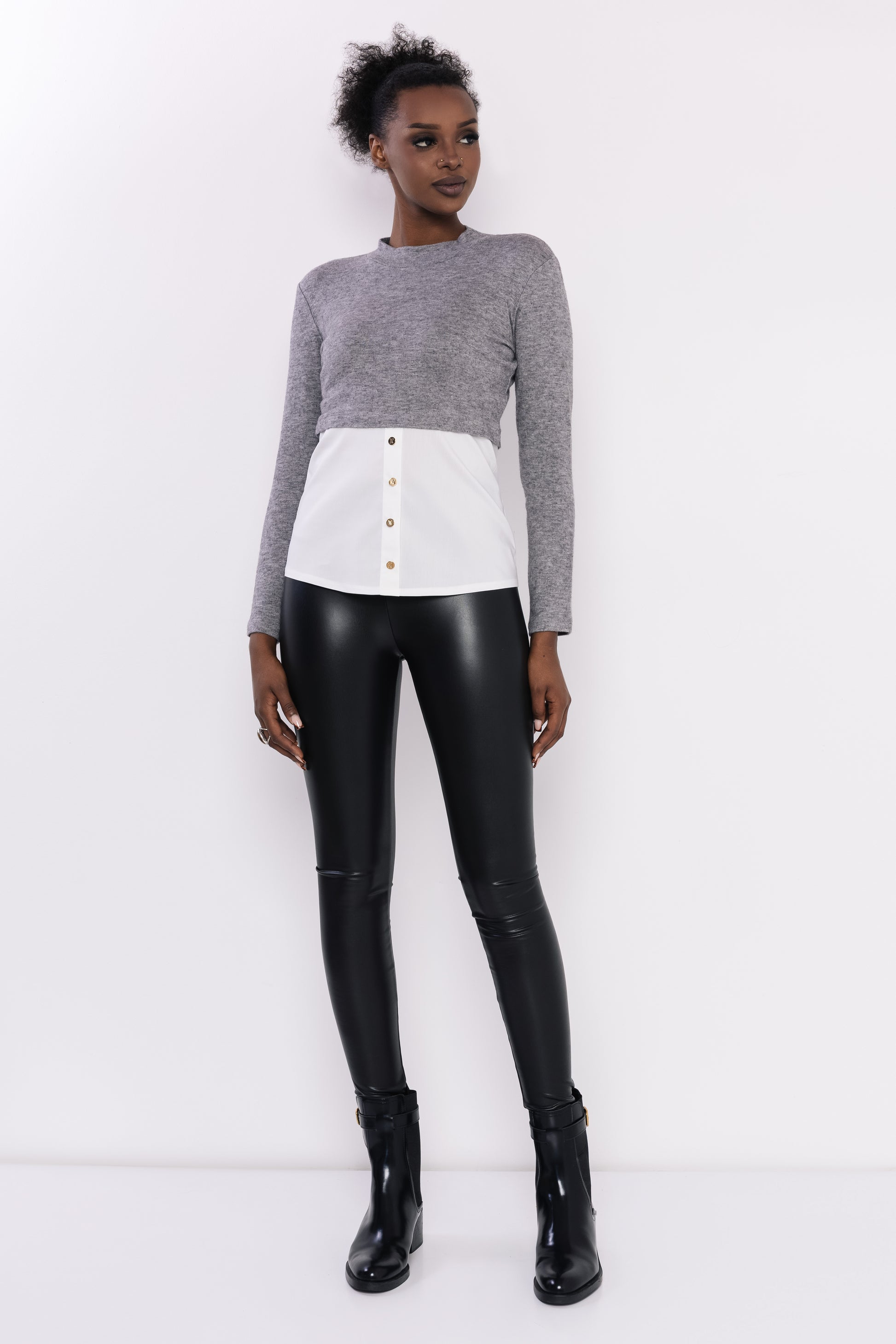 Az AMNESIA Aura felső játékos eleganciával ötvözi a klasszikus és modern elemeket. A felsőrész finom, rugalmas kötött anyagból készült, míg az alsó rész puha puplinból, amely inghatást kelt. A vállnál enyhén strukturált, a nyakrész pedig diszkréten magasított, így letisztult, mégis karakteres megjelenést biztosít. Az első aranygombok pedig elegáns részletként emelik ki a felső különlegességét. Tökéletes választás farmerrel egy laza, de sikkes hétköznapi szetthez, vagy kombináld bőrszoknyával és csizmával egy esti programhoz. A szürke-fehér és barna-homok árnyalatok mindkettője időtálló és könnyen variálható. Ez a felső a smart casual stílus új kedvence lesz – fedezd fel a kedvenc színed az amnesia.hu webshopon, és emeld vele a mindennapi megjelenésed!