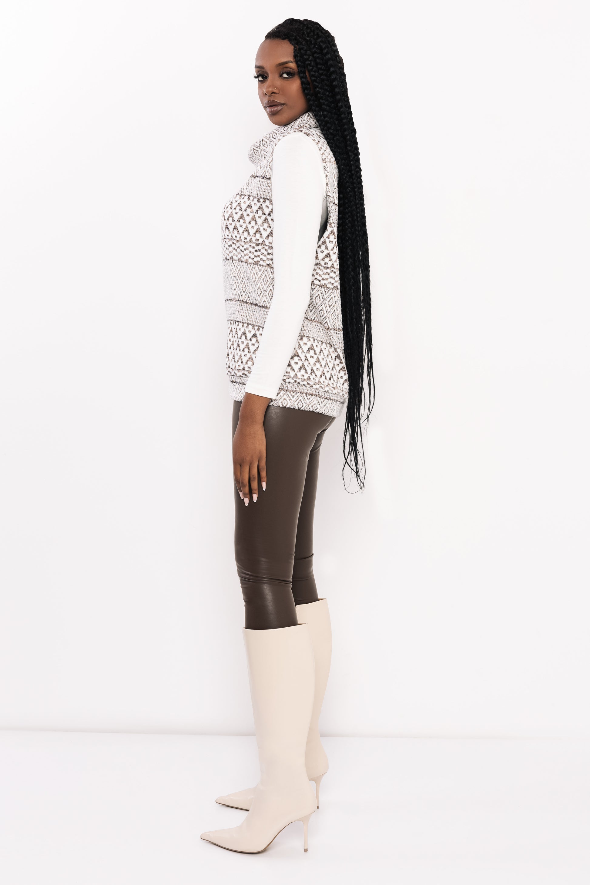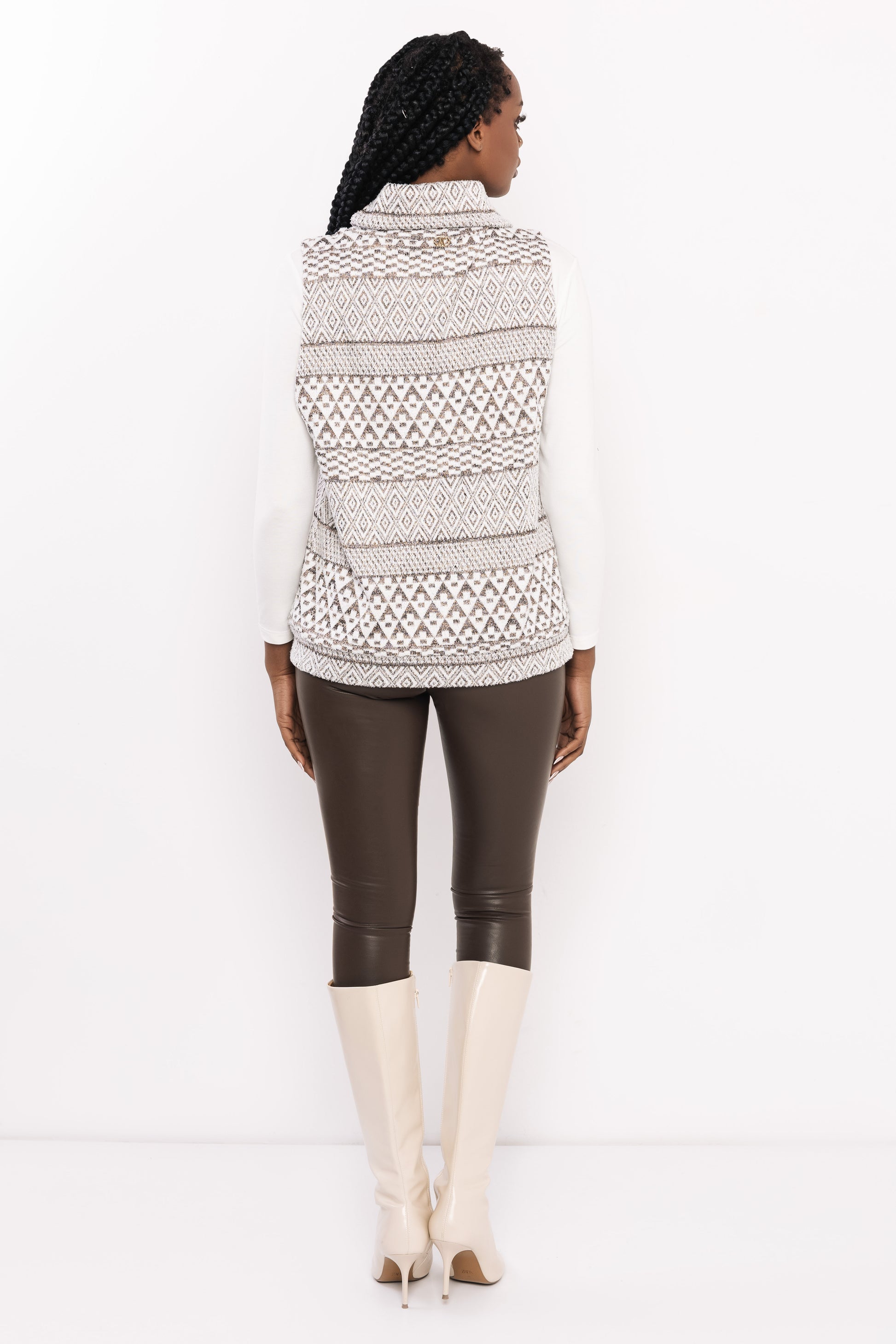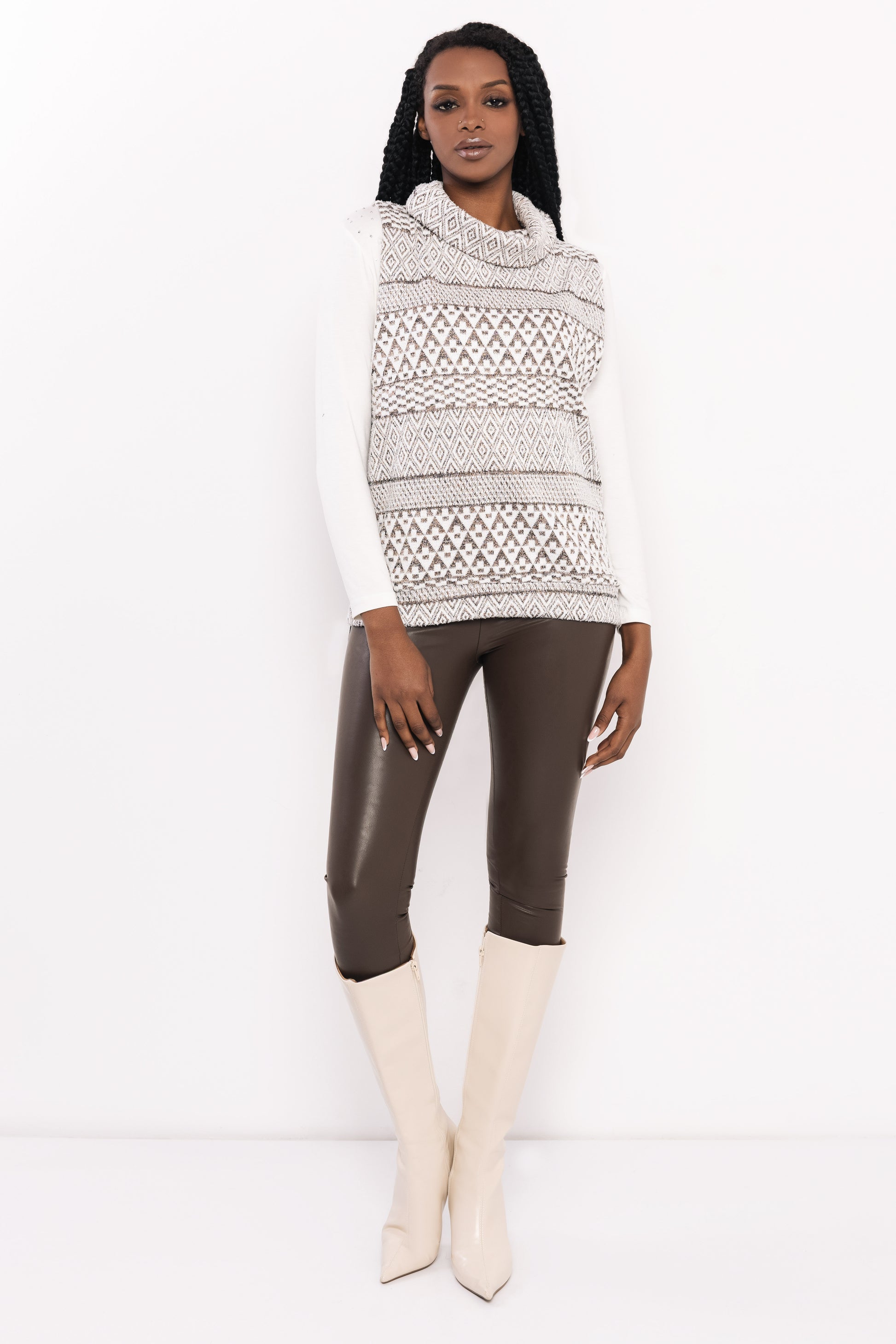 Az AMNESIA Luanda mellény geometrikus mintás kötött anyagával és kényelmes fazonjával hozza a téli szezon legmelegebb, cozy hangulatát. A lurexes szálak visszafogott csillogást adnak, amitől a darab egyszerre hétköznapi és elegáns. A fazon hosszabb, lezser vonalvezetésű, laza garbógallérral készül. Az ujj kényelmesen bő, így könnyen rávehető hosszú ujjú felsőre is, a kötött anyag pedig szépen követi a test vonalát anélkül, hogy tapadna. Az egyméretes kialakítás miatt többféle alkaton jól mutat, a geometrikus minta pedig optikailag nyújtja a felsőtestet. Styling tipp: viseld hosszú ujjú basic felső fölött, bőrhatású nadrággal és csizmával, vagy kombináld szűk farmerrel egy letisztult, hétköznapi outfithez. Egy hosszabb AMNESIA kabát alatt is kényelmesen elfér plusz rétegként. Válaszd ki az amnesia.hu webshopon, és legyen egy mellényed, ami biztosan sokat kerül majd elő a hidegebb napokon.