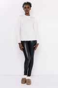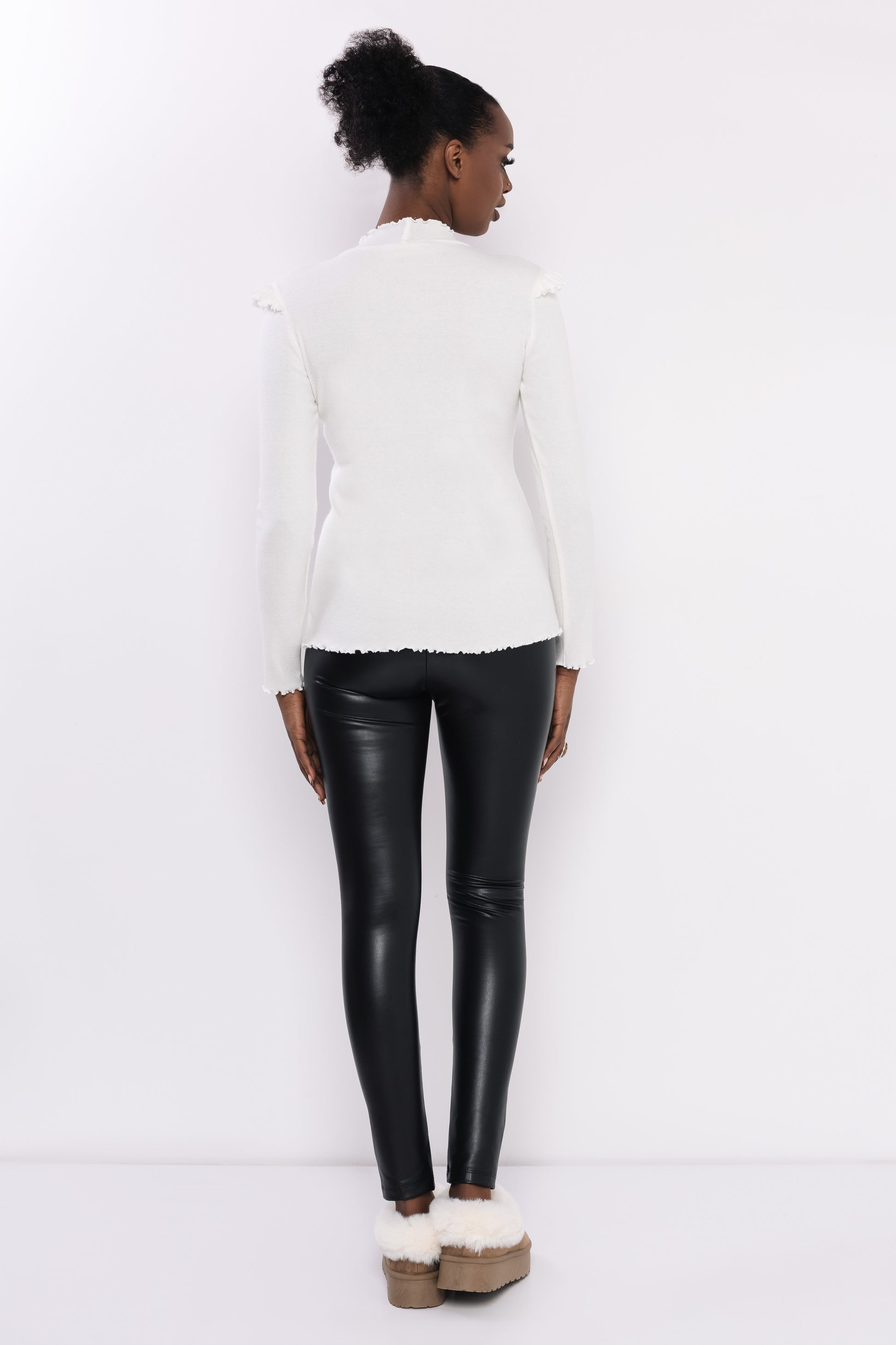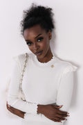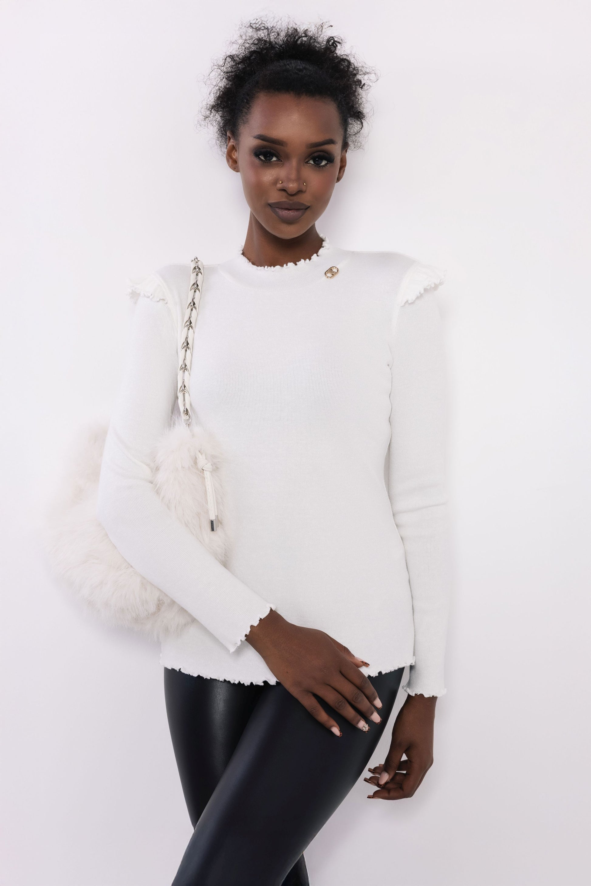 Az AMNESIA Polen felső a nőies részletek és a letisztult elegancia találkozása. Finom, vékony kötött anyaga lágyan követi a test vonalait, miközben a vállán és a gallérján lévő apró fodros szegély játékos, mégis kifinomult megjelenést ad. A kerekített nyakrész elegánsan keretezi az arcot, a diszkrét logódísz pedig visszafogottan hangsúlyozza a márka stílusát. Tökéletes választás farmerrel a hétköznapokra, de kombinálhatod bőrszoknyával vagy blézerrel is, ha irodai sikkre vágysz. Az ekrü és fangó árnyalat könnyedén illeszkedik bármely őszi-téli ruhatárba. Ez a felső igazi alapdarab, amit mindig újra előveszel majd – válaszd ki kedvenc színed az amnesia.hu webshopon, és frissítsd vele a szezonális gardróbod!