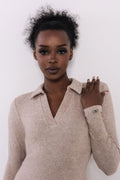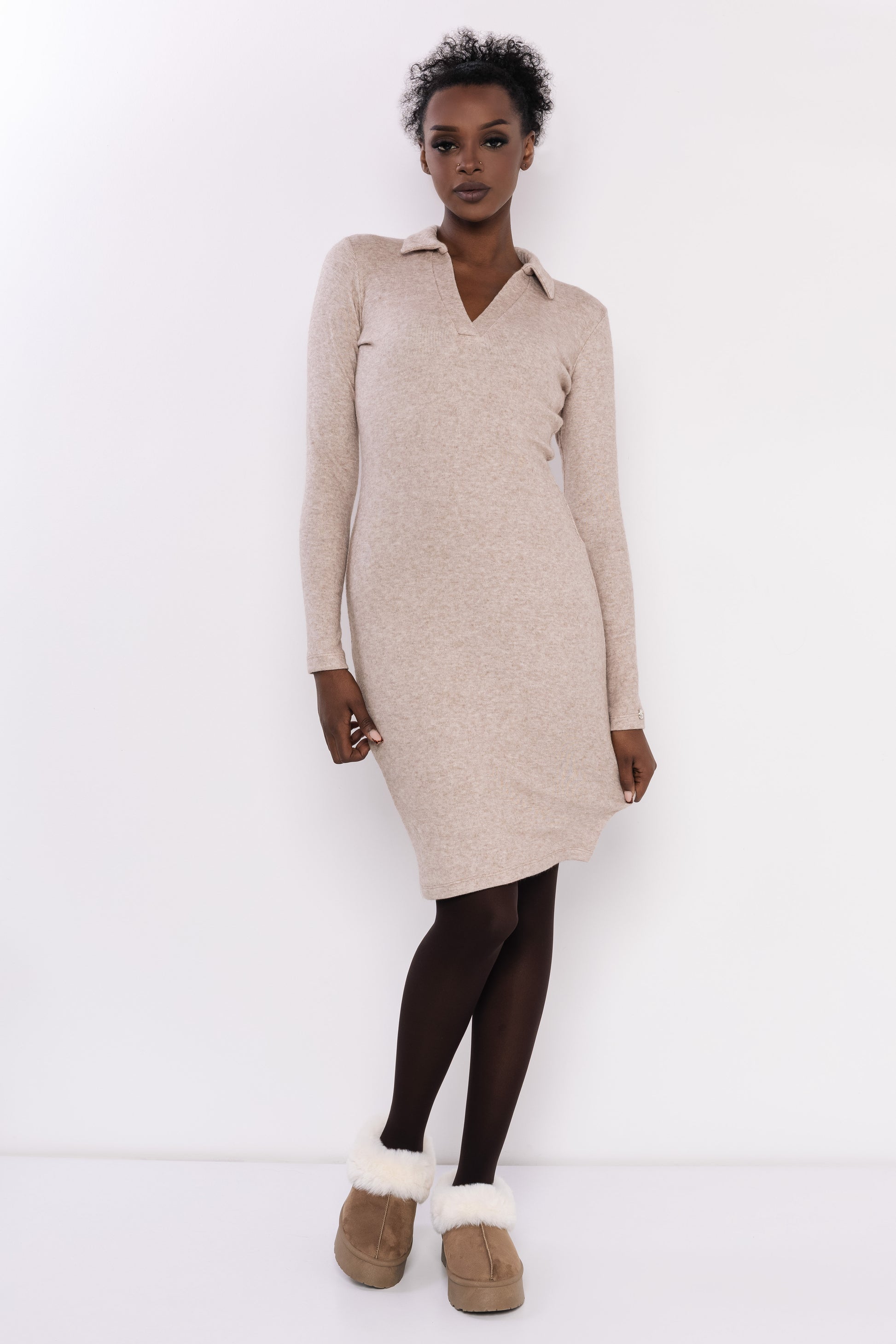 Az AMNESIA Visual ruha a letisztult elegancia és a kényelmes nőiesség tökéletes kombinációja. A finom, vékony kötött anyag lágyan simul a test vonalaira, miközben a galléros, V-kivágású nyakrész klasszikus és modern hatást kelt egyszerre. A hosszú ujjú, enyhén karcsúsított fazon optikailag nyújtja az alakot, így minden testalkaton előnyösen mutat. Viseld csizmával és övvel a mindennapokra, vagy kombináld sportcipővel és kabáttal egy lazább, városi összeállításhoz – a bézs árnyalat sokoldalúságának köszönhetően bármilyen stílusba könnyen beilleszthető. Ez a ruha a hétköznapi elegancia kulcsdarabja – fedezd fel az amnesia.hu webshopon, és tedd teljessé vele az őszi-téli ruhatárad!