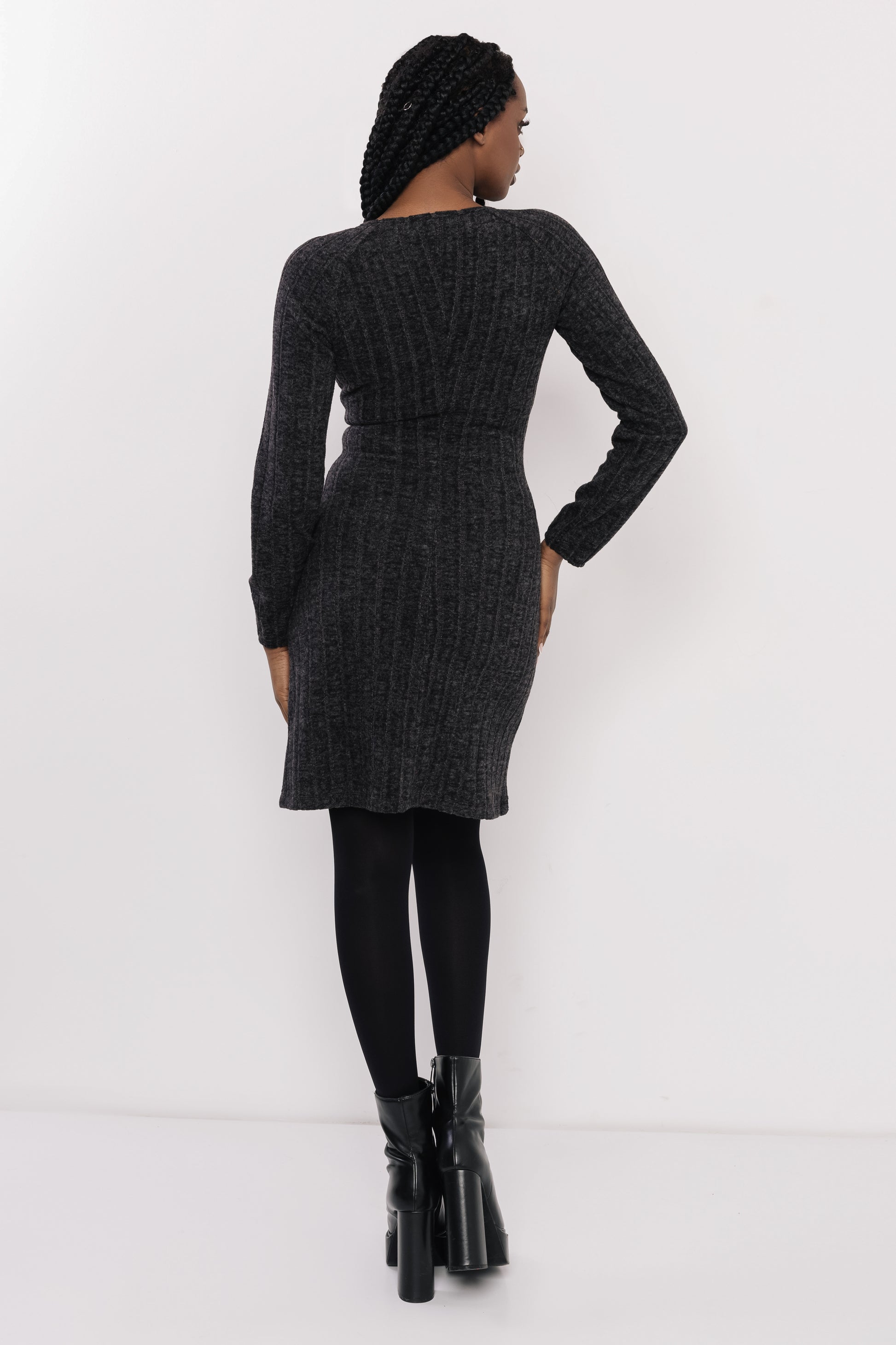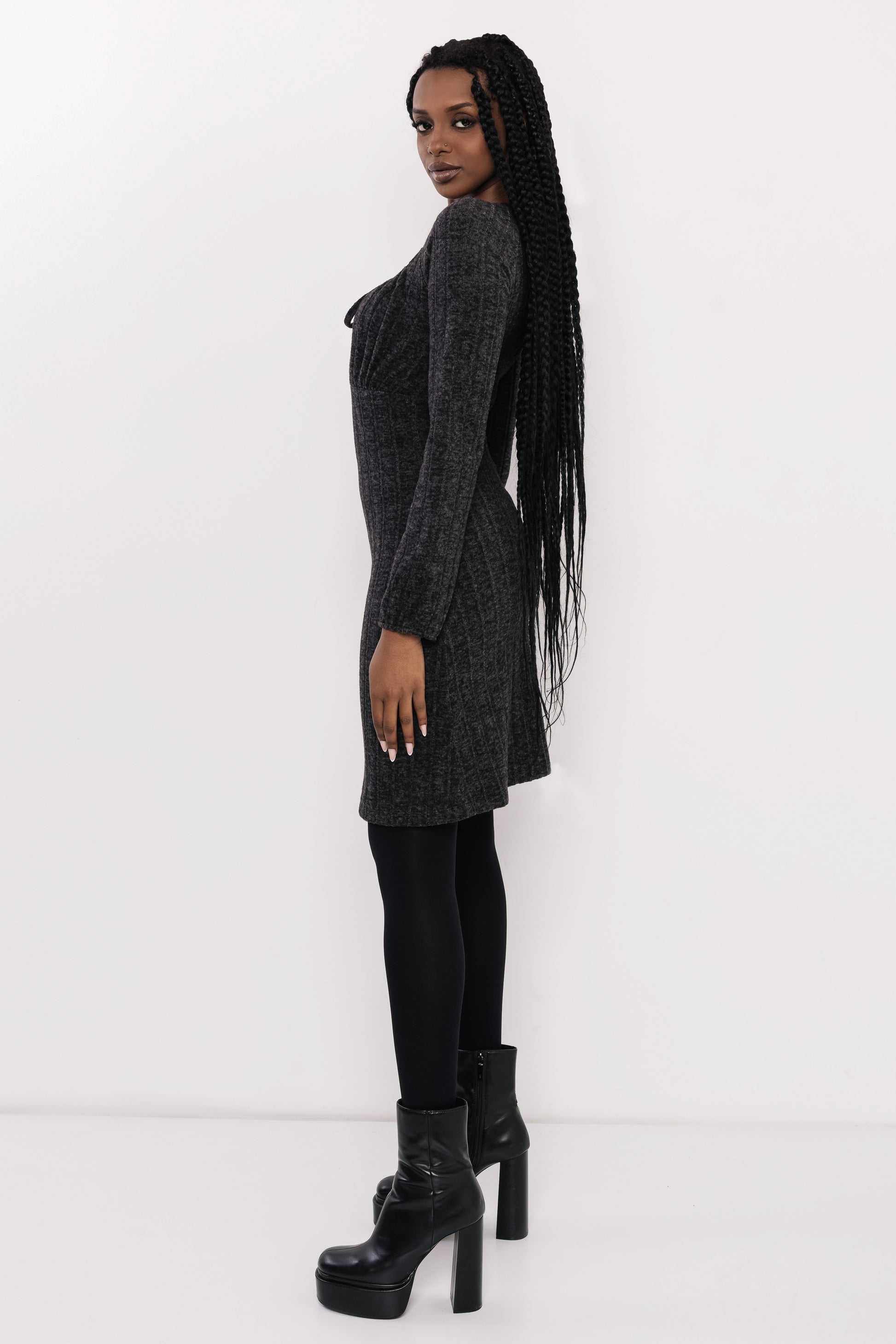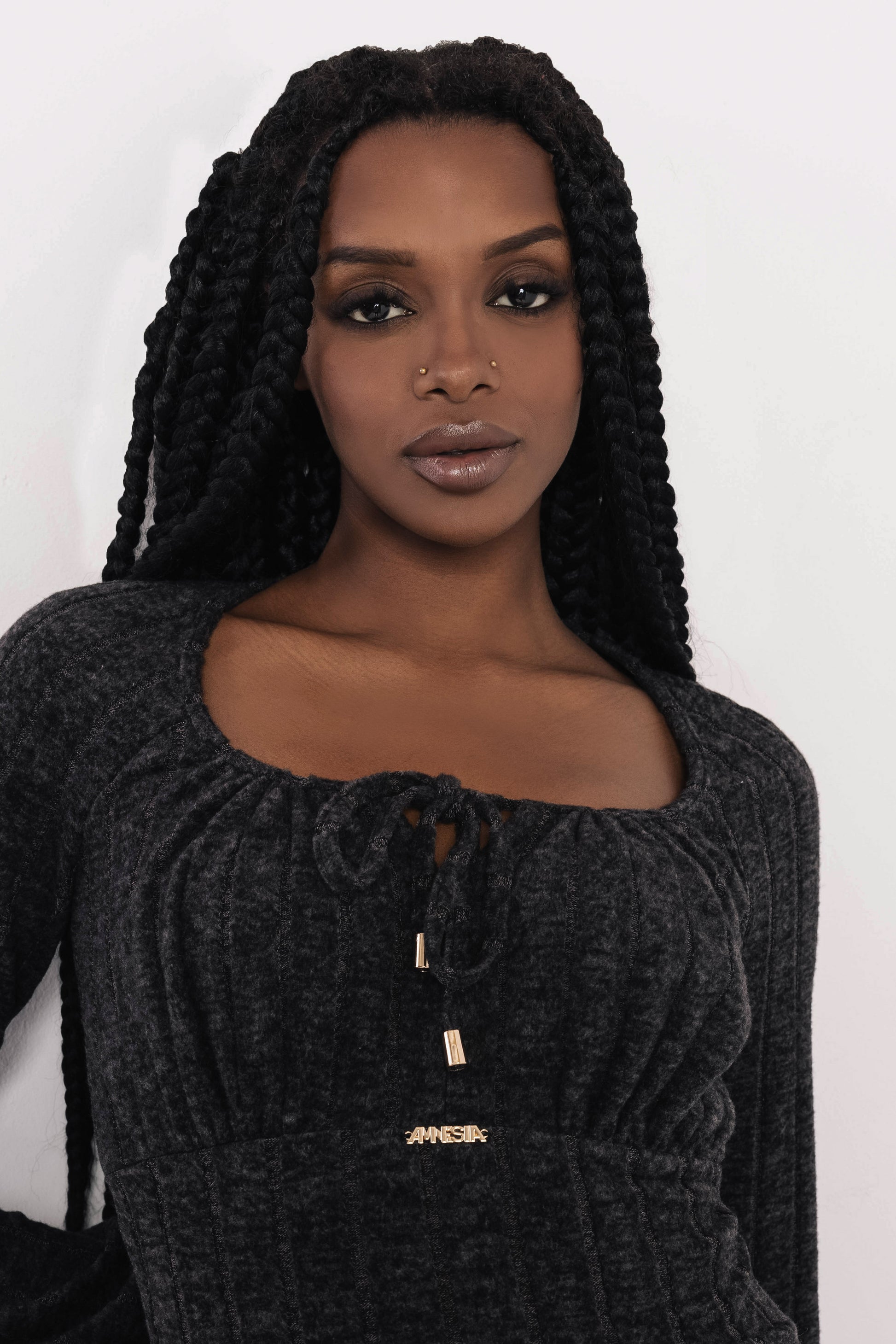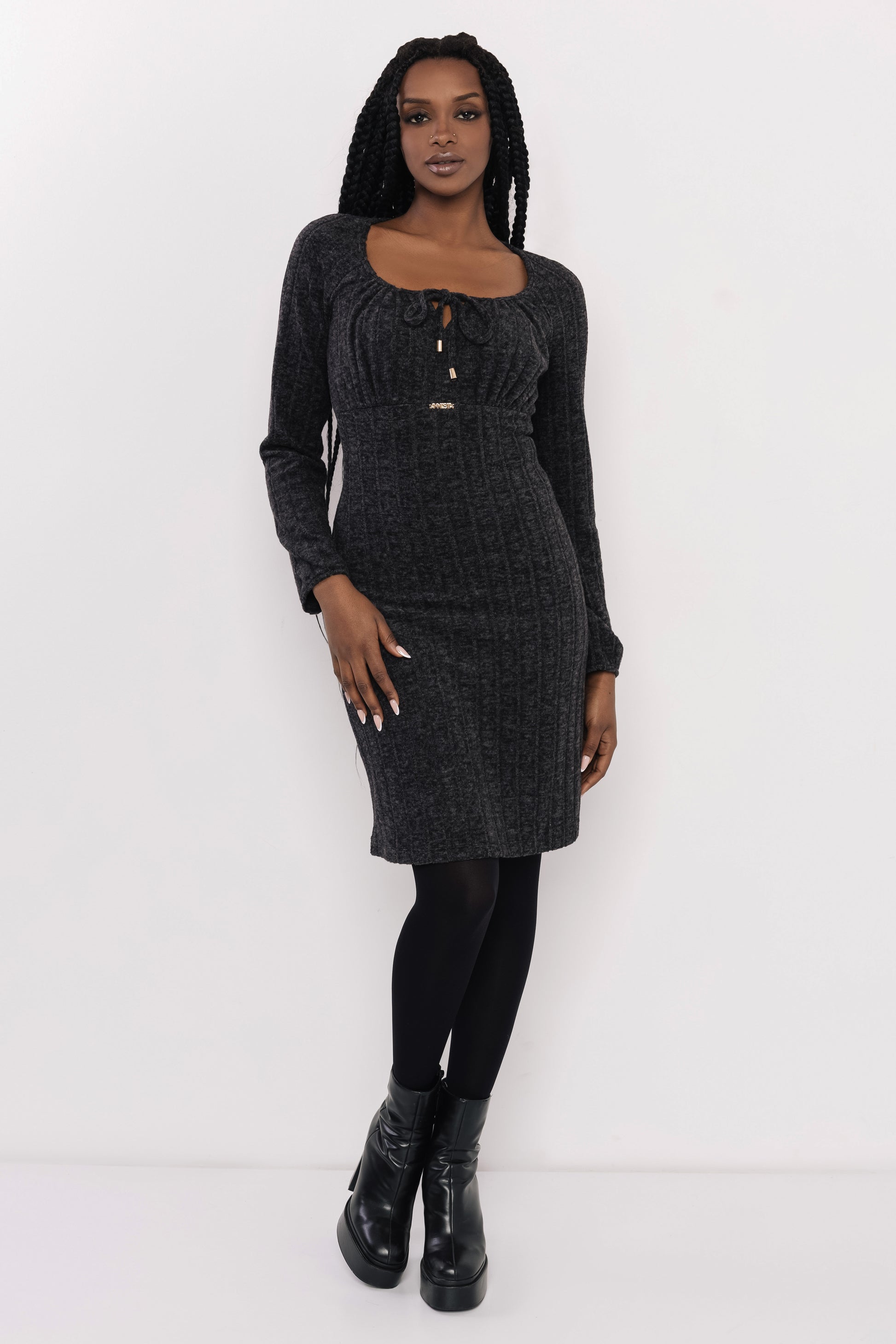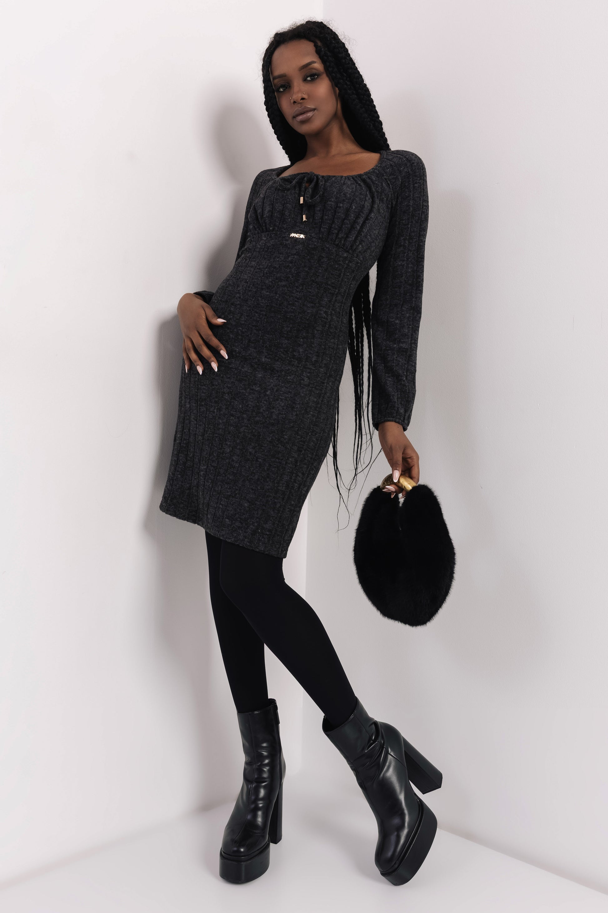 Az AMNESIA Gvenda ruha a nőies eleganciát és a kényelemes viseletet egyesíti. Bordás kötött anyagának köszönhetően rugalmasan követi az alakot, a kerek nyakkivágás és a mellrész megkötős részlete különleges, romantikus megjelenést ad. Hosszú ujja és térdig érő fazonja ideális a hűvösebb napokra, akár magassarkúval, akár csizmával viseled. Kombináld vagány platformcsizmával és műszőrme táskával, vagy viseld elegáns bokacsizmával és hosszú kabáttal egy esti programhoz.