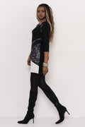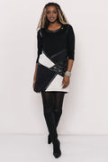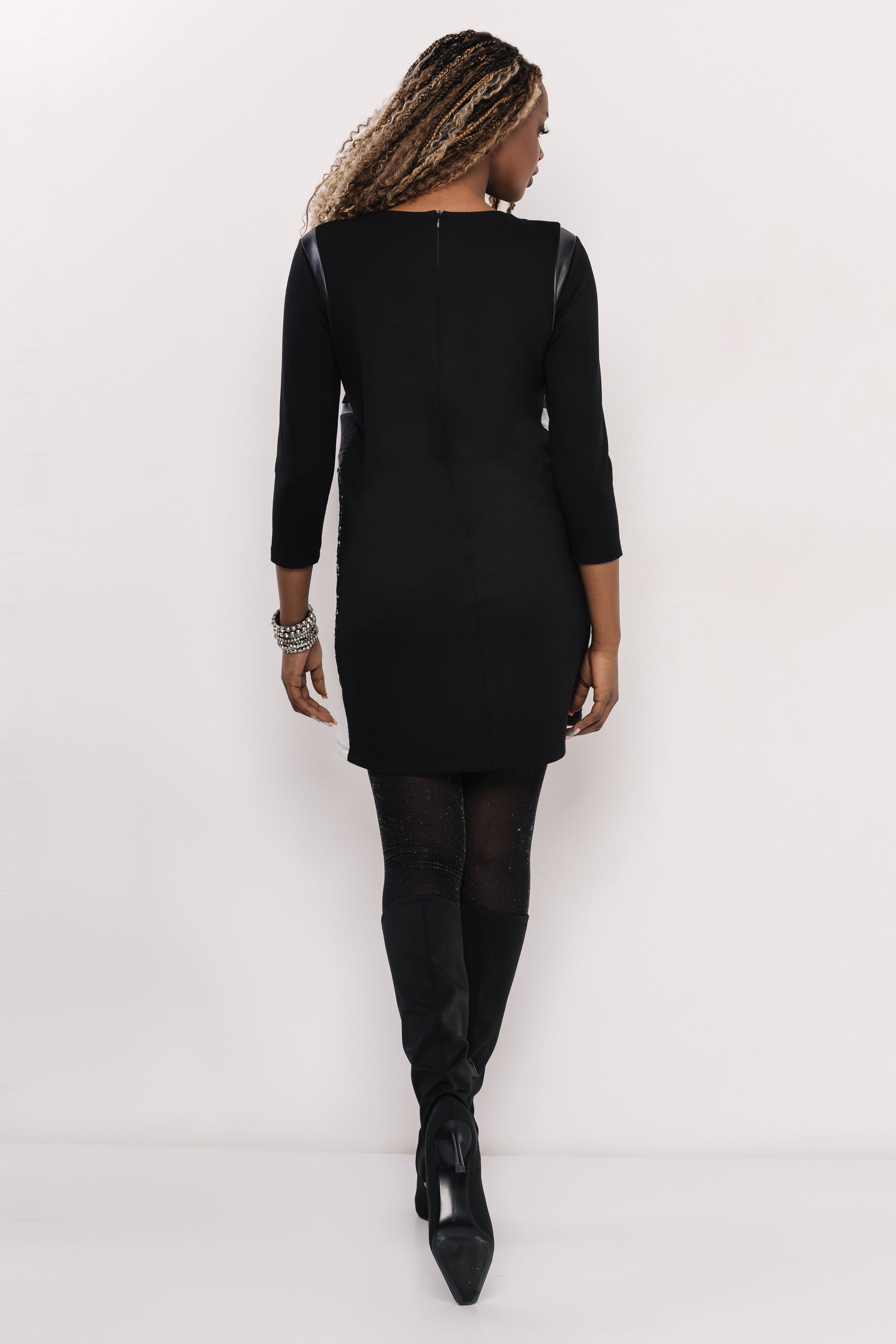 Az AMNESIA Newland ruha egy letisztult, elegáns darab, amely az AMNESIA jól ismert stílusát hozza. Fekete színe és átgondolt szabása időtálló megjelenést ad, így alkalmi és esti viseletként is biztos választás. Nem akar több lenni annál, ami: egy nőies, karakteres ruha magabiztos nőknek. A tartuffino alapanyag kényelmes viseletet ad, miközben a különböző betétek – műbőr és flitter – tagolják a felületet. Ezek a részletek szép egyensúlyt alkotnak. Önmagában is elég erős darab, de letisztult fekete kiegészítőkkel még jobban érvényesül. Harisnyával és csizmával, kifejezetten jó választás esti programra vagy alkalmi eseményre.