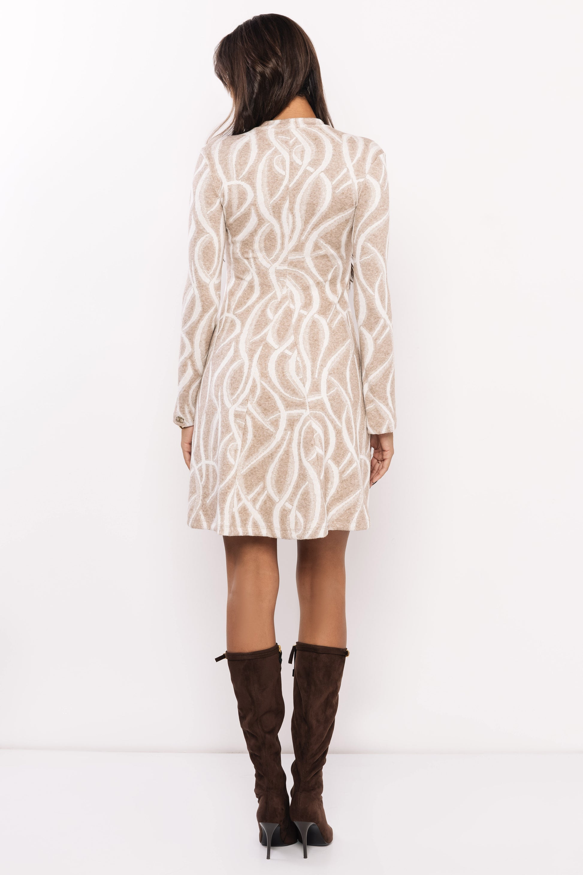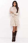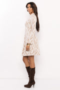 Az AMNESIA Nolen ruha egy elegáns, mégis kényelmes jacquard anyagú darab, amely különleges mintájával és visszafogott vonalvezetésével tűnik ki. Az alacsony állógallér és a bővülő ujjak kifinomult, nőies karaktert adnak. A puha, vastagabb textúra lágyan követi a testet, miközben szép alakot sejtet. Viseld barna csizmával és arany kiegészítőkkel, ha elegáns, mégis természetes megjelenésre vágysz, vagy kombináld bőrdzsekivel és bokacsizmával egy modern, városi szetthez. A bézs–ekrü mintás anyag minden bőrtónushoz illik, és elegánsan kiemeli a szezon színeit. Ez a ruha az elegancia és kényelem tökéletes találkozása – fedezd fel az amnesia.hu webshopon, és engedd, hogy a Nolen ruha legyen az új kedvenc őszi-téli darabod!