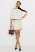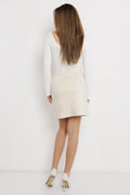 Az AMNESIA Mirta szoknya a bézs árnyalatú velúr műbőr eleganciájával nőies megjelenést ad. Rövid fazonja fiatalos, mégis kifinomult, így könnyedén beilleszthető a hétköznapi és alkalmi gardróbba is. Egy olyan darab, amely egyszerre trendi és klasszikus. Velúr műbőr anyaga puha tapintású, enyhén rugalmas, így kényelmes viselet egész napon át. A szabás finoman követi a test vonalát, fém gombos részletei pedig elegáns hangsúlyt adnak. S, M és L méretben készül bézs színben. Viseld egy egyszerű bodyval vagy az AMNESIA Toszka felsővel az irodába, este pedig egy karakteres felsővel és magassarkúval. Csizmával, bokacsizmával vagy klasszikus tűsarkúval is jól működik.