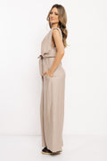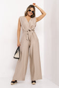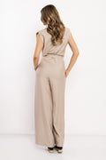 Lenvászon anyaga természetes, légies és kellemes viselet melegebb napokon is. Ujjatlan felsőrésze és V-kivágása szépen nyújtja az alakot, míg a saját anyagából készített öv nőies hangsúlyt ad. A bő szárú nadrág komfortos viseletet, a zsebek pedig praktikumot biztosít. Hullámos barna, fekete és fango színben érhető el, egyméretes kivitelben.