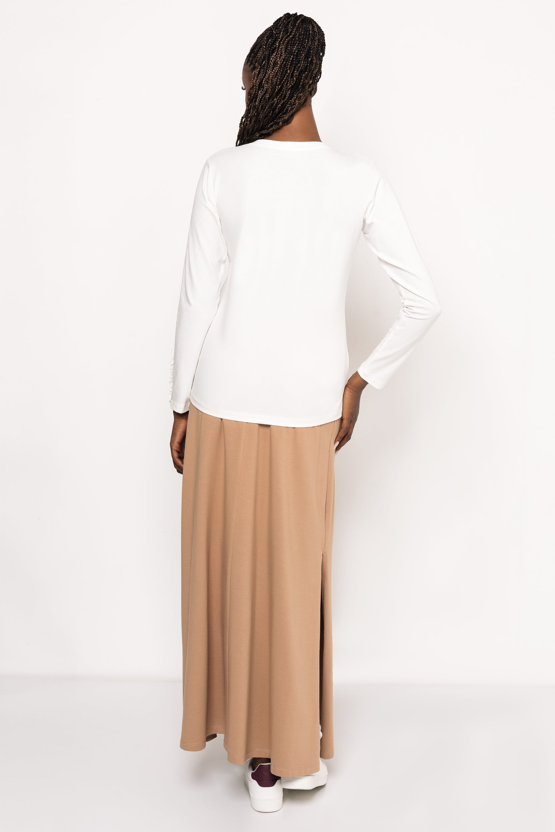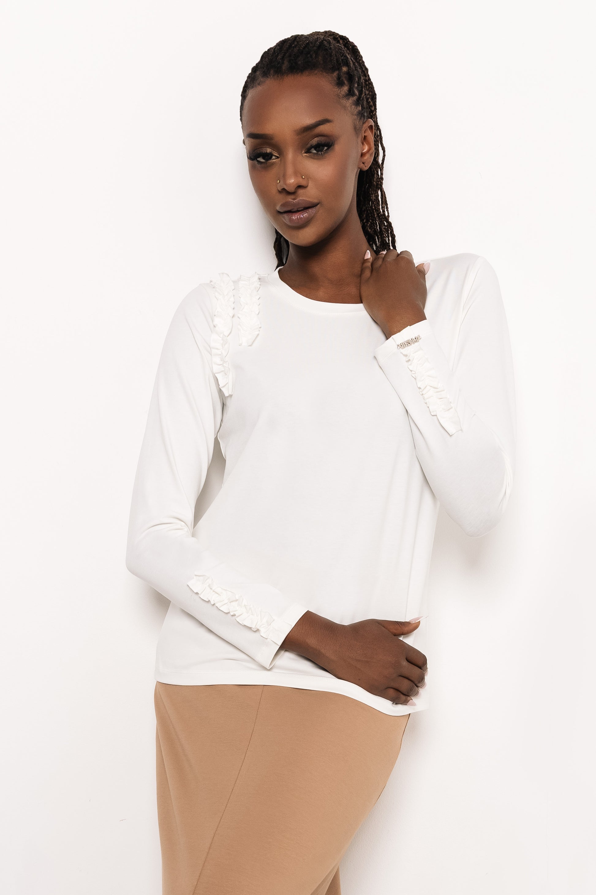 Az AMNESIA Calabri felső egy különleges darab, amely a pamut természetes komfortját ötvözi a nőies részletekkel. A hosszú ujjú, egyméretes fazont a vállnál és az ujjakon végigfutó díszített fodrok teszik igazán egyedivé, finom játékosságot csempészve a letisztult szabásba. A kerek nyakkivágás klasszikus megoldás, amely elegánsan keretezi a felsőrészt, miközben a letisztult vonalak minden testalkaton szépen mutatnak. A Calabri felső ekrü, vaj és kávé árnyalatban elérhető, így könnyen beilleszthető a mindennapi és az alkalmi szettekbe is. A természetes pamut anyag légáteresztő és kényelmes, ezért ideális választás hosszú napokra, amikor fontos a stílus és a komfort harmóniája. Viseld az AMNESIA Zila nadrággal vagy a Lazil szoknyával letisztult, nőies hatásért, de sportosabb összeállításban az AMNESIA Puato nadrággal is tökéletes választás. Az AMNESIA Calabri felsőt beszerezheted az amnesia.hu webshopon, amíg elérhető!