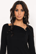 Egyméretes fazonja rugalmasan illeszkedik többféle testalkatra, így ideális választás mindennapi eleganciához vagy alkalmi megjelenéshez. A hosszú ujj és a letisztult szabás kiegyensúlyozza a különleges nyakkivágás játékosságát, így harmonikus, mégis egyedi hatást kelt.