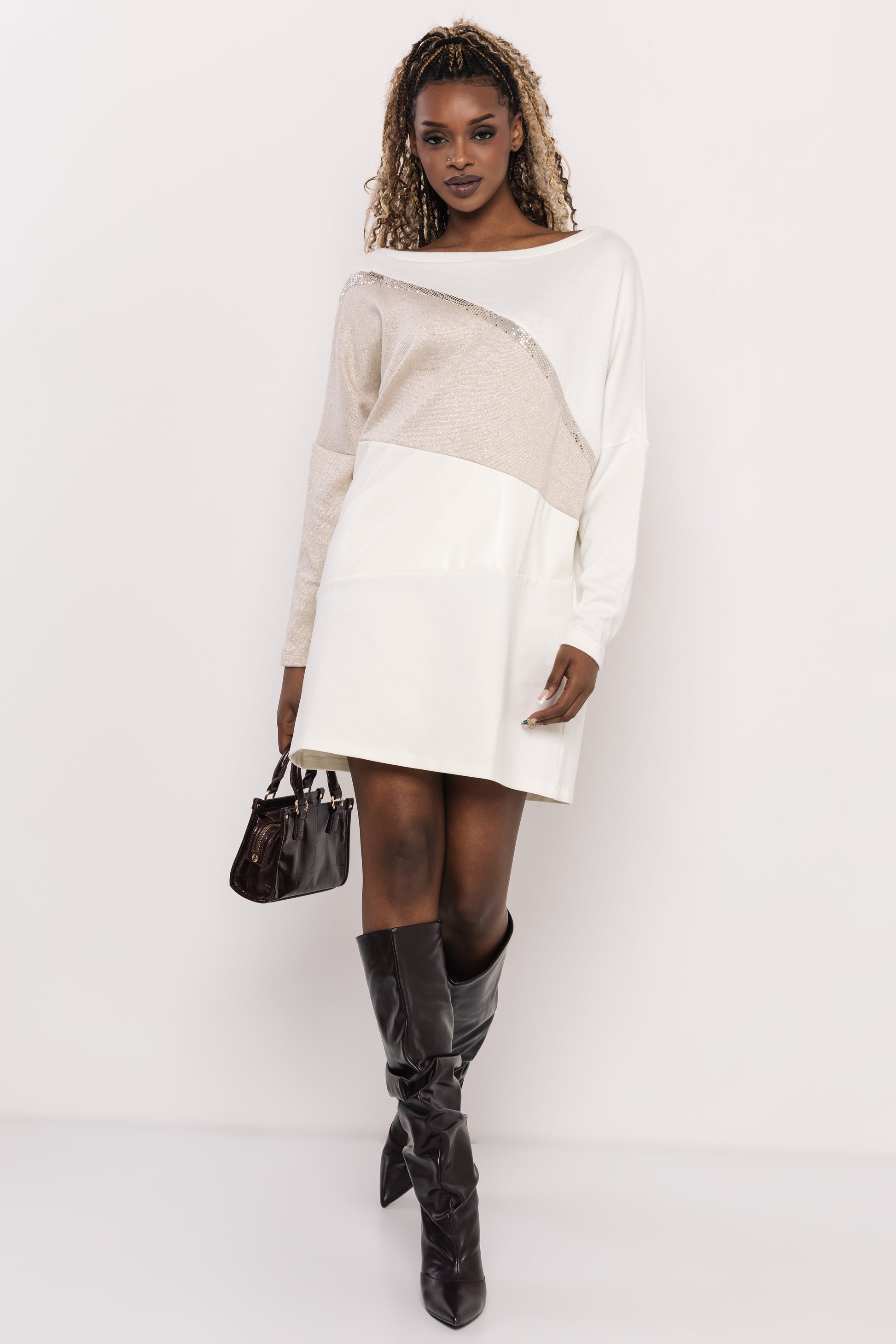 Az AMNESIA Namil tunika finom kötött anyagból készült, amelyet flitter és bőr betétek tesznek igazán különlegessé. Nőies, bő fazonjának köszönhetően minden alkaton előnyösen mutat, így tökéletes választás, ha stílusos és kényelmes darabra vágysz!