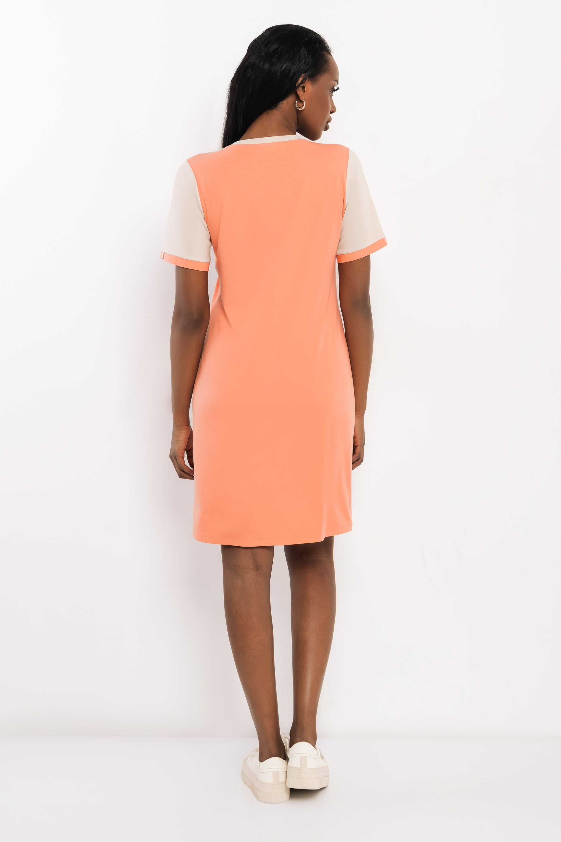 Az AMNESIA Anzi ruha friss, nyári hangulatú darab, amely a kontrasztos színkombinációval azonnal feldobja a megjelenésed. Laza szabása könnyed, nőies hatást ad, amit egész nap szívesen viselsz. A vékony punto anyag könnyű, rugalmas és kellemes viselet, nem tapad, mégis szépen követi az alakot. Narancs-bézs színben érhető el, egyméretben, ami több alkaton is jól mutat. Viseld sportos cipővel egy laza nappali szetthez, vagy kiegészítőkkel feldobva akár városi programokra is tökéletes választás. Szerezd be az amnesia.hu webshopon, amíg elérhető!