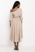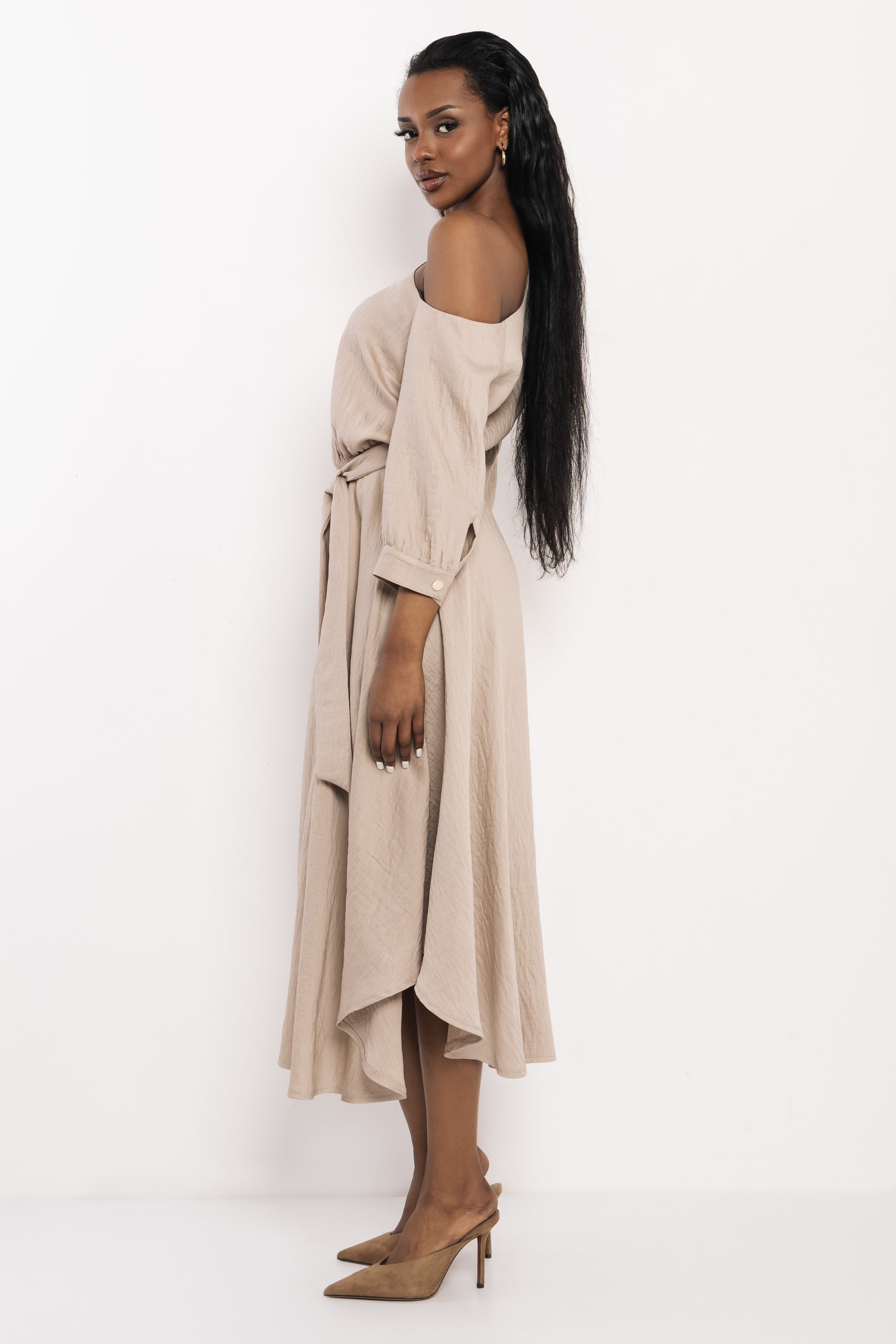 Azonnal magára vonja a tekintetet finoman nőies AMNESIA Asztrid ruha, amely tökéletes választás a hétköznapokhoz és különlegesebb alkalmakhoz is. Lenvászon anyaga könnyű, jól szellőző és természetesen texturált, ami még karakteresebbé teszi az összhatást. Az aszimmetrikus, vállat szabadon hagyó szabás izgalmas vonalat ad a ruhának, míg a derékrészen megköthető öv szépen kiemeli az alakot. Lágyan bővülő szoknyarésze mozgás közben igazán látványos. Hullámos és fango színben érhető el, S-M és L-XL méretben. Viseld magassarkúval elegánsabb alkalmakra, vagy lapos szandállal egy laza, nyári szett részeként. Egy karakteres karkötő vagy fülbevaló tökéletesen kiegészíti ezt a fazont. Szerezd be az amnesia.hu webshopon, amíg elérhető!