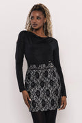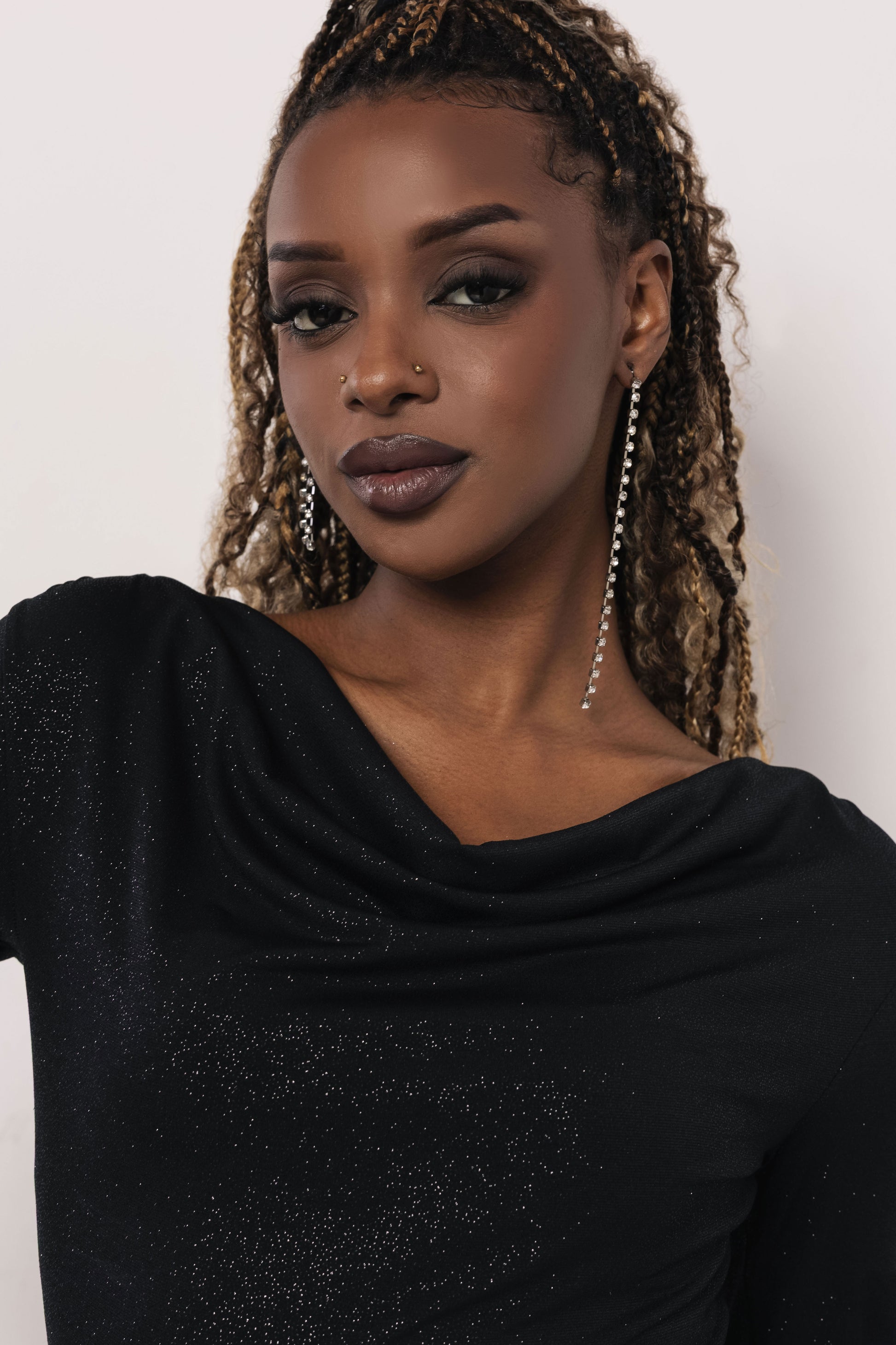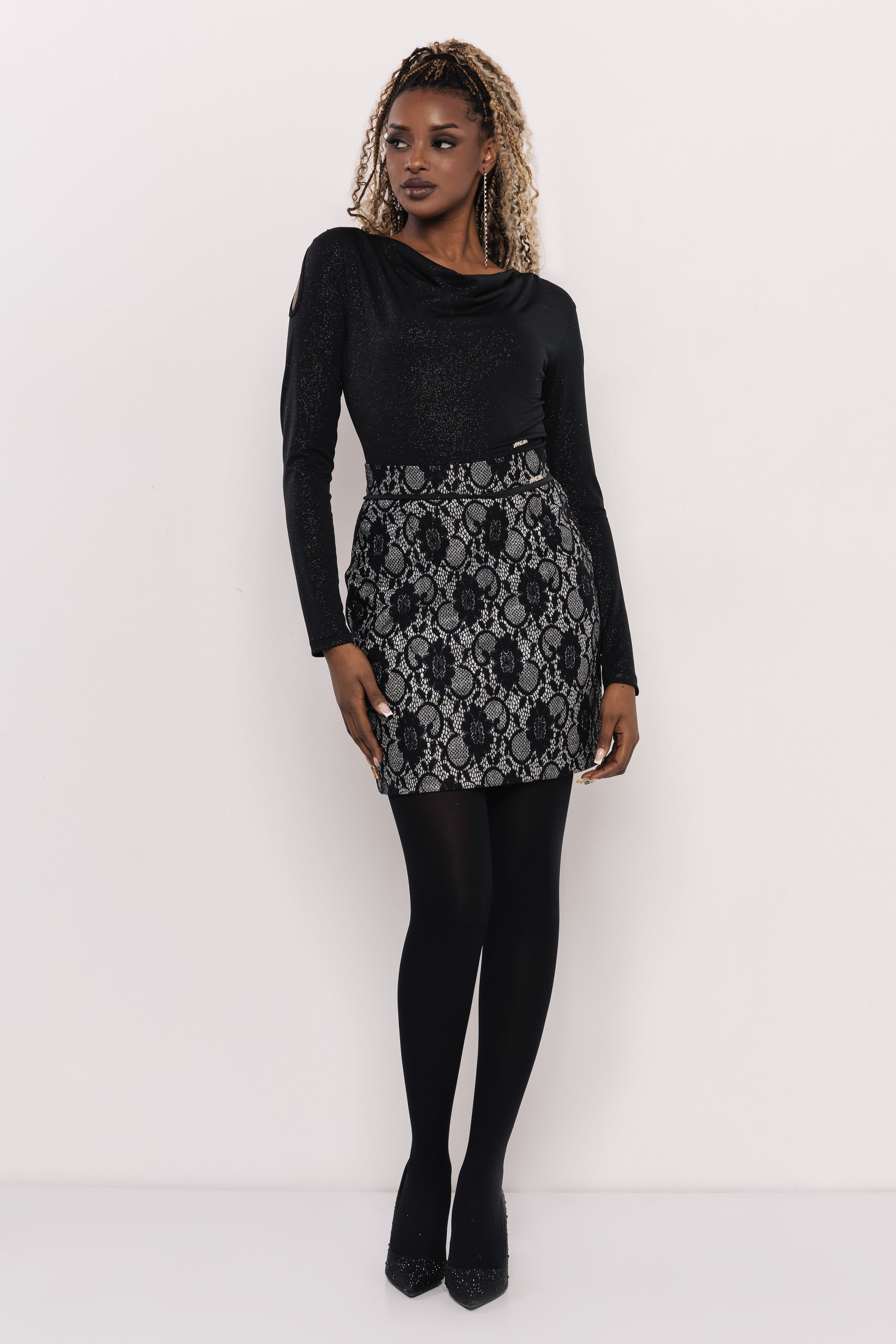 A fekete pti anyag könnyű, rugalmas és kellemes tapintású, így jól követi alakodat. Finom fényű felülete és a vállvonal modern kialakítása nőies, különleges megjelenést ad.