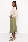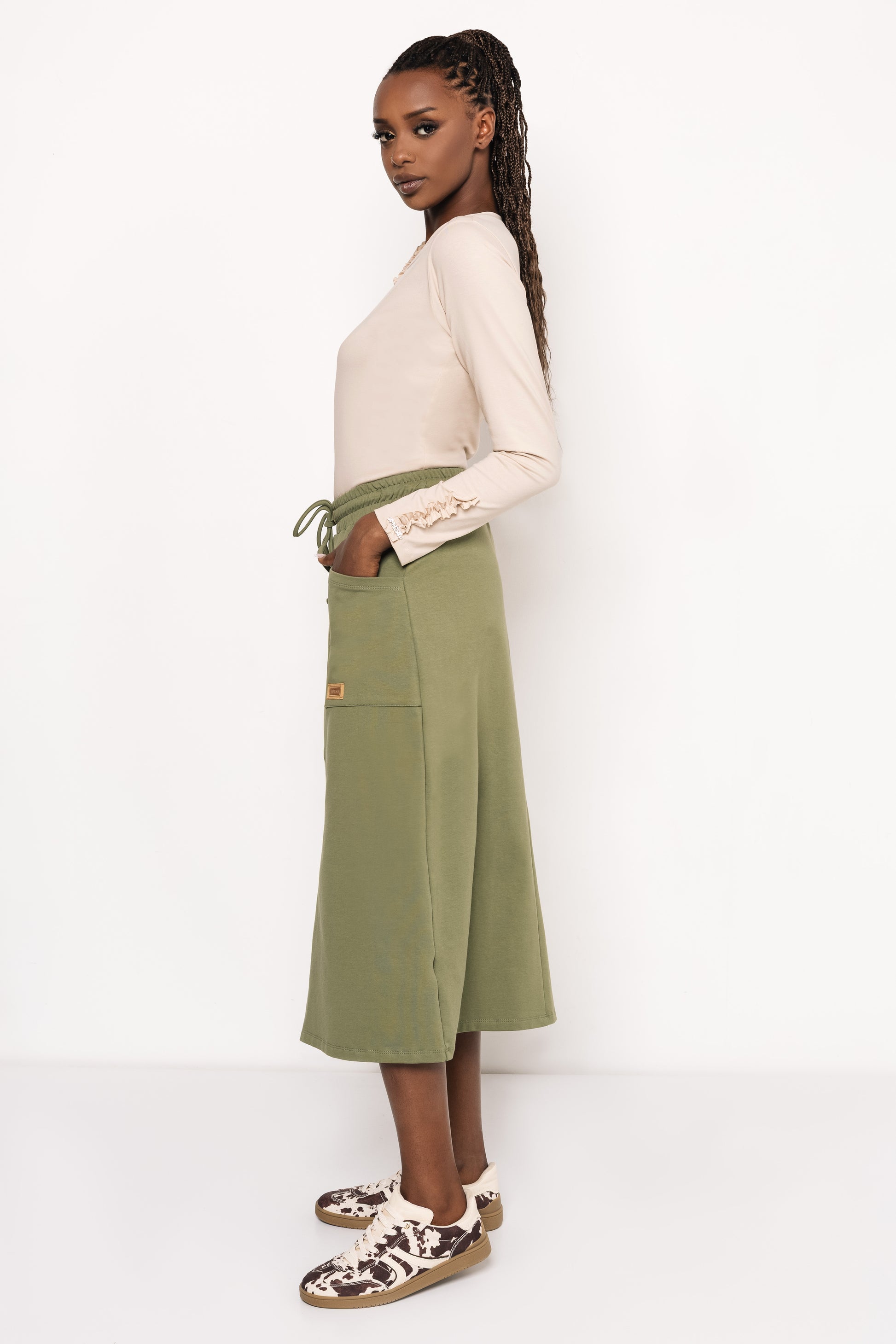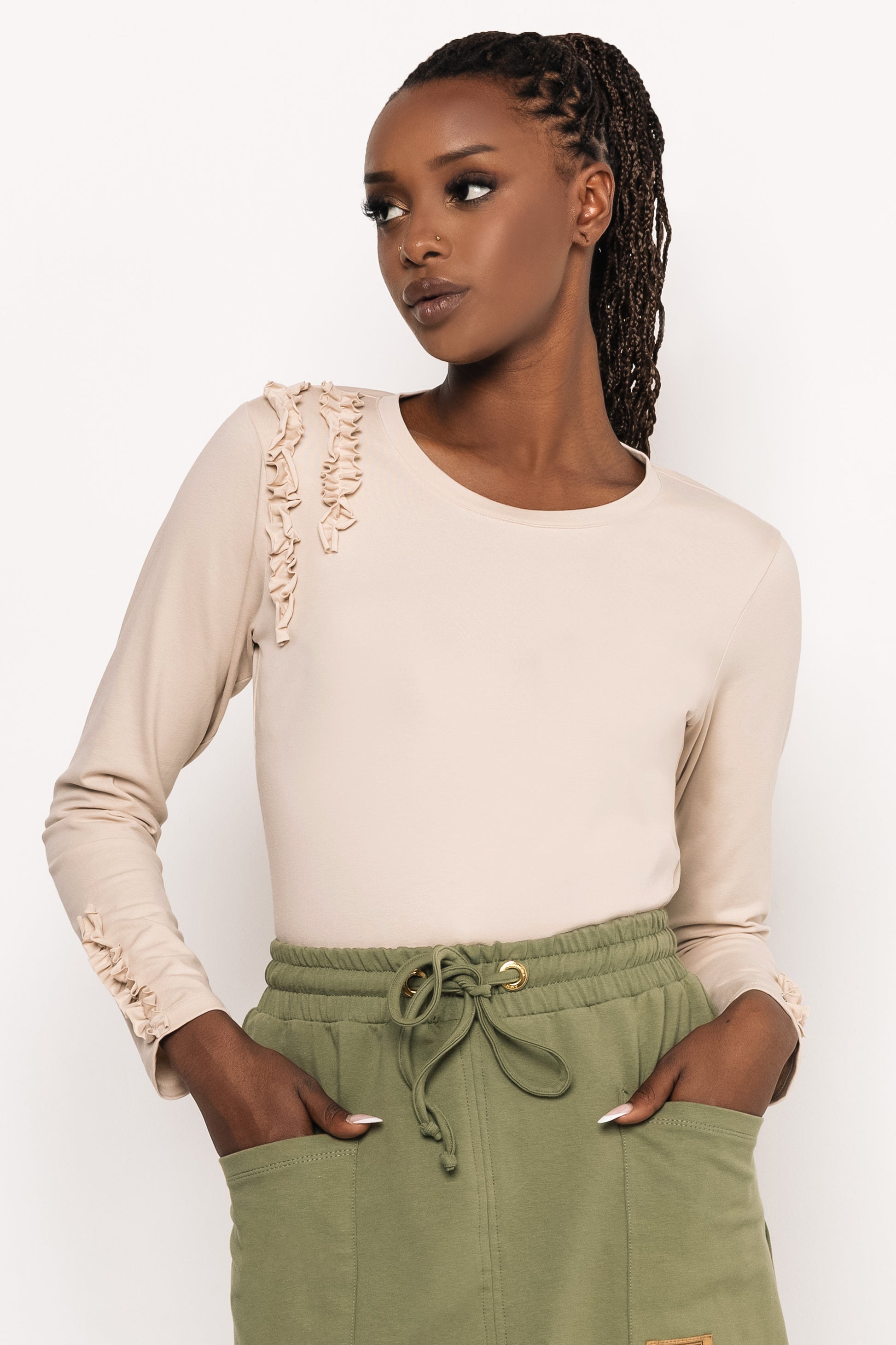 Az AMNESIA Calabri felső egy különleges darab, amely a pamut természetes komfortját ötvözi a nőies részletekkel. A hosszú ujjú, egyméretes fazont a vállnál és az ujjakon végigfutó díszített fodrok teszik igazán egyedivé, finom játékosságot csempészve a letisztult szabásba. A kerek nyakkivágás klasszikus megoldás, amely elegánsan keretezi a felsőrészt, miközben a letisztult vonalak minden testalkaton szépen mutatnak. A Calabri felső ekrü, vaj és kávé árnyalatban elérhető, így könnyen beilleszthető a mindennapi és az alkalmi szettekbe is. A természetes pamut anyag légáteresztő és kényelmes, ezért ideális választás hosszú napokra, amikor fontos a stílus és a komfort harmóniája. Viseld az AMNESIA Zila nadrággal vagy a Lazil szoknyával letisztult, nőies hatásért, de sportosabb összeállításban az AMNESIA Puato nadrággal is tökéletes választás. Az AMNESIA Calabri felsőt beszerezheted az amnesia.hu webshopon, amíg elérhető!