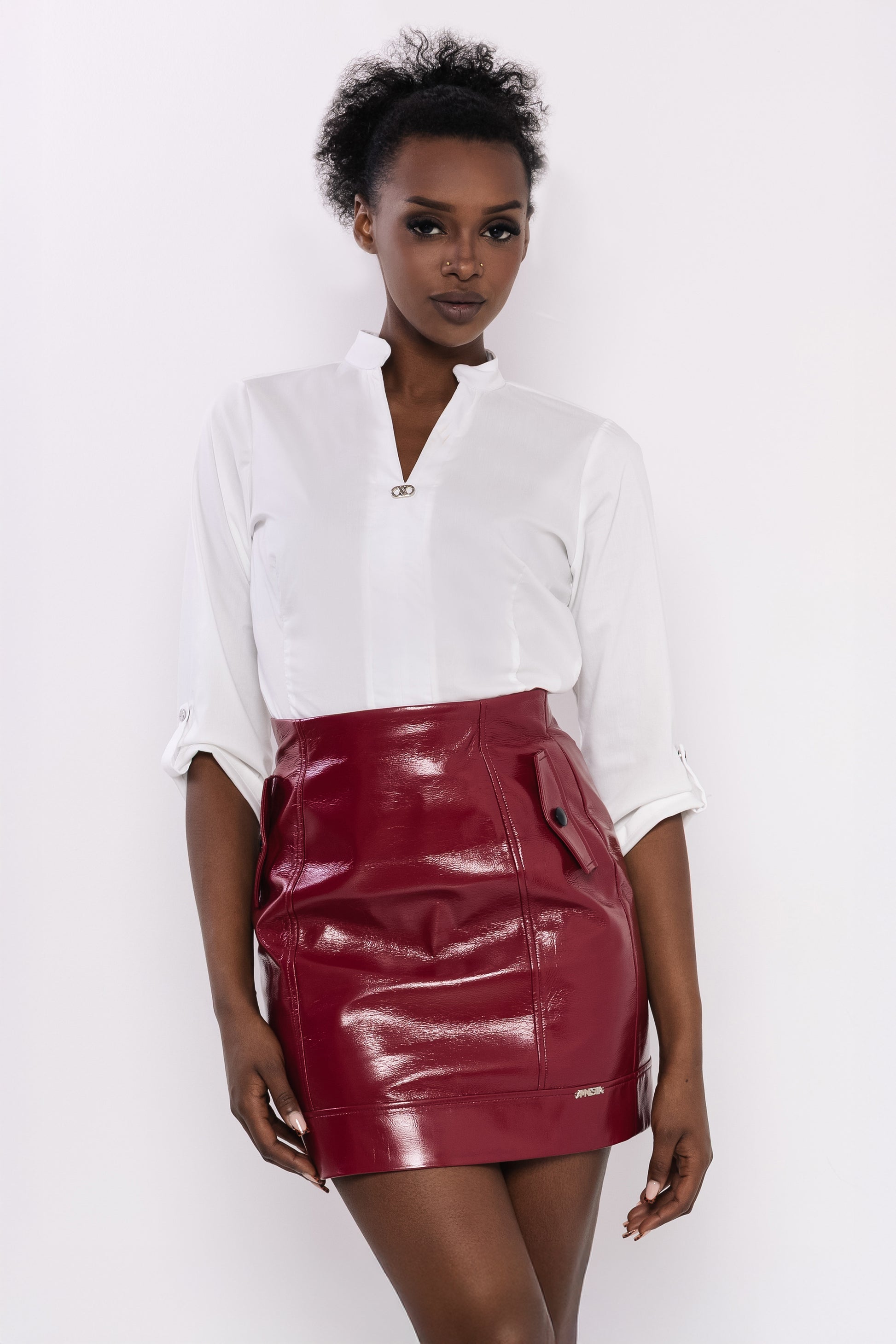 Az AMNESIA Cray szoknya a nőies erőt és a modern eleganciát ötvözi. Fényes lakk műbőr anyaga karakteres megjelenést ad, miközben az egyenes mini fazon és a díszített zsebfedők játékos részletei optikailag formálják az alakot. Derékrésze finoman követi a testet, így minden szögből előnyös.