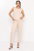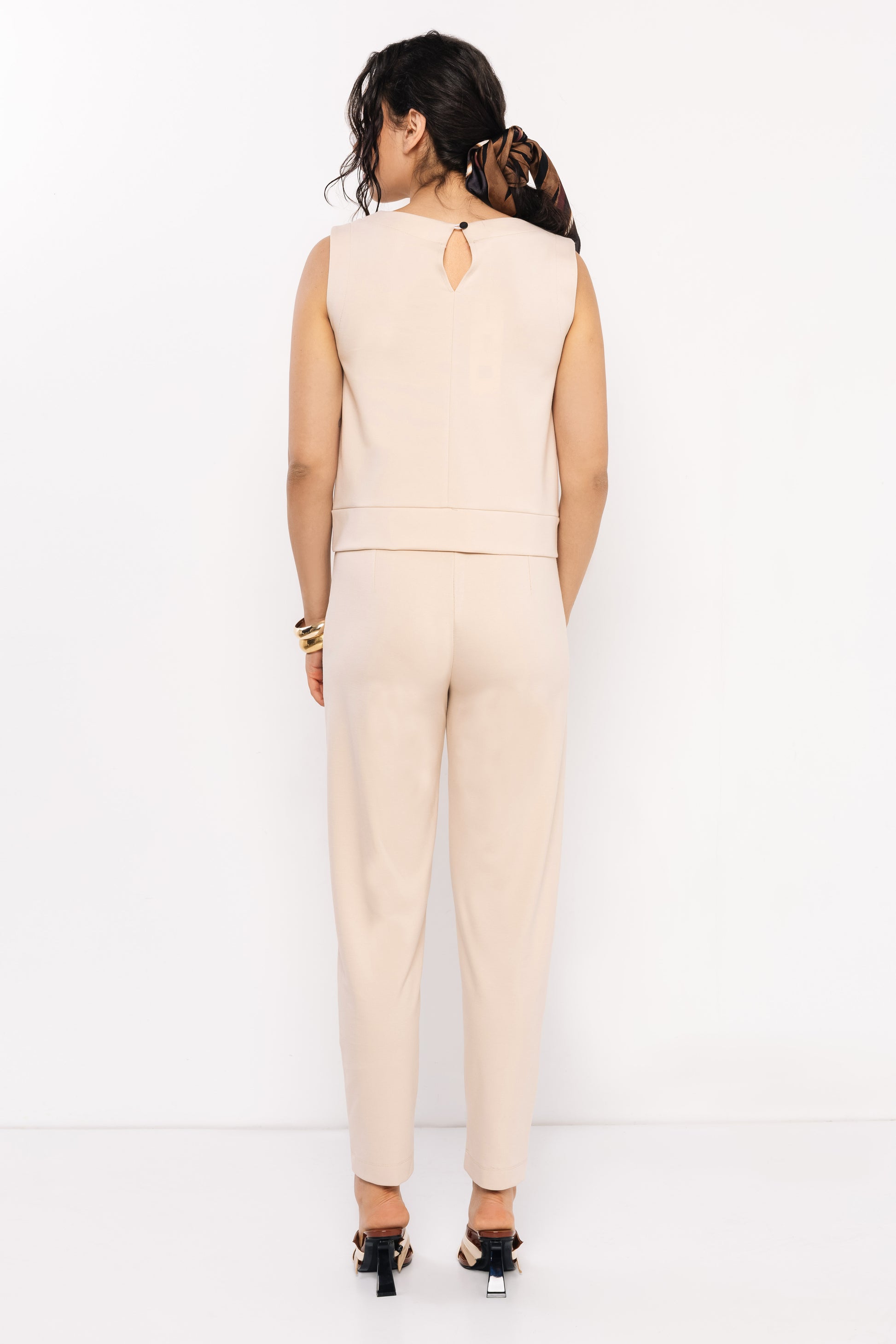 Az AMNESIA Dejen felső a letisztult, modern stílus egyik alapdarabja. Punto anyagának köszönhetően rugalmas, tartós és kényelmes viselet, amely tökéletesen illeszkedik a mindennapi öltözködésbe. Ujjatlan fazonja kiemeli a váll vonalát, hátul apró cseppkivágással és gombos záródással kapott finom, stílusos részletet. Fekete és bézs színben elérhető, S, M, L és XL méretben, így mindenki megtalálhatja a hozzá illőt. Elegáns és minimalista szabása könnyen kombinálható, különösen jól mutat a hozzáillő AMNESIA Jenci nadrággal szettben viselve – együtt modern, egységes és sikkes megjelenést alkotnak. Rendeld meg most az amnesia.hu webshopból, és fedezd fel a szett erejét!