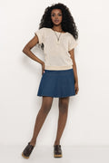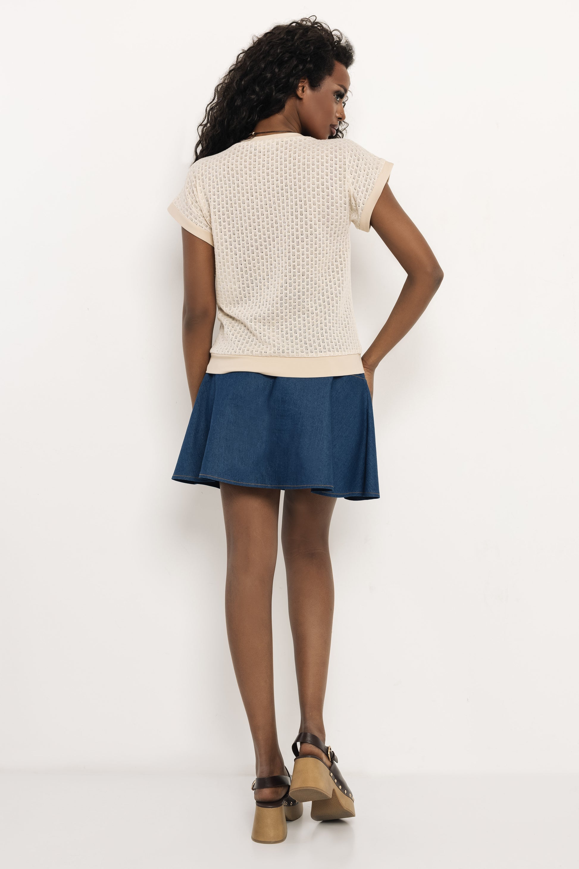 Az AMNESIA Dorja felső egy könnyed, nőies darab, amely áttört kötött mintájával teszi különlegessé a megjelenést. A rövid ujj és a letisztult fazon elegáns, természetes stílust ad, így tökéletes választás a mindennapi ruhatárba.