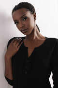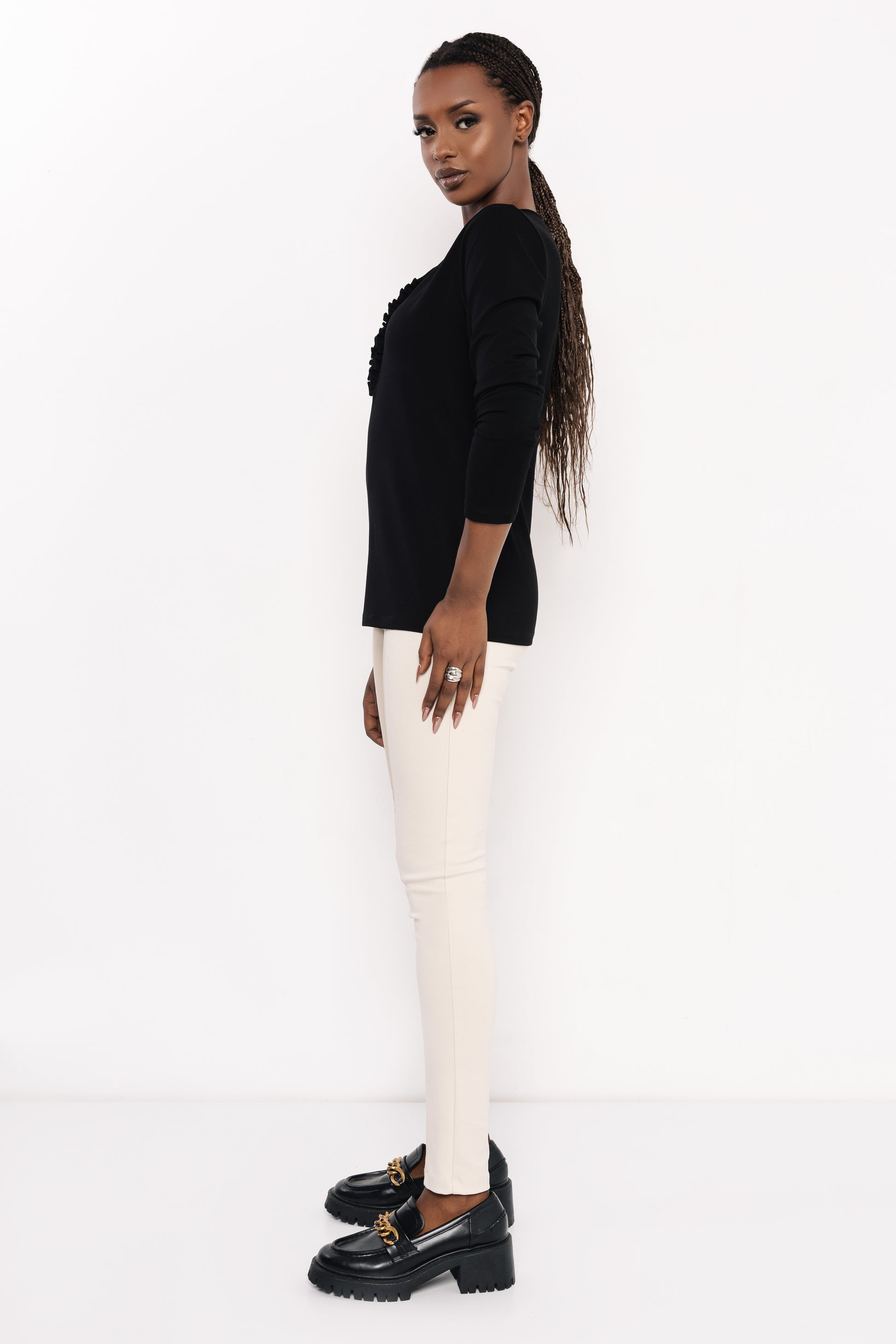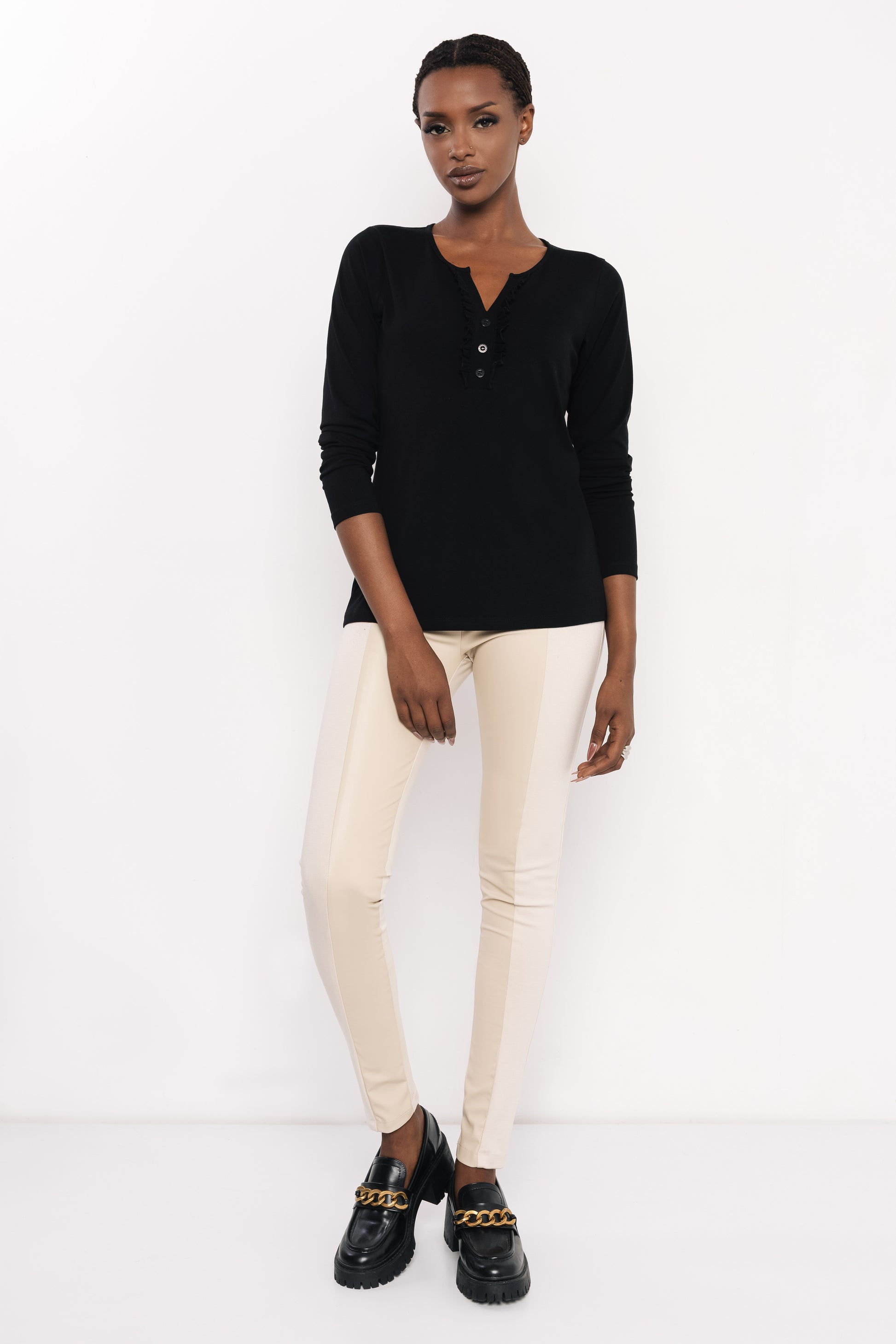 A felső ekrü, vaj és fekete színben érhető el, így többféle stílusban is hordható. A klasszikus szabás és a visszafogott díszítés miatt könnyen kombinálható elegáns nadrággal vagy szoknyával, de sportosabb összeállításban, farmerrel és sneakerekkel is remekül mutat. Ez az a darab, amely egyszerre hozza el az elegancia és a lezser stílus előnyeit.
