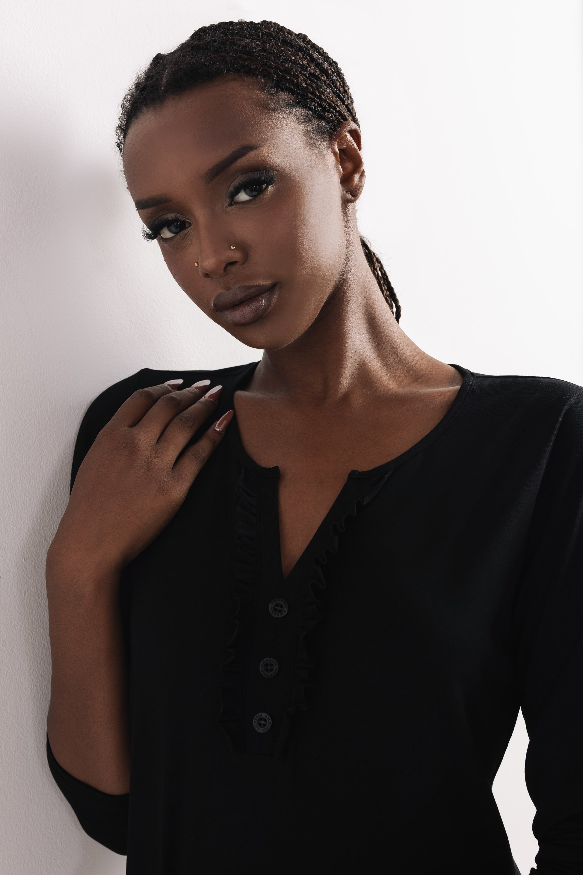 Az AMNESIA Gemi felső letisztult, nőies alapdarab, amely bármely ruhatárba könnyedén beilleszthető. Pamut anyaga kellemes tapintású és komfortos viseletet nyújt, így egész nap ideális választás. Az egyméretes fazon kényelmesen követi a test vonalát, a V-kivágás mentén futó fodros díszítés pedig finom, elegáns részletet kölcsönöz a darabnak.