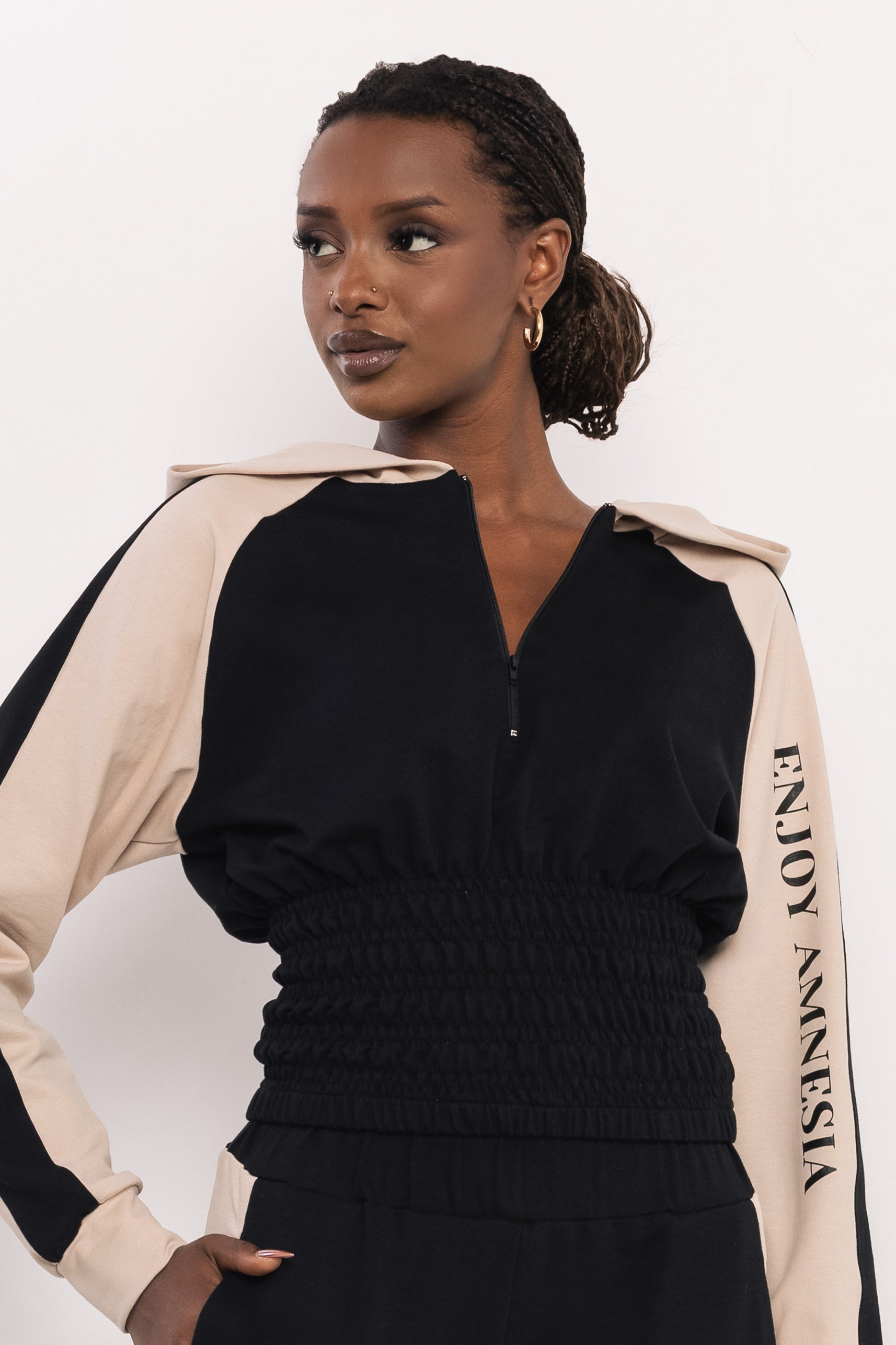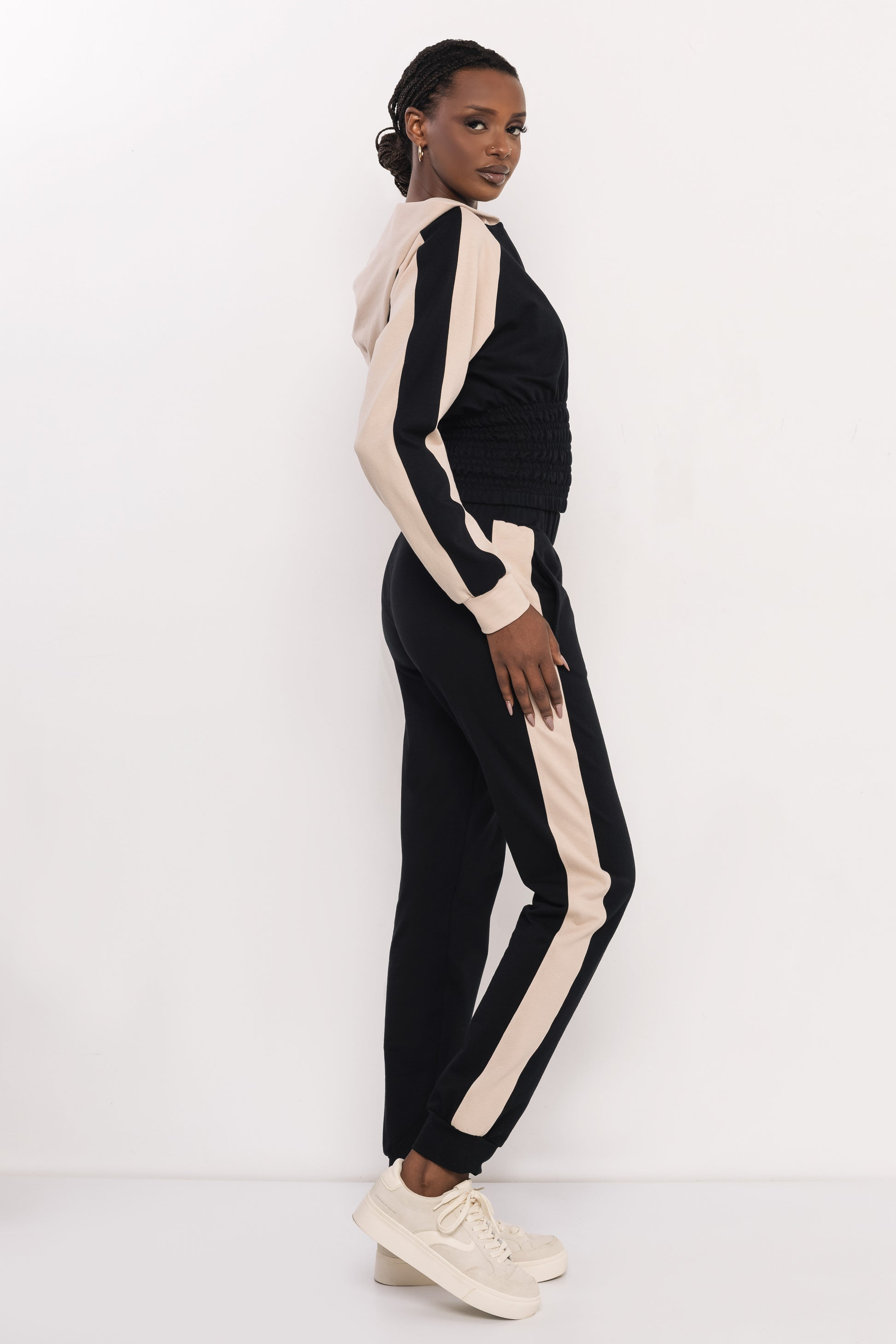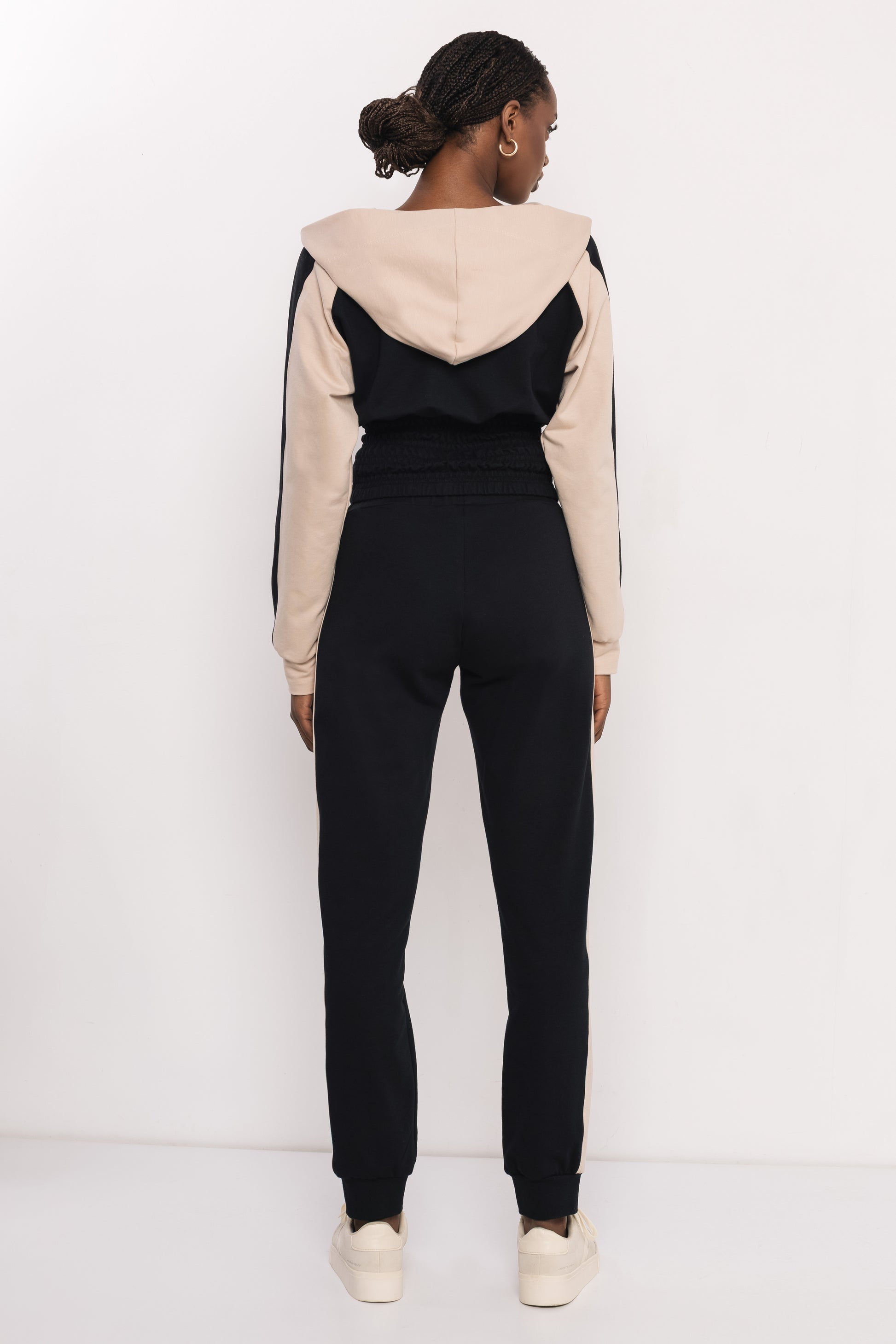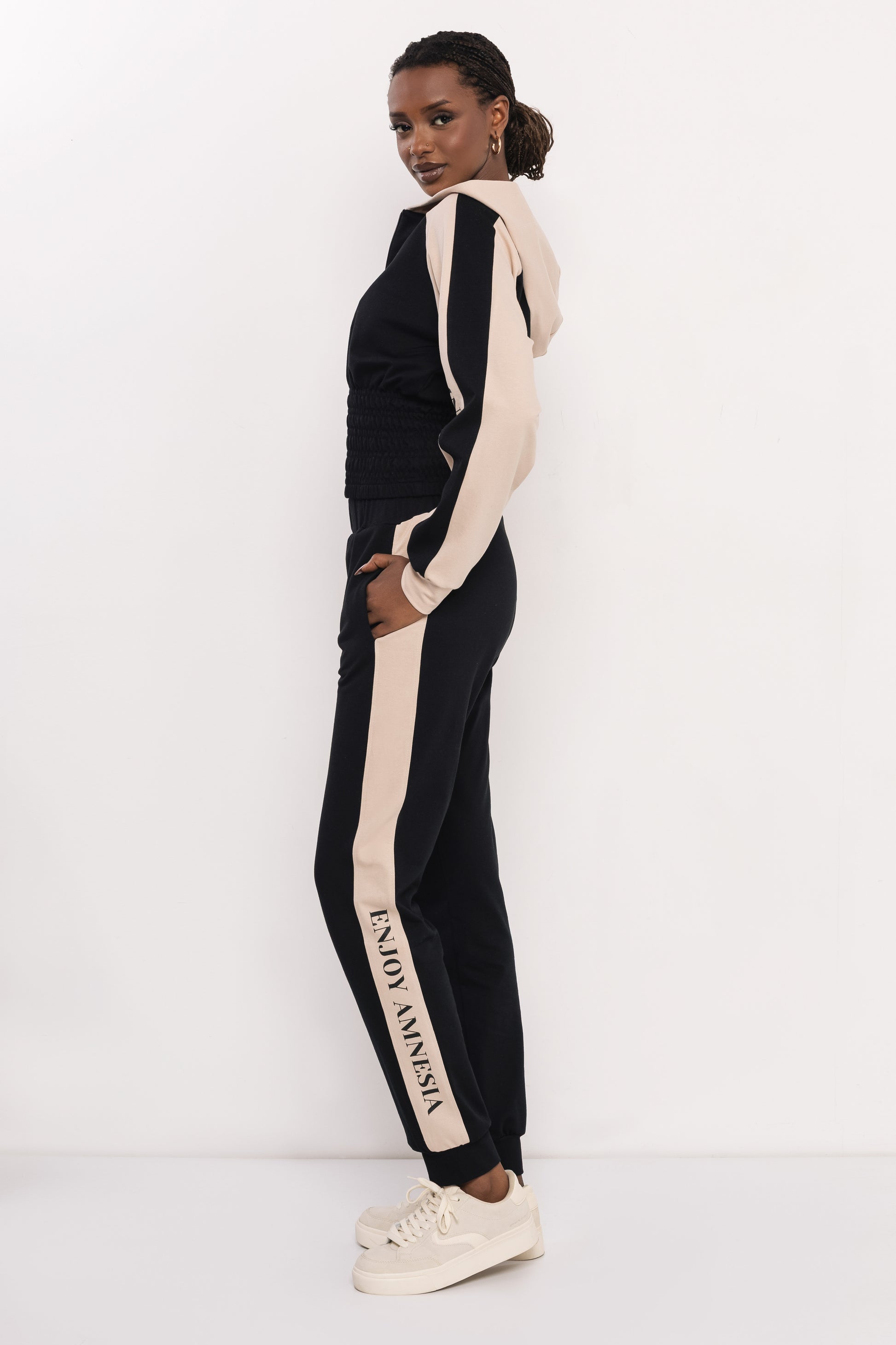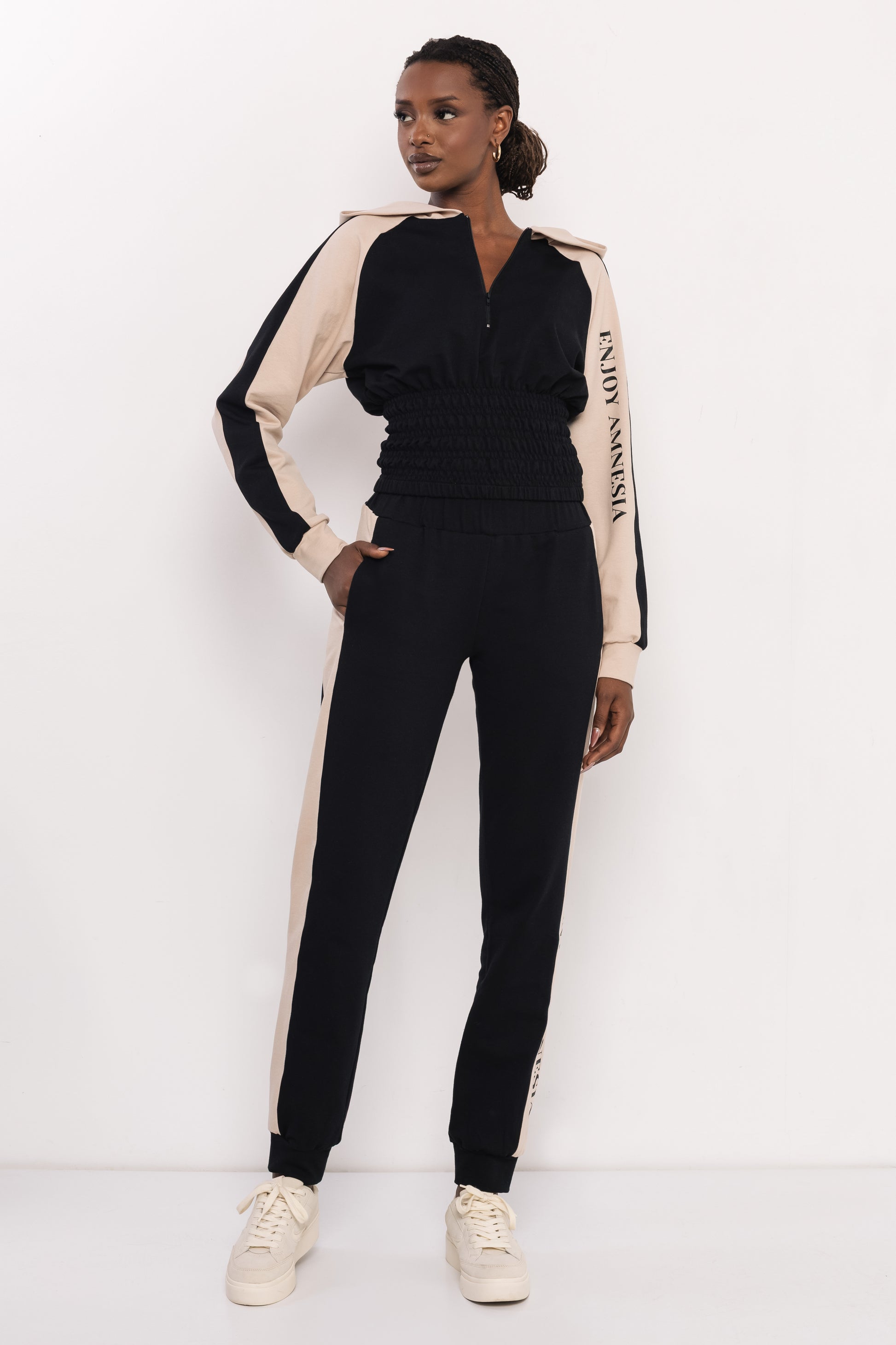 Az AMNESIA Glemma jogging szett egyszerre kényelmes és trendi választás a mindennapokra. A fekete alapon bézs betétekkel kombinált dizájn modern, sportos hatást kelt, miközben nőies lookot ad. A kapucnis felső és a letisztult nadrág tökéletes összhangban alkot teljes szettet. Futter anyagból készült, amely puhaságával és tartósságával biztosítja a komfortérzetet egész nap. A derékrészen található gumírozott betoldás optikailag karcsúsít, a cipzáras felső pedig könnyen variálható, akár lazább, akár sportosabb stylingot szeretnél. Az ujjon futó „ENJOY AMNESIA” felirat pedig különleges részletként dobja fel a szettet. Viseld edzőcipővel vagy bakancsokkal, és élvezd, hogy a praktikum és a stílus most egyben lehet a tiéd. Tedd a kosaradba az AMNESIA Glemma jogging szettet az amnesia.hu webshopon, és frissítsd fel vele a hétköznapi ruhatárad!