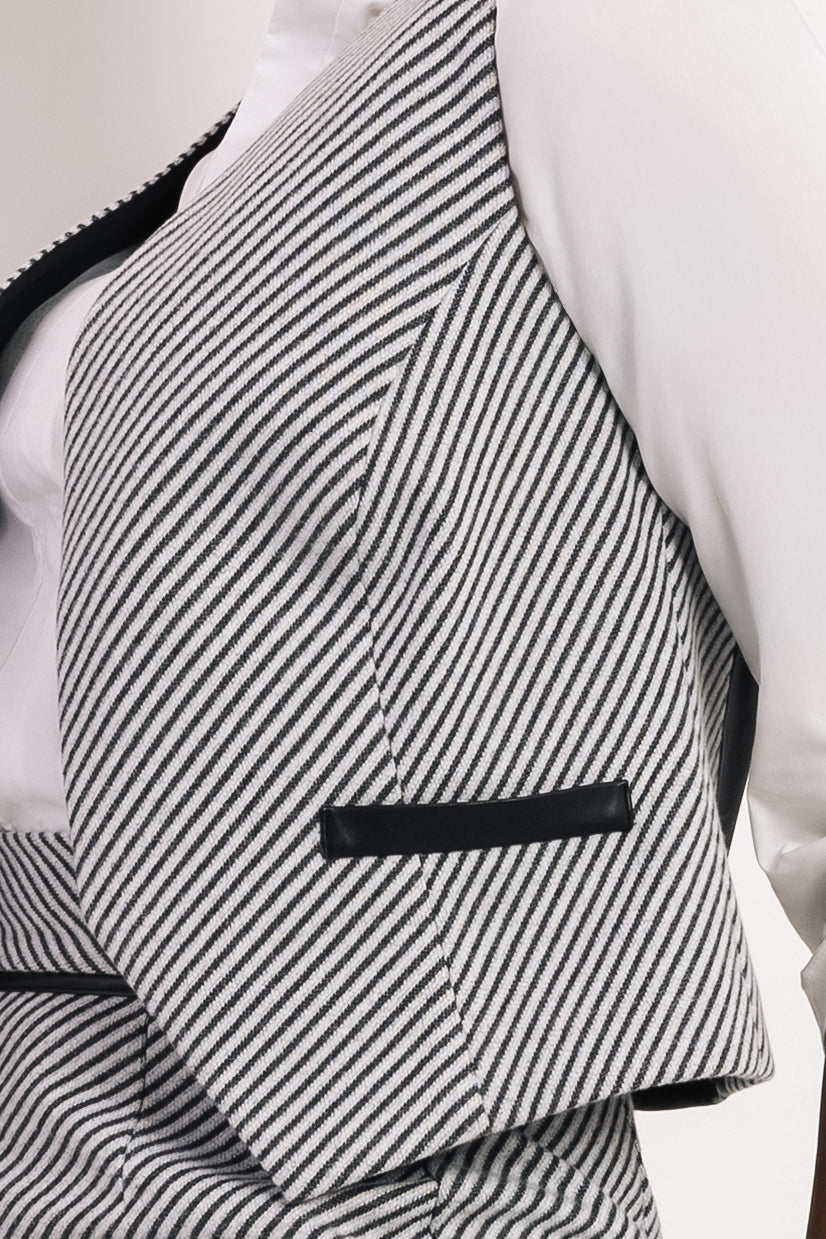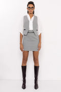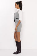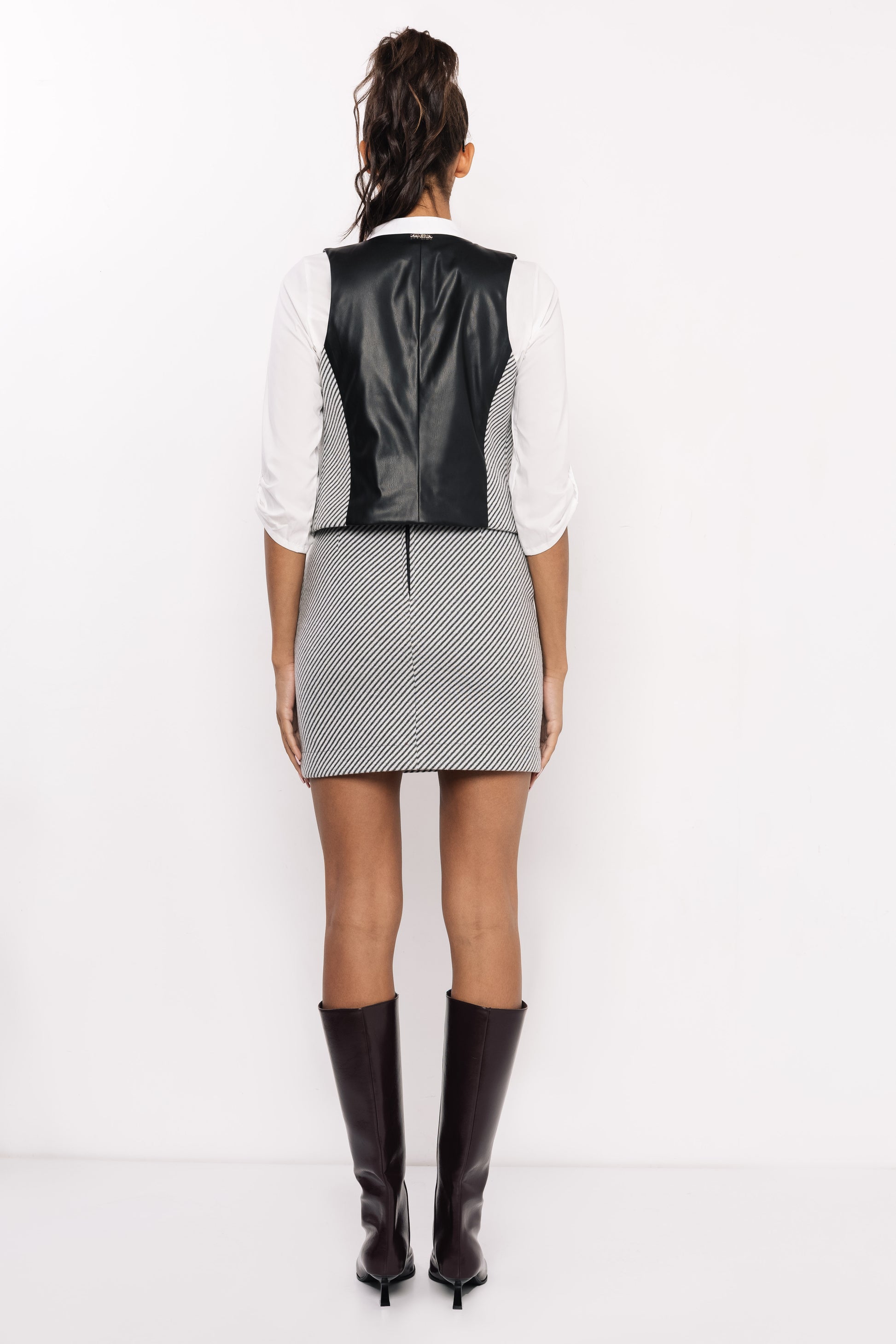 Az AMNESIA Hinsz mellény a modern elegancia újragondolt darabja: elöl klasszikus szövetből készült, hátul pedig műbőr betét adja meg a letisztult, mégis karakteres kontrasztot. A V-kivágás és a karcsúsított fazon optikailag nyújtja a sziluettet, miközben a rövidített hossz tökéletesen kiemeli a derékvonalat. A szürke-fekete csíkos minta játékosságát a letisztult vonalvezetés ellensúlyozza, így egyszerre hordható irodai környezetben vagy trendi hétköznapi szettben is. Az AMNESIA Kori szoknyával együtt tökéletes szettet alkot, de más alapdarabokkal kombinálva is stílusos választás. Ha igazán különleges, mégis sokoldalú mellényt keresel, ami minden megjelenést feldob, kattints és csapj le az AMNESIA Hinsz mellényre az amnesia.hu webshopon!