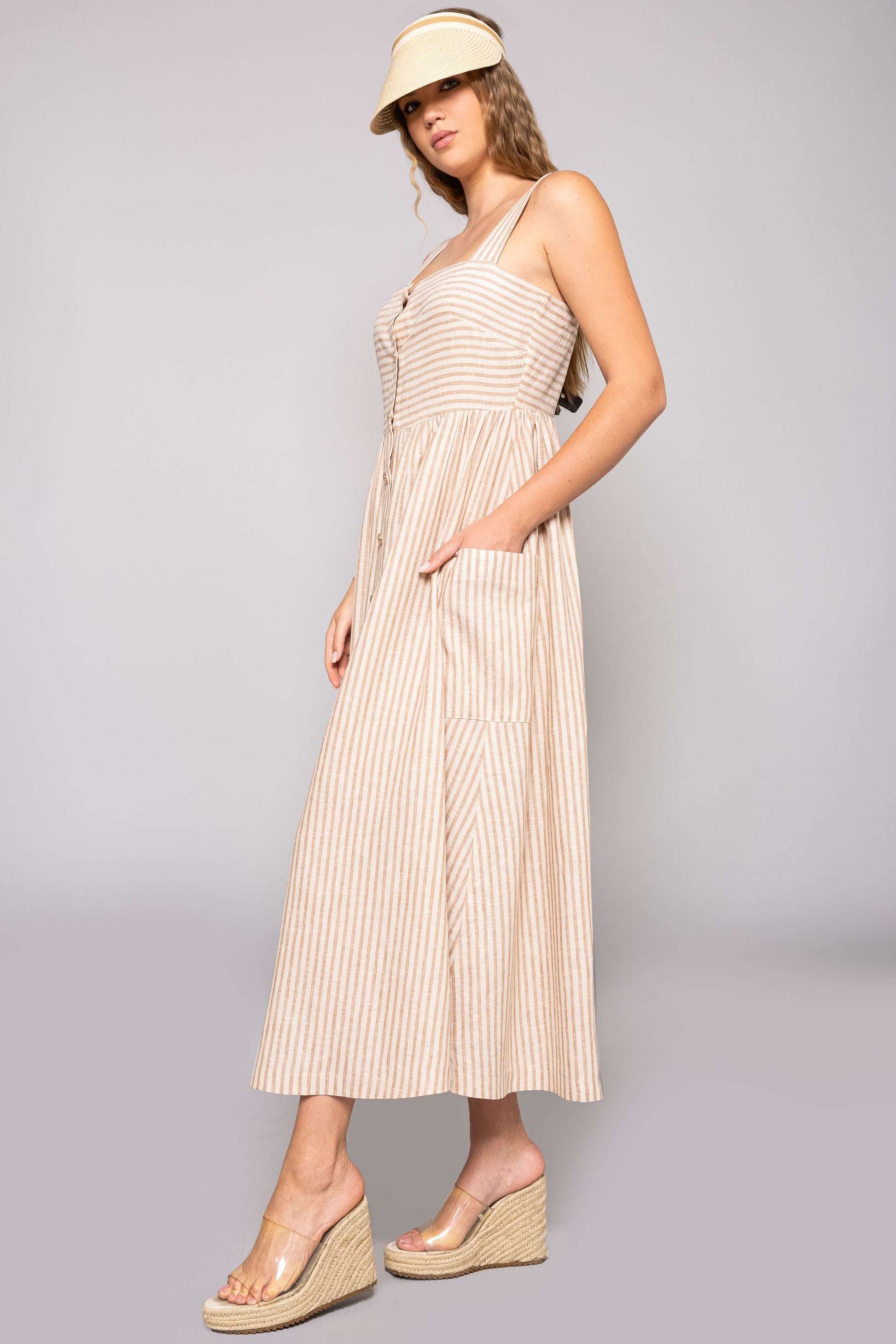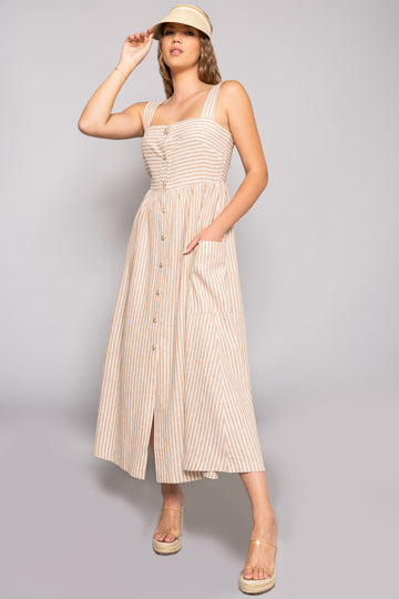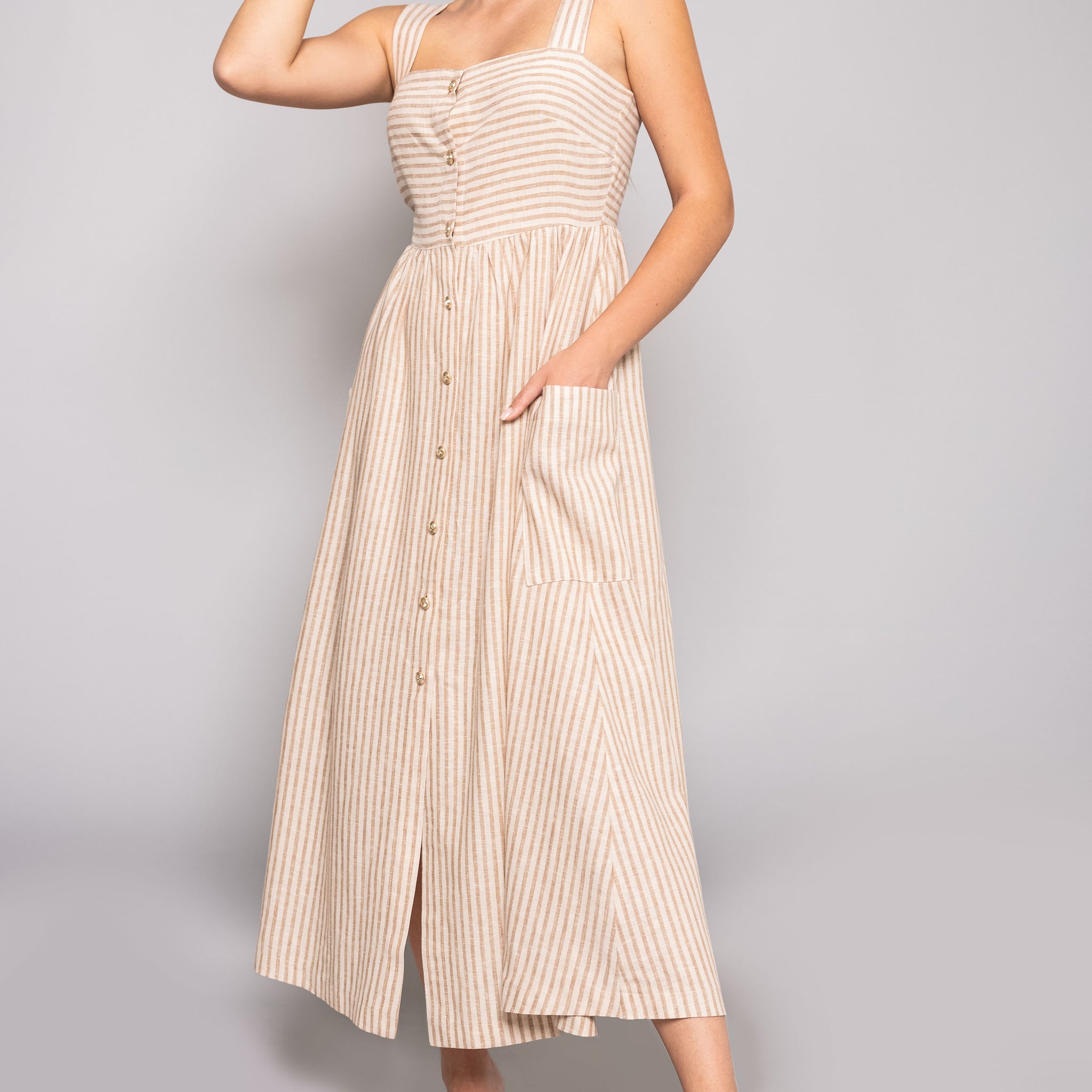 Nőies ruha rohanós hétköznapokra: az AMNESIA Isian ruha len anyagával és csíkos mintájával jó választás az alapgardróbodba. Fekete és bézs változata egyaránt sokoldalú és változatosan viselhető darabok, a kedvenc kiegészítőiddel pedig könnyedén a stílusodhoz alakíthatod őket.