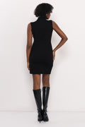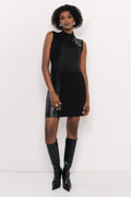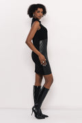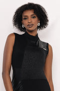 Az AMNESIA Ittek ruha modern darab, amelyben a kötött, a műbőr és finoman csillogó panelbetétek tökéletes egységet alkotnak. Ez a kombináció különleges, mégis letisztult megjelenést ad. Az ujjatlan, állógalléros fazonú ruha, amely a mellrészen és az oldalsó paneleken játékosan váltogatja az anyagokat igazi must-have választás. A felső részen lévő csillogó panel és a műbőr részletek optikailag karcsúsítják a felsőtestet, a punto anyag pedig kényelmesen, enyhén rugalmasan követi a vonalakat. Az egyméretes kialakítás miatt többféle alkaton szépen simul a testre, miközben megtartja a strukturált, rendezett formát. Viseld hosszú szárú csizmával, ahogy a modellen látod, vagy párosítsd elegáns bokacsizmával és egy hosszú kabáttal. Fedezd fel az amnesia.hu webshopon, és lépj ki a tömegből!