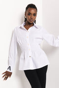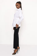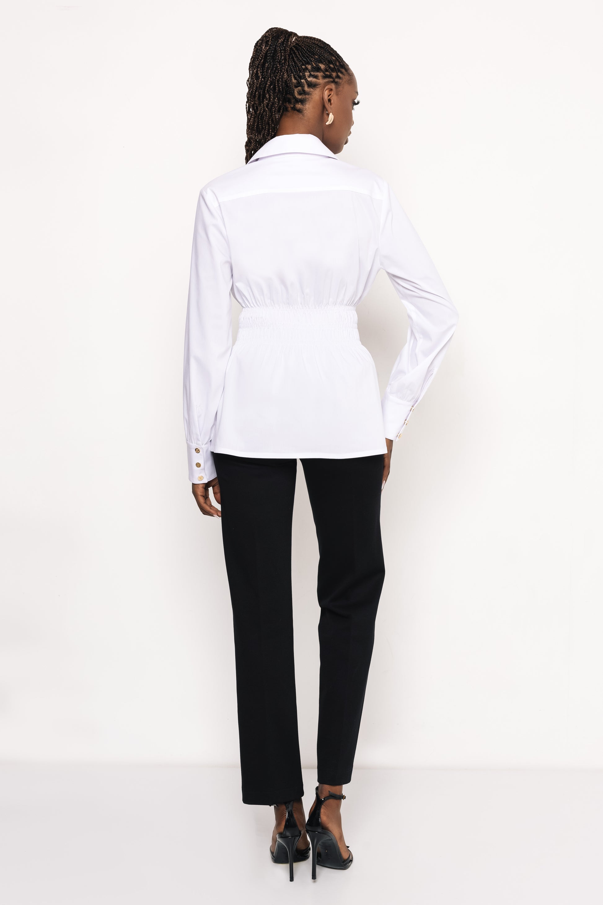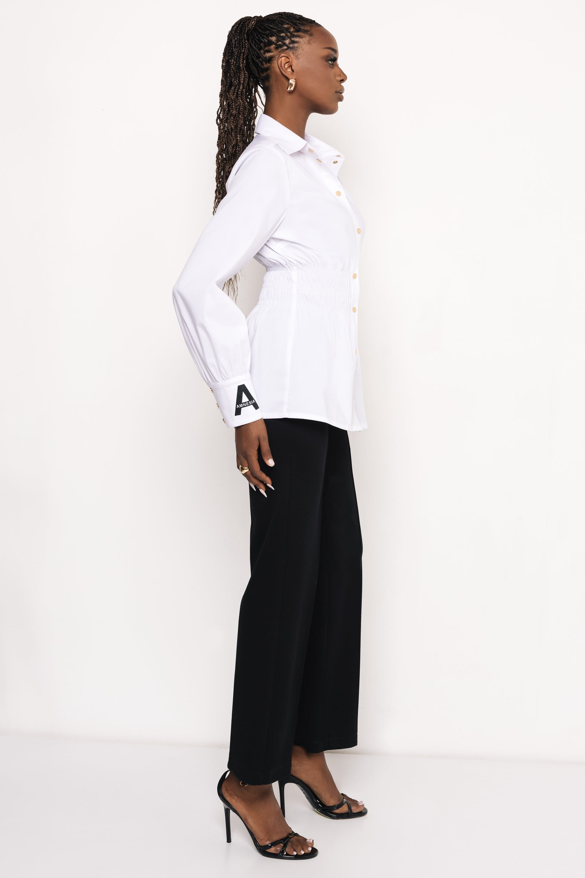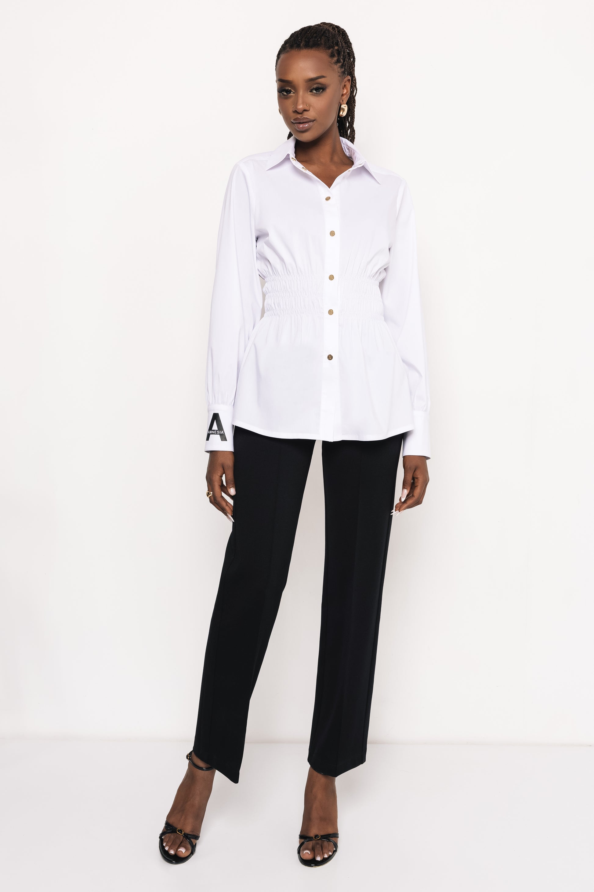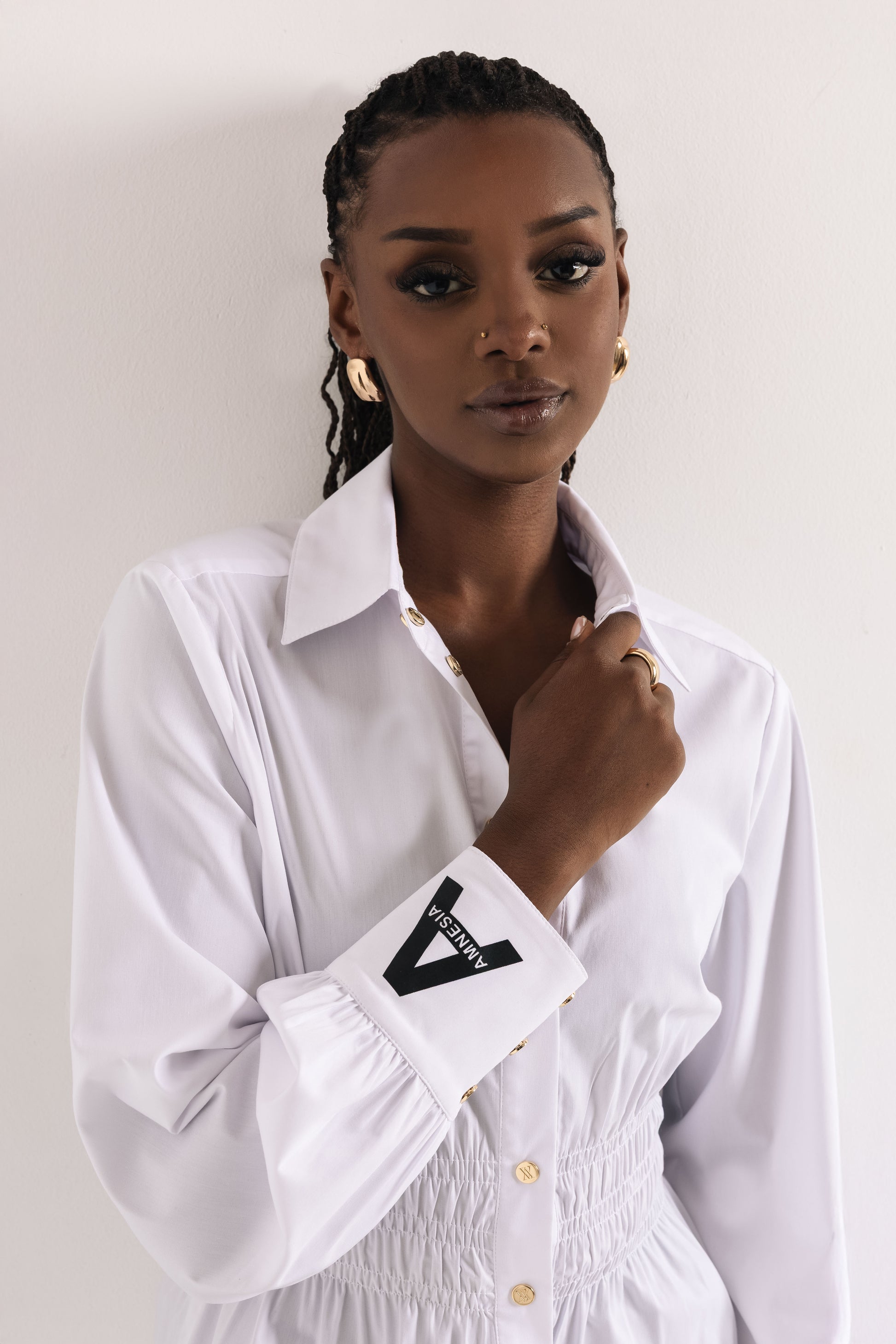 Az AMNESIA Leni blúz a klasszikus fehér ing modern, nőies újragondolása, amely a puplin anyagnak köszönhetően letisztult és elegáns hatást kelt. A fazon különlegessége a derekán elhelyezett gumírozott rész, amely finoman hangsúlyozza az alakot, miközben kényelmes viseletet biztosít a mindennapokban és különleges alkalmakon is. A klasszikus inggallér és a mandzsettákon elhelyezett kontrasztos AMNESIA logó fiatalos, trendi karaktert adnak ennek az időtlen darabnak.